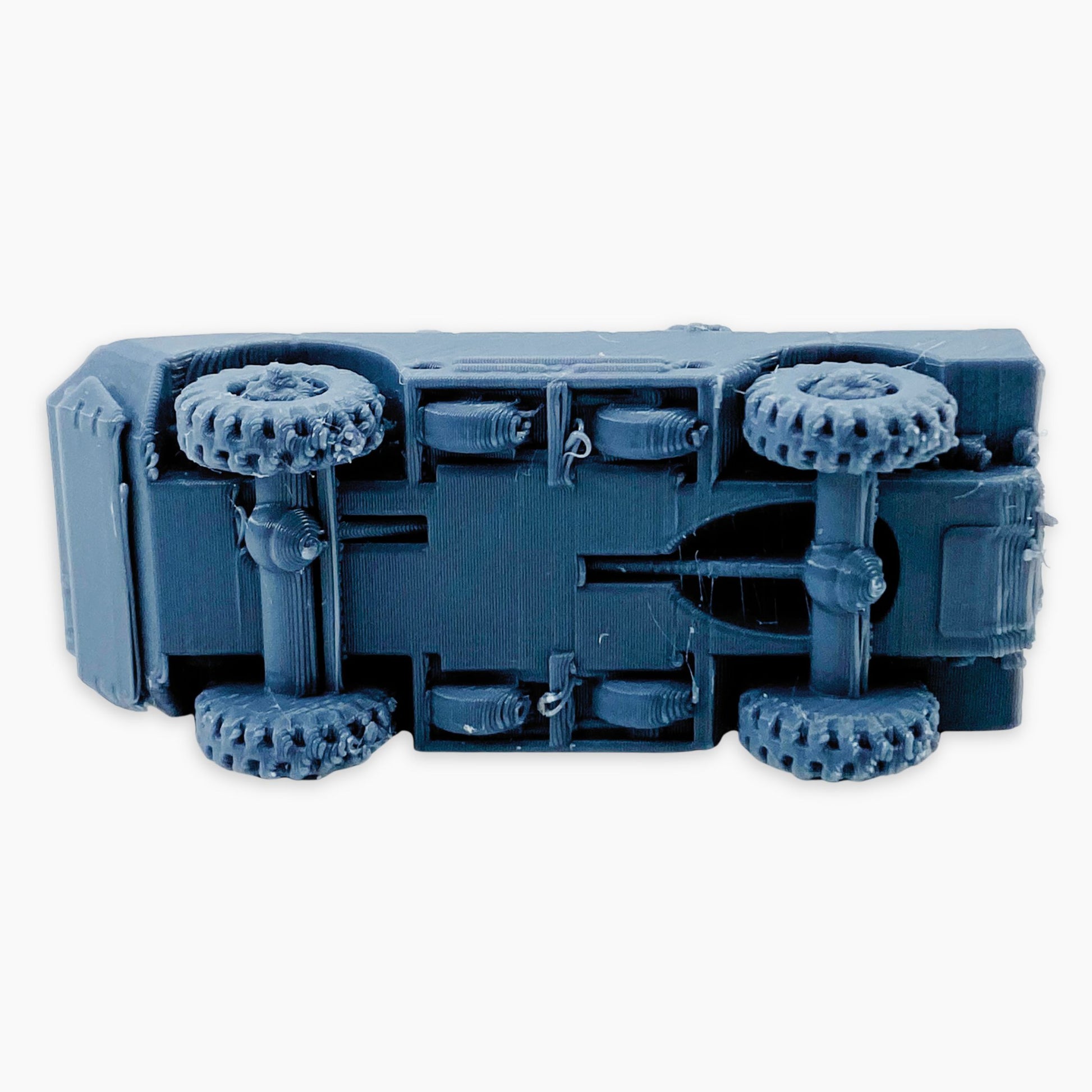 BRDM-2UM miniature, a Soviet command and support variant of the BRDM-2 armored reconnaissance vehicle. This version features additional communication equipment and interior modifications for command and control roles. Maintains the amphibious capability, 4x4 mobility, and low-profile design of the standard BRDM-2 chassis. Used to coordinate reconnaissance, mechanized, and anti-tank units on the battlefield. Served with Soviet, Warsaw Pact, and allied forces during the Cold War and in post-Cold War conflicts.