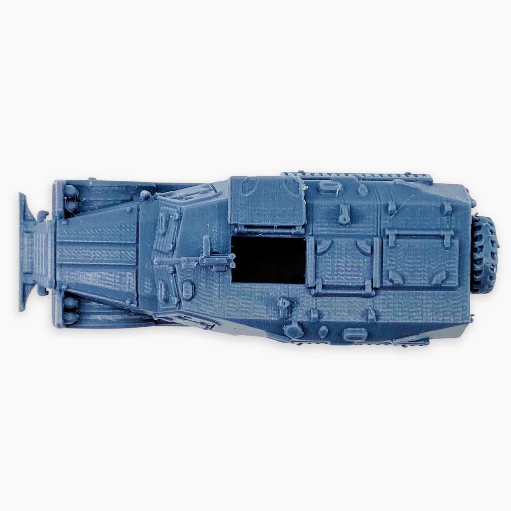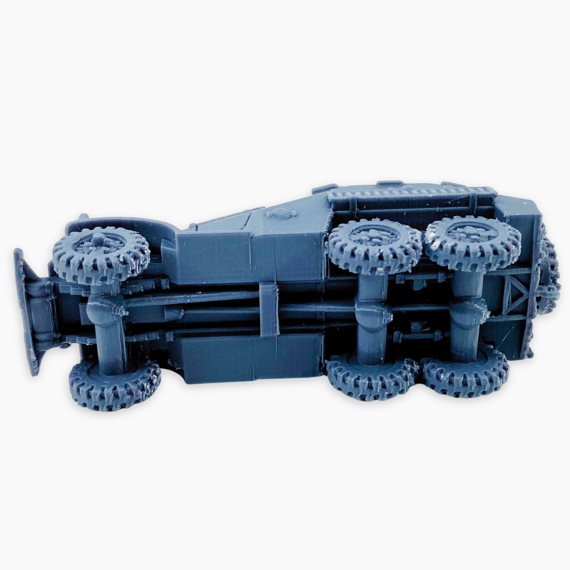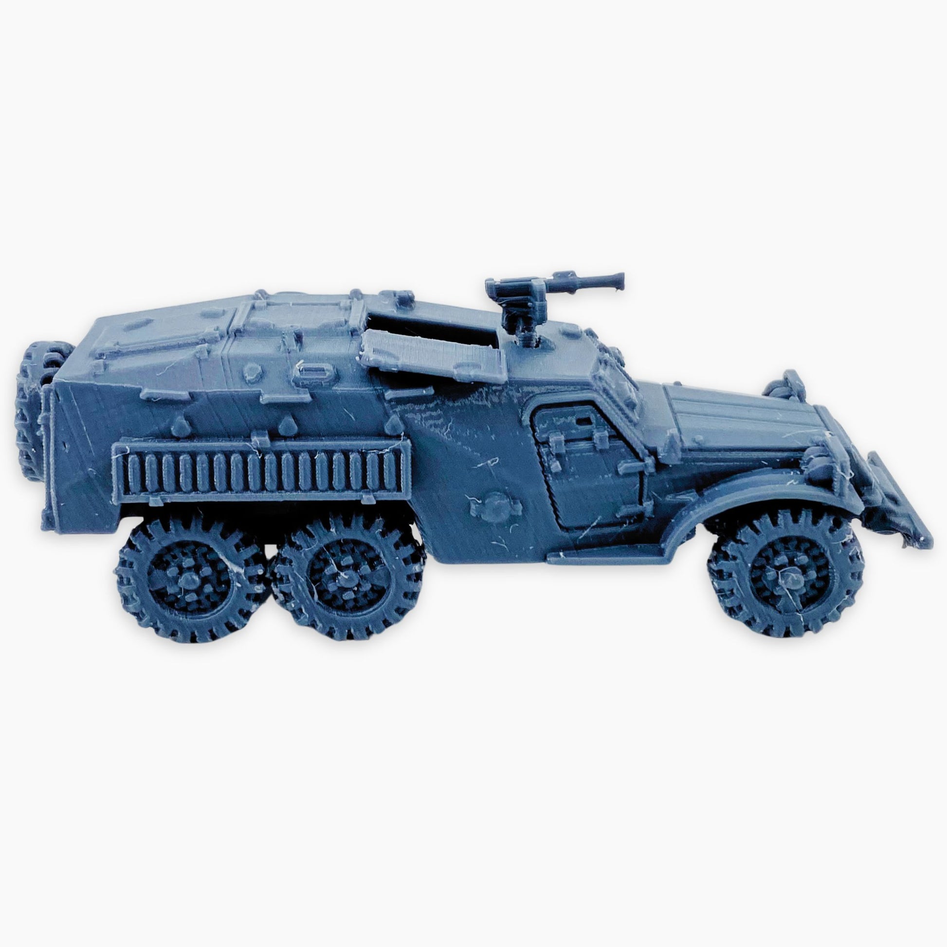 BTR-152K (mg sand channel) miniature, depicting the Soviet 6×6 armored personnel carrier in its late enclosed-roof configuration, fitted with both a mounted machine gun and externally mounted sand channels. Introduced in the early 1960s, the BTR-152K improved on earlier models by adding an armored roof with hatches for safer crew access, while retaining its ability to transport 13–17 soldiers. The machine gun provided added firepower against infantry and light vehicles, while the sand channels reflected a practical adaptation for desert and rough terrain operations. Used by the Soviet Army, Warsaw Pact allies, and widely exported, this version combines mobility, protection, and fire support. Perfect for Cold War–era dioramas, wargaming scenery, or historical vehicle collections in multiple scales.