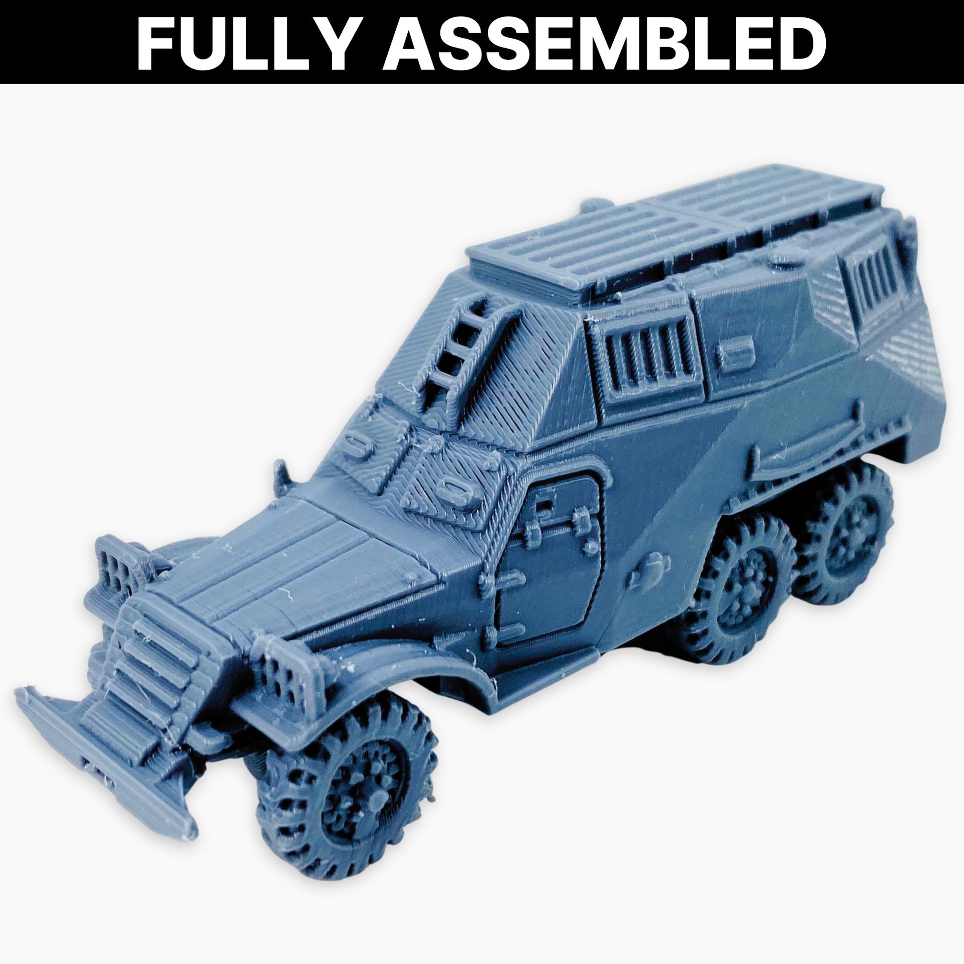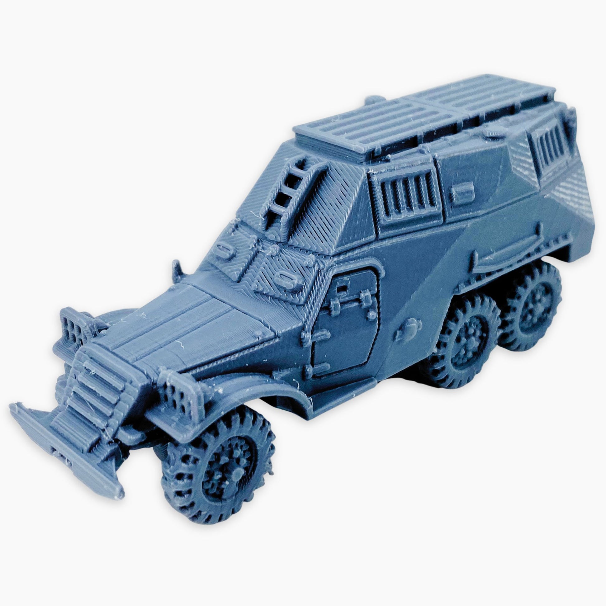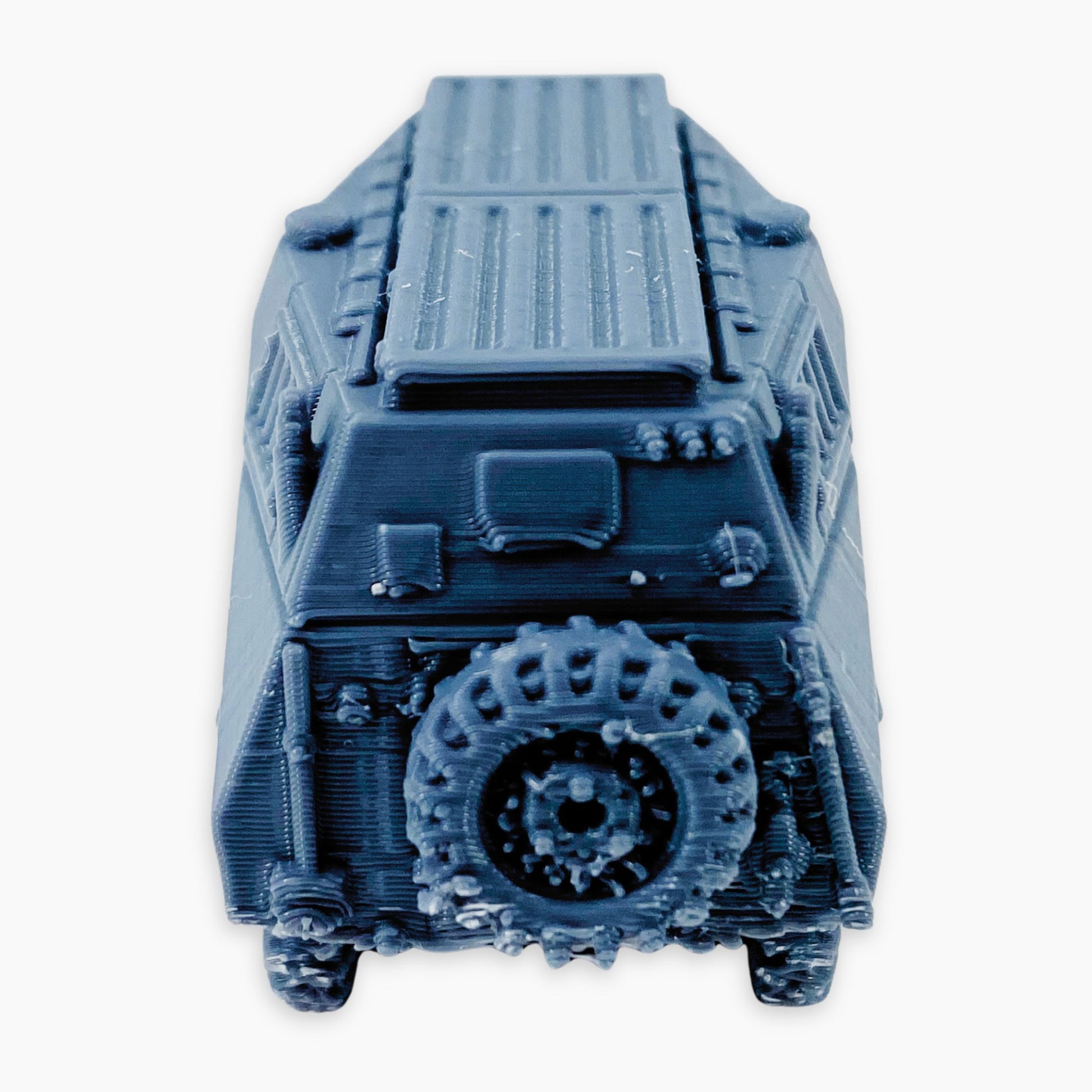 BTR-152S miniature, representing the late variant of the Soviet 6×6 armored personnel carrier equipped with full NBC (nuclear, biological, chemical) protection. Introduced in the late 1950s, the BTR-152S featured an enclosed roof with overpressure and filtration systems to protect the crew and passengers in contaminated environments. Like earlier BTR-152 versions, it could carry up to 18 infantrymen and was armed with one or more machine guns for defensive fire. Rugged, spacious, and widely exported, the BTR-152S served with Soviet and Warsaw Pact forces as well as many allied nations during the Cold War. This model is a distinctive addition for Cold War–era dioramas, wargaming scenery, or historical vehicle collections in multiple scales.