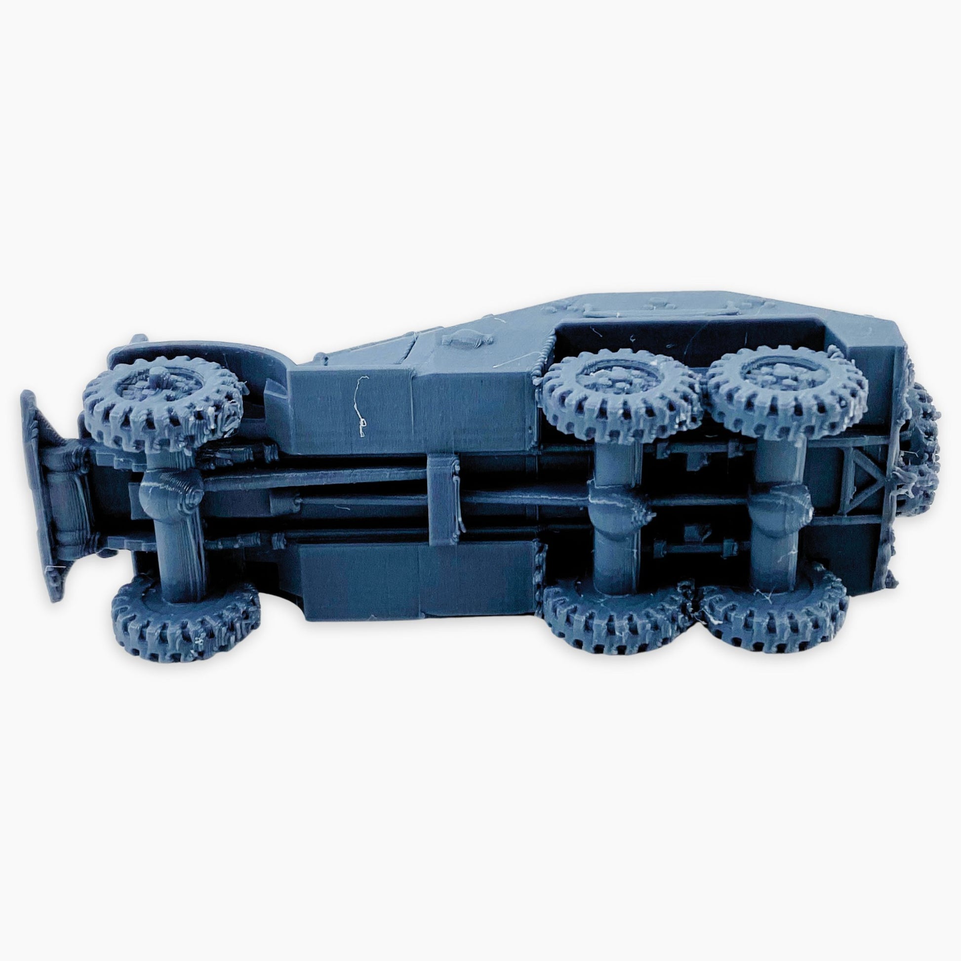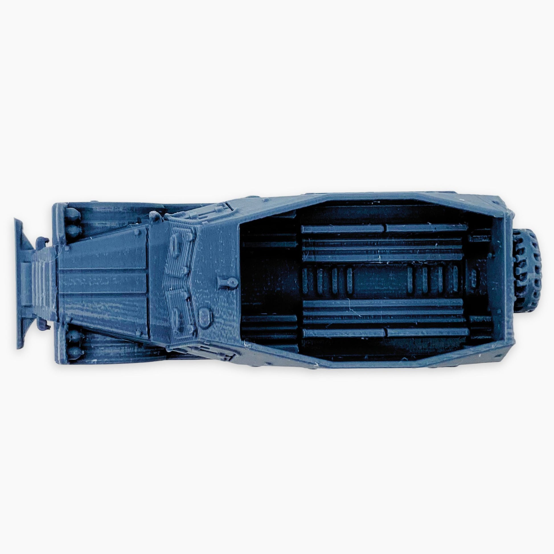 BTR-152v3 miniature, representing one of the later modernized versions of the Soviet 6×6 armored personnel carrier introduced in the early 1960s. The v3 variant was fitted with a central tire inflation system (CTIS), allowing the crew to adjust tire pressure from inside the vehicle for better mobility in mud, sand, or snow. It also featured an armored roof with hatches, giving improved protection compared to earlier open-topped versions, while still carrying up to 13–17 soldiers. Lightly armed, typically with a machine gun, it was widely used by Soviet and Warsaw Pact forces and exported to allied nations during the Cold War. This model is a distinctive choice for Cold War–era dioramas, wargaming scenery, or military vehicle collections in multiple scales.