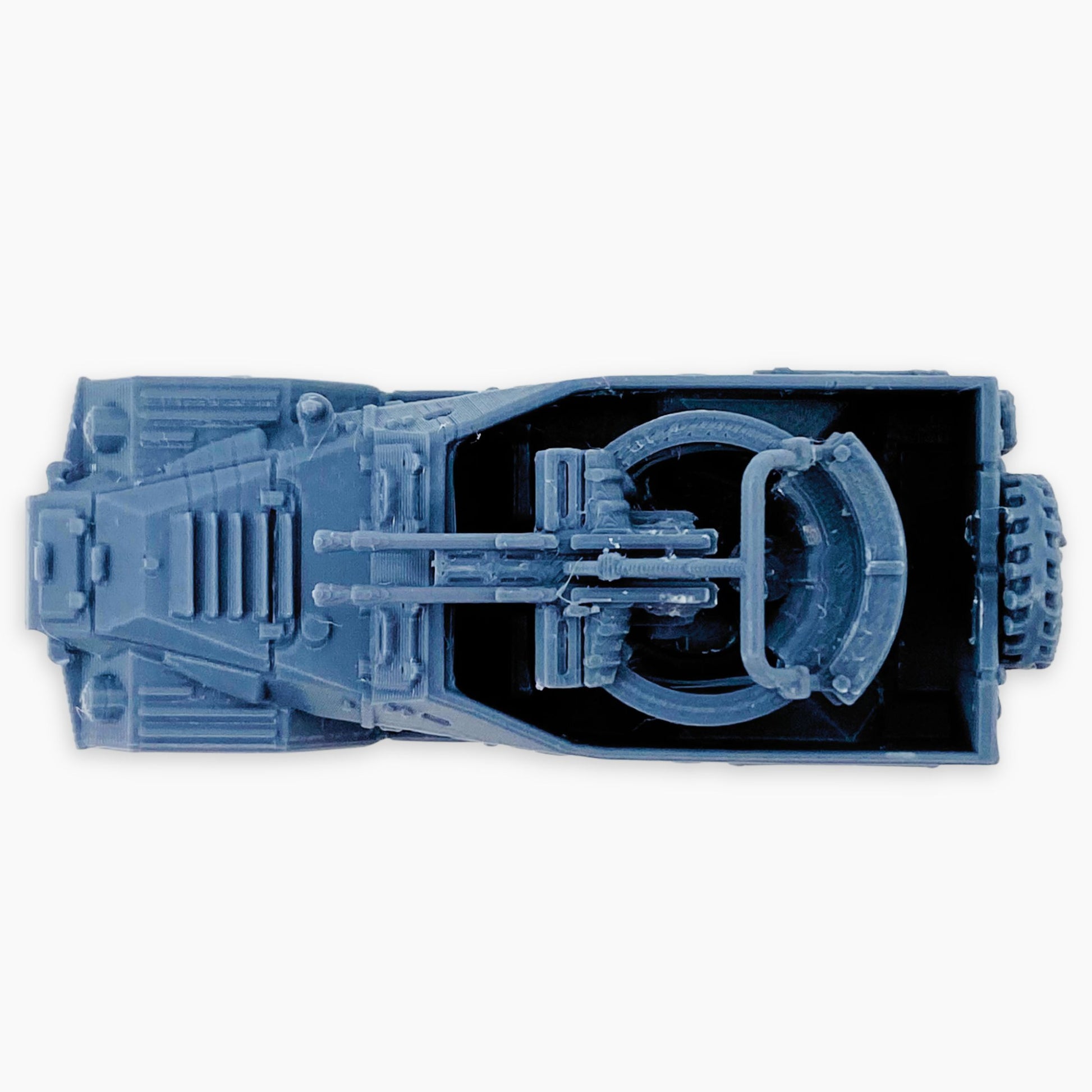 BTR-40A (spare tire) miniature, depicting the Soviet armored personnel carrier in its anti-aircraft configuration, fitted with an externally mounted spare wheel. Based on the standard BTR-40 chassis, the BTR-40A replaced the troop compartment with twin 14.5 mm KPV heavy machine guns in a rotating ZPU-2 mount, providing mobile air defense and heavy fire support. The addition of the spare tire reflects the practical field adaptations commonly seen in service. Lightly armored but mobile and versatile, it served with Soviet and Warsaw Pact forces during the Cold War. This model is ideal for Cold War–era dioramas, wargaming scenery, or historical vehicle collections in multiple scales.