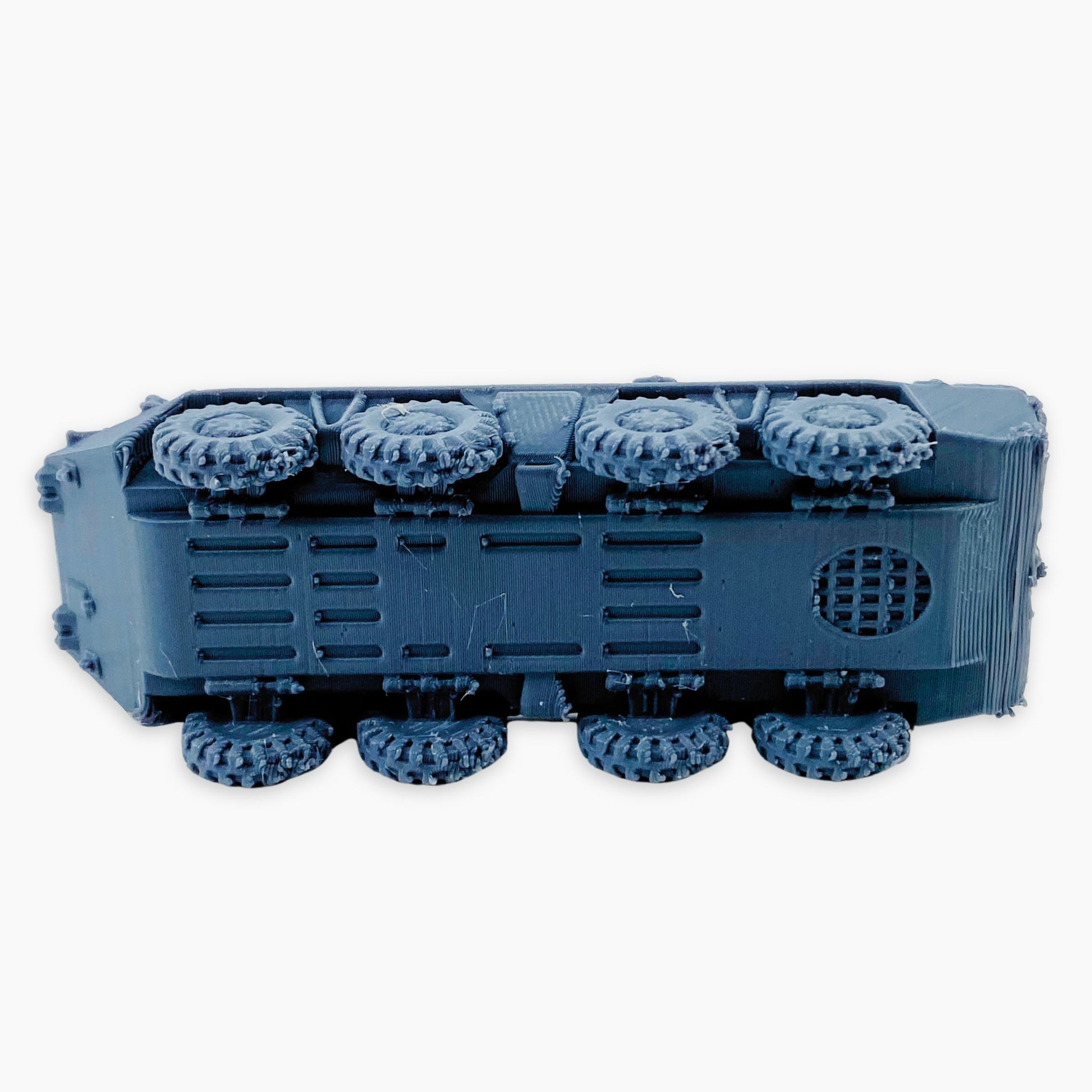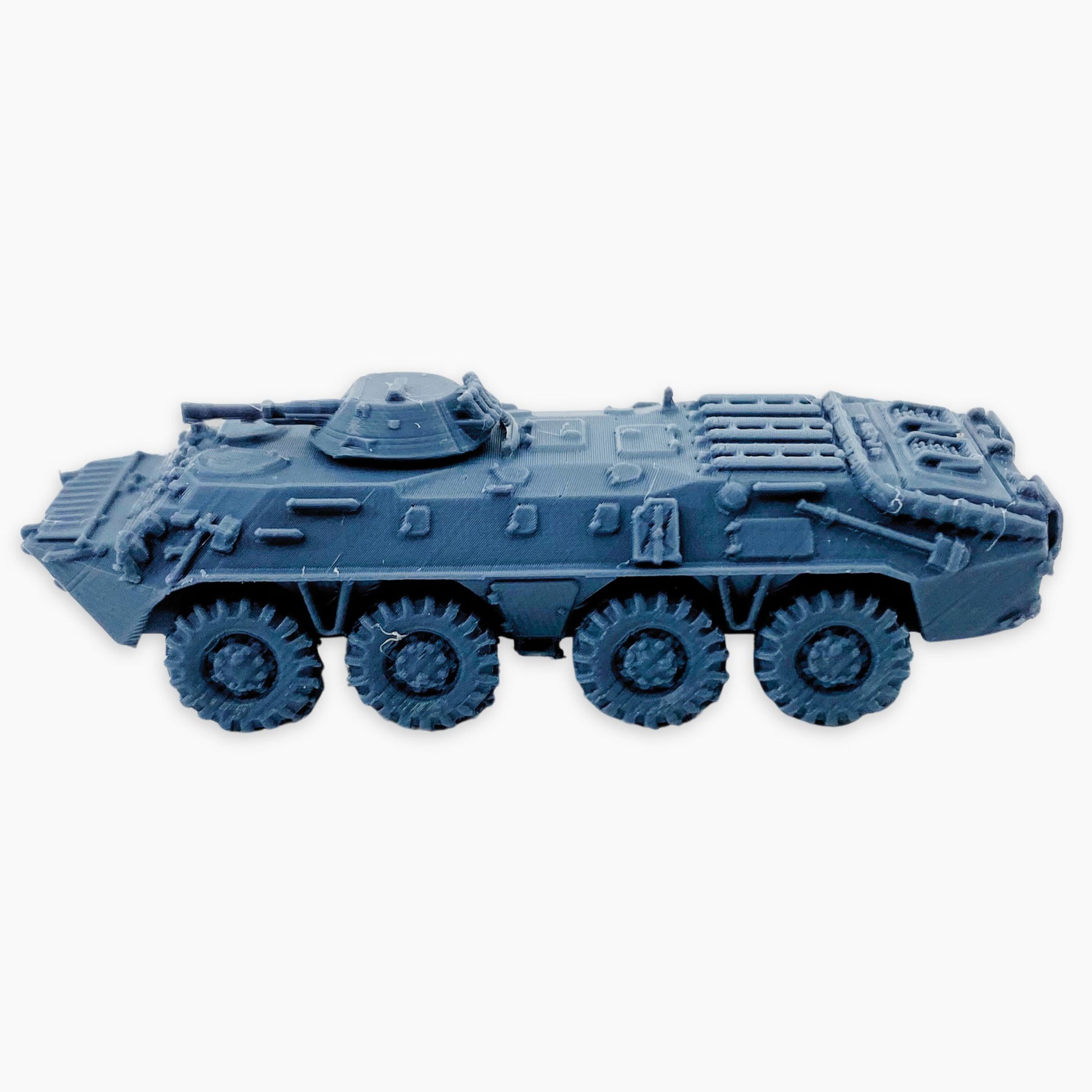 BTR-70 (smoke) miniature, depicting the Soviet 8x8 armored personnel carrier equipped with a smoke grenade launcher system. Introduced in the late 1970s, the BTR-70 featured a welded steel hull, improved armor, and twin gasoline engines for enhanced mobility. Armed with a 14.5 mm KPVT heavy machine gun and a 7.62 mm coaxial machine gun, this variant could deploy smoke screens to conceal troop movements or obscure enemy fire. Widely used by Soviet and Warsaw Pact forces and exported to numerous countries, the BTR-70 (Smoke) is ideal for Cold War and modern-era dioramas, wargaming scenery, or armored vehicle collections.