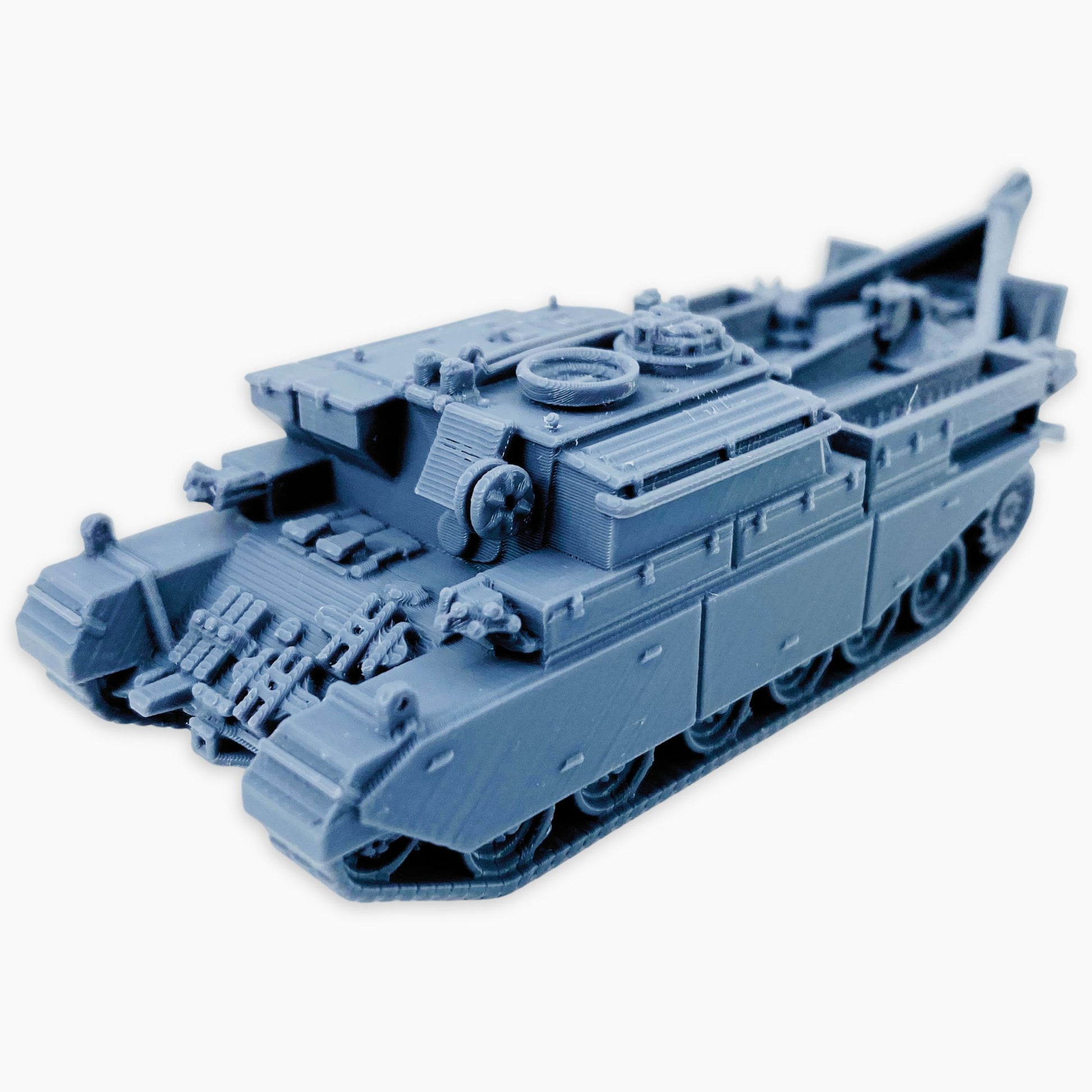 Centurion ARV Mk II miniature, representing the British armored recovery vehicle developed from the Centurion main battle tank during the postwar era. Designed to recover and tow damaged or immobilized tanks, the ARV Mk II was fitted with a heavy-duty winch system, an A-frame jib crane, and towing equipment instead of a turret. Its robust Centurion chassis gave it excellent cross-country mobility, allowing it to operate alongside front-line armored units. Widely used by the British Army and exported to several allied nations, it played a key support role during the Cold War and beyond. This model makes a striking addition to dioramas, wargaming scenery, or armored vehicle collections in multiple scales.