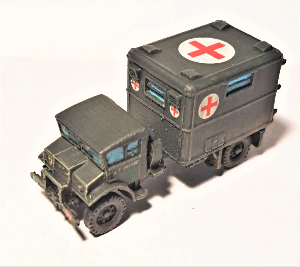CMP 3t C60L (Ambulance) miniature, representing the Canadian Military Pattern 3-ton truck converted for medical evacuation and field hospital duties. Used by Allied forces—including Canada, the United Kingdom, Australia, New Zealand, South Africa, India, and the Soviet Union via Lend-Lease—this variant was equipped with a fully enclosed rear body to transport wounded soldiers safely from the battlefield. Featuring the C60L’s distinctive cab-over-engine design, long wheelbase, and detailed ambulance body, this model brings a vital support element to any diorama, wargaming scenery, or WWII vehicle collection in multiple scales.