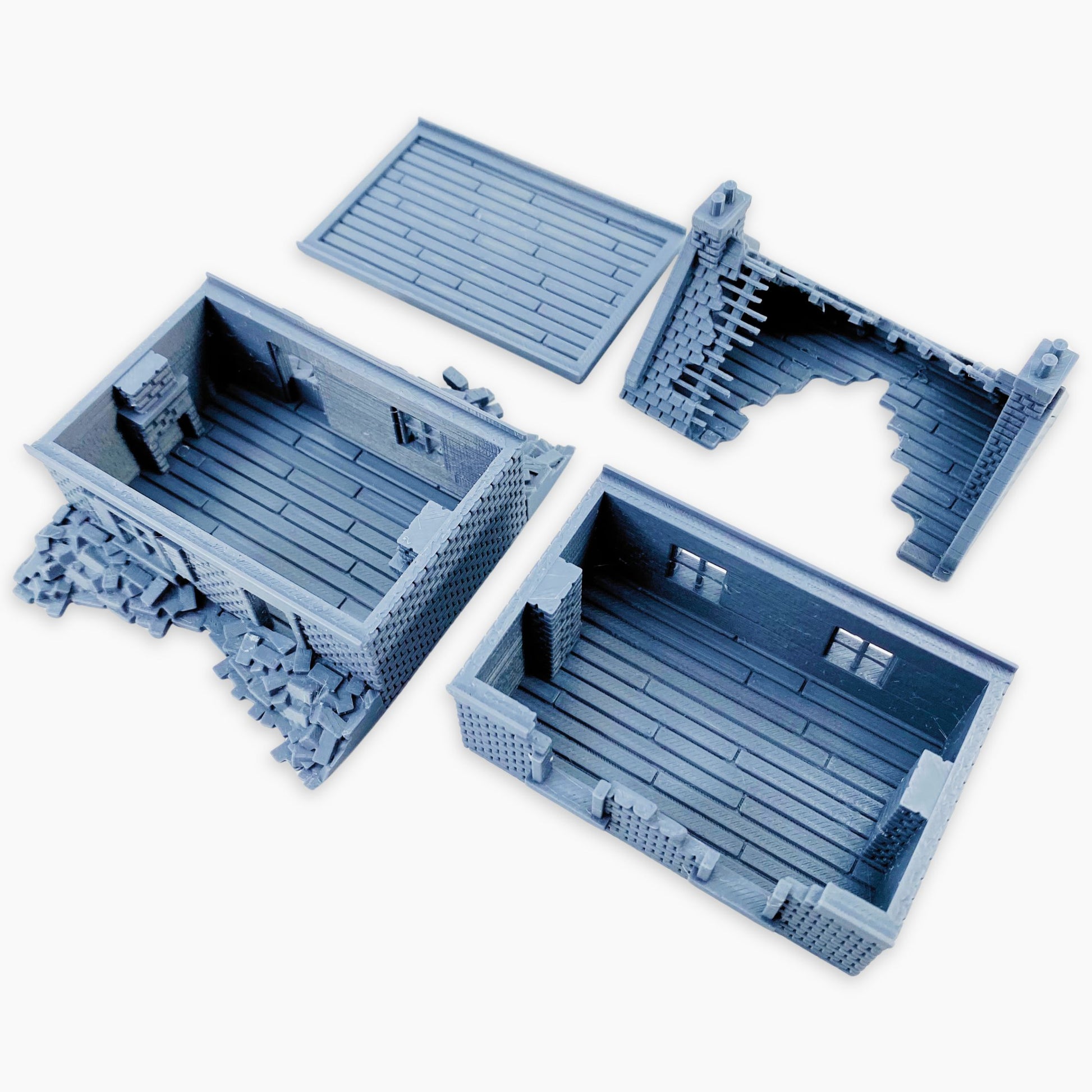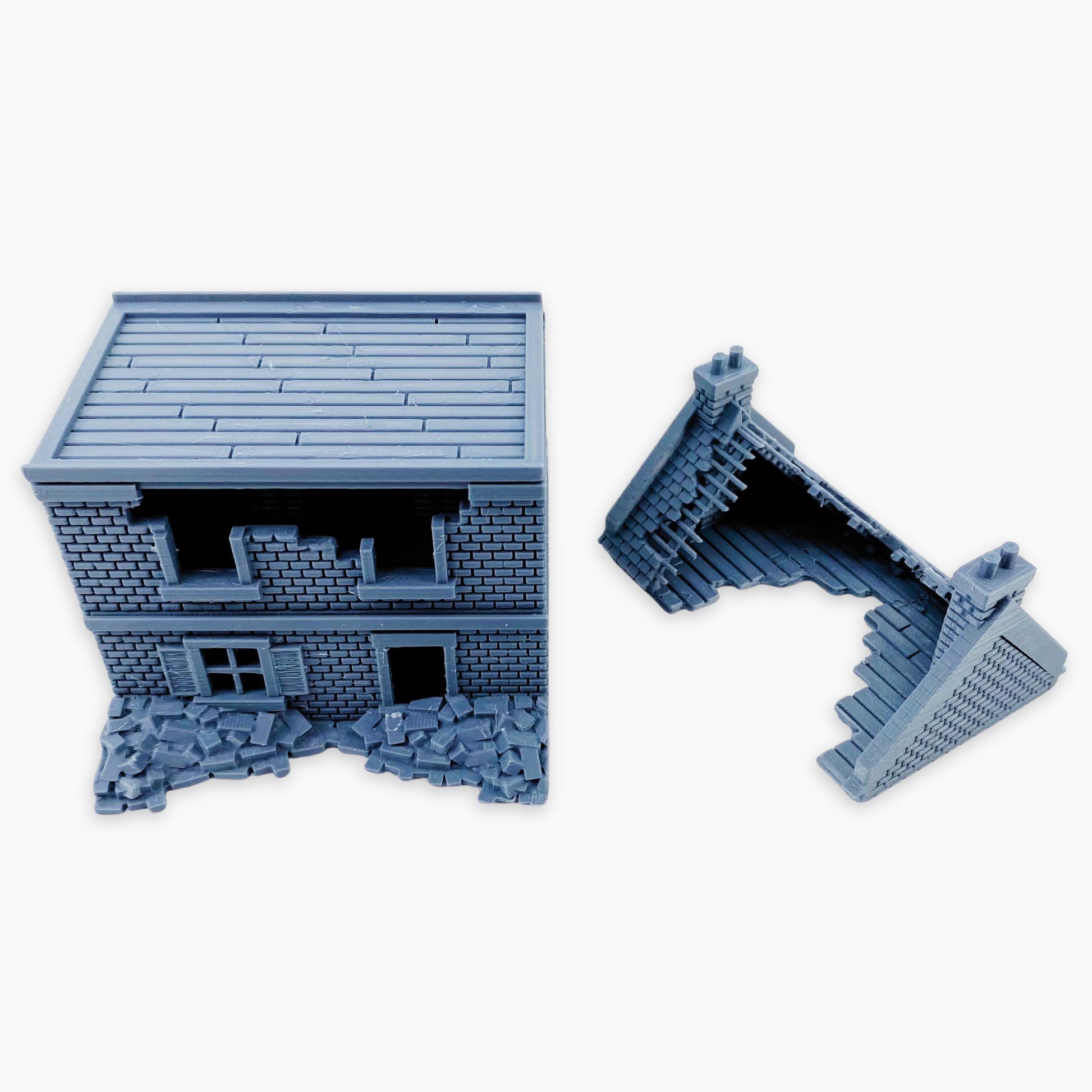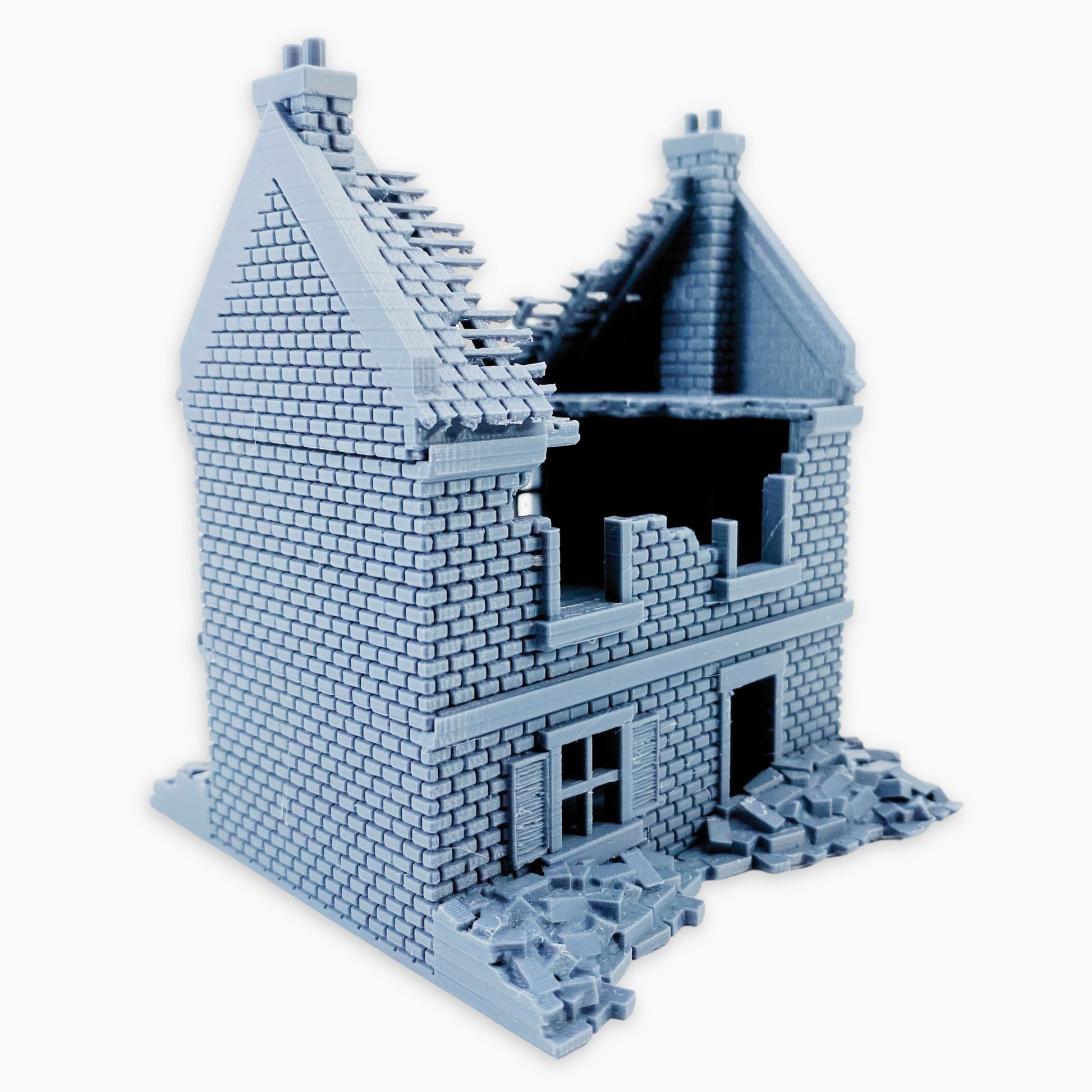 French Row House Ruins 2 miniature, depicting a heavily damaged European-style residence, ideal for recreating wartime urban scenery. Like the first version, this ruined building comes in 4 separate pieces, making it easy to place, rearrange, or combine with other terrain for more complex setups. Highly detailed with realistic textures and broken architectural elements, it captures the atmosphere of a bombed-out street scene. Perfect for dioramas, wargaming scenery, or tabletop terrain, this piece fits naturally into World War II, modern, or alternate-history battlefields in multiple scales.