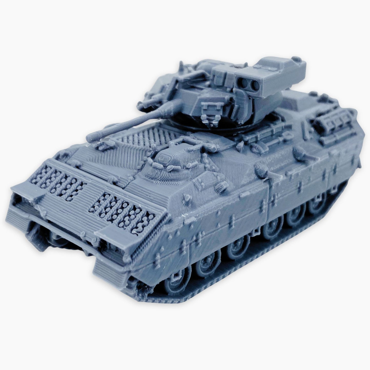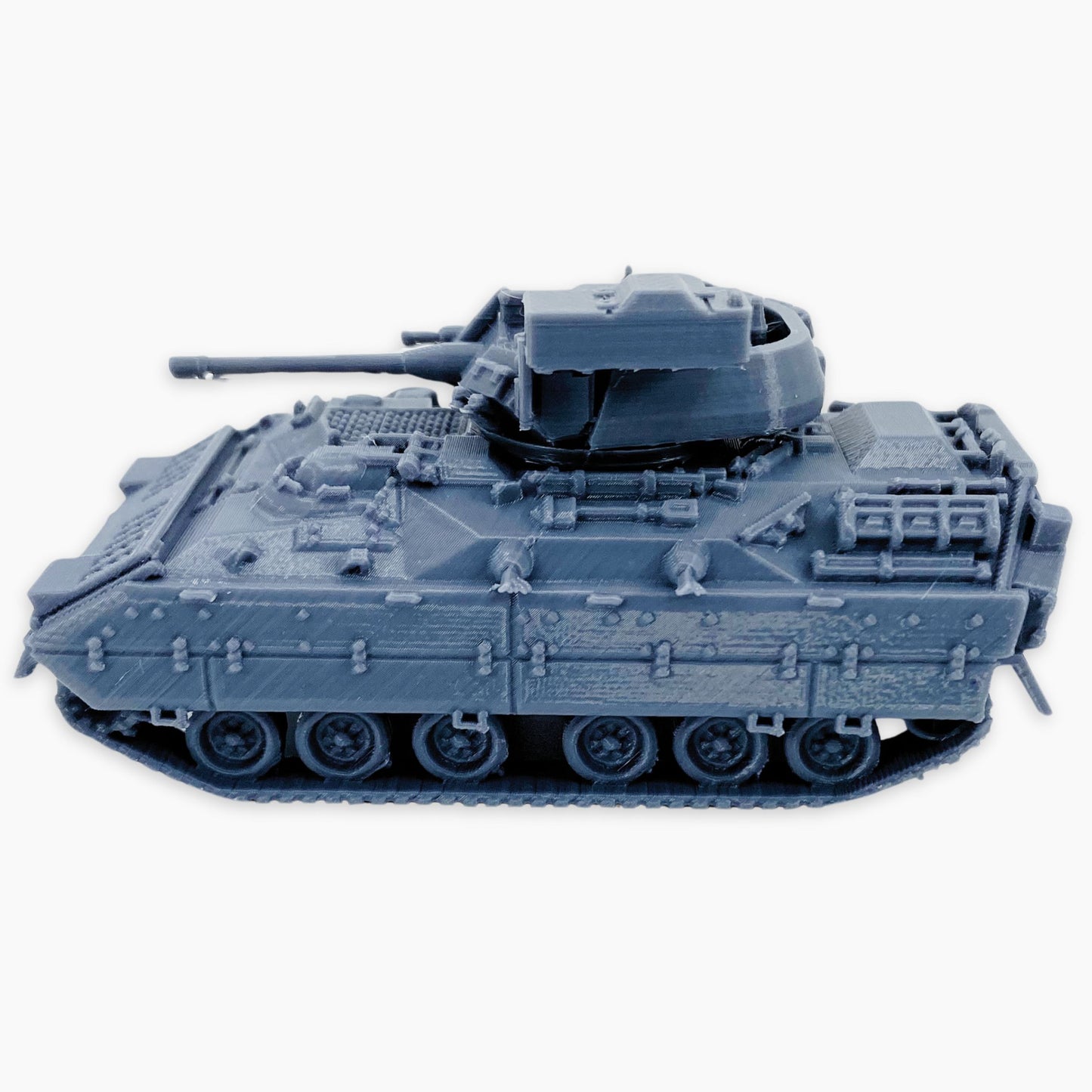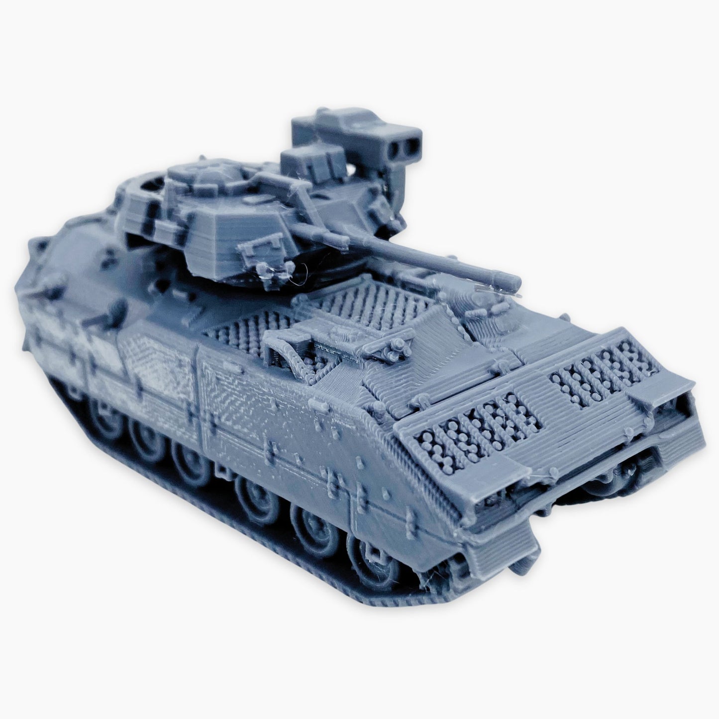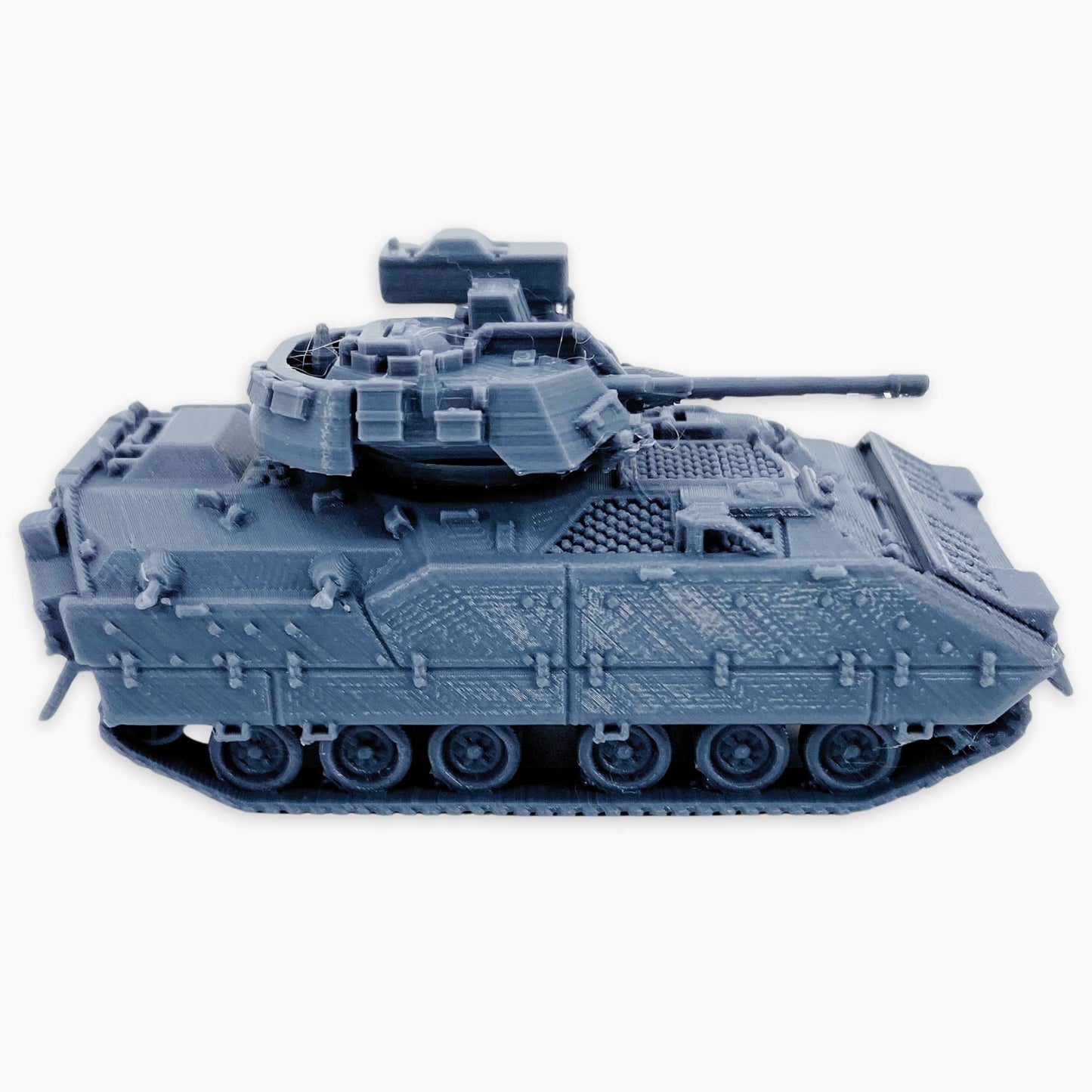 The miniature M2A1 Bradley (trim vane rear panel) combines the features of the M2A1 Bradley Infantry Fighting Vehicle with both a trim vane for amphibious operations and a detailed rear panel. This variant showcases the Bradley's amphibious capabilities with the trim vane and includes storage and access points on the rear panel, maintaining its core features like the 25mm chain gun and TOW missile launcher. Ideal for dioramas and tabletop wargaming, it adds depth to military scenarios that involve diverse terrains and operational environments.