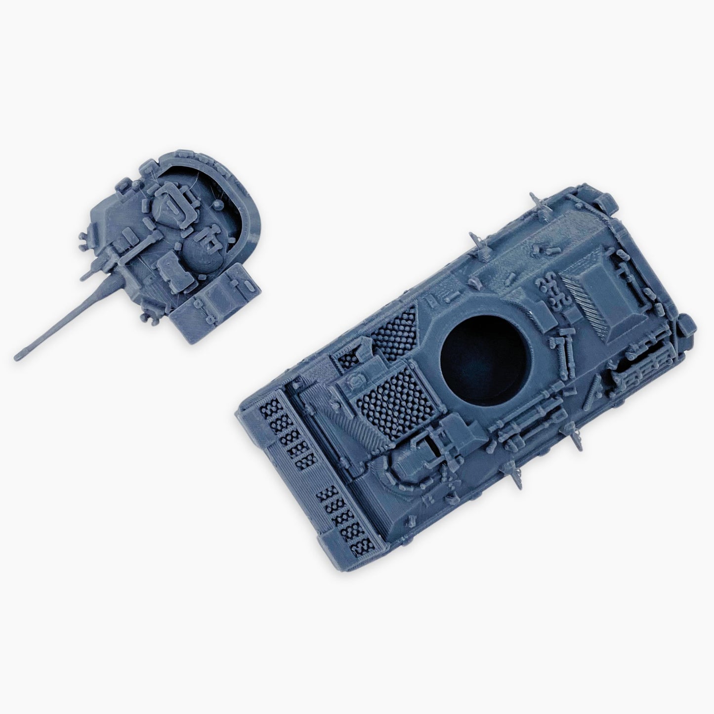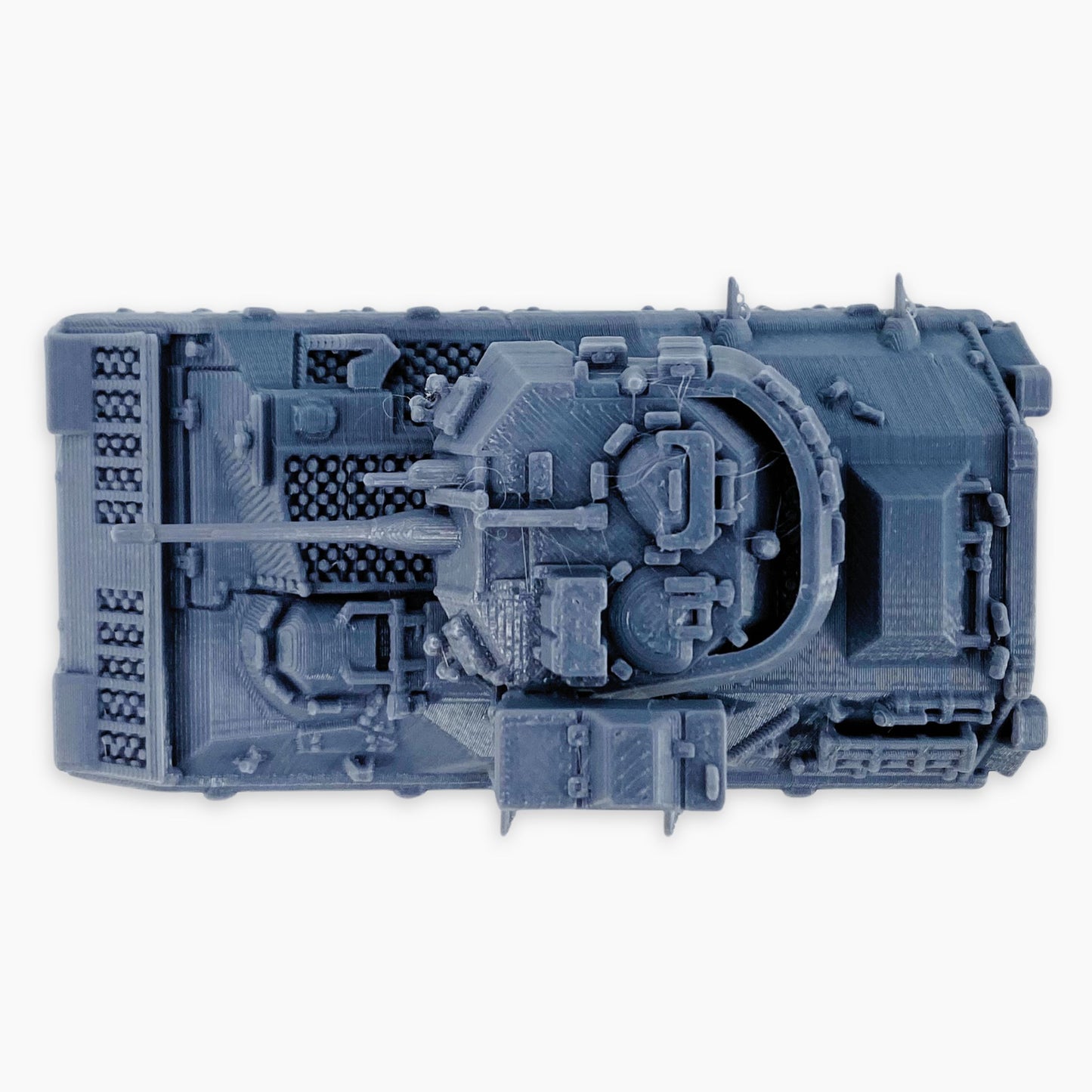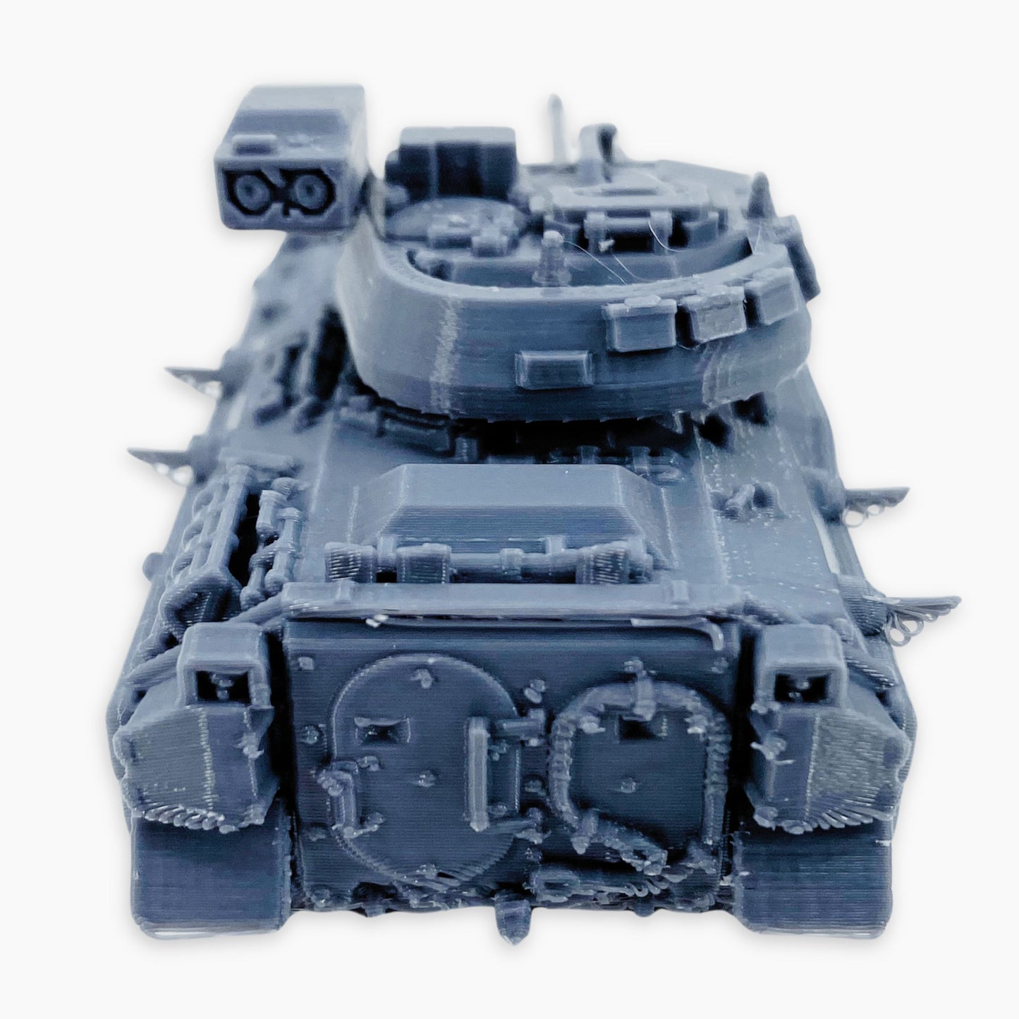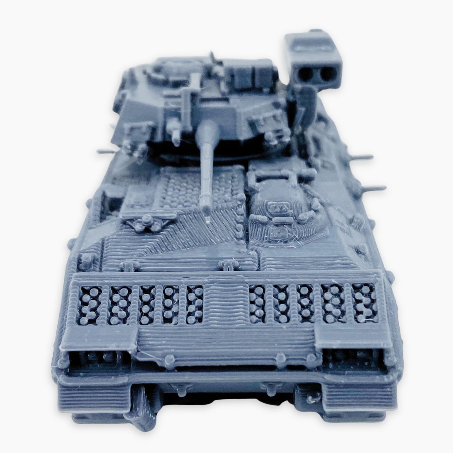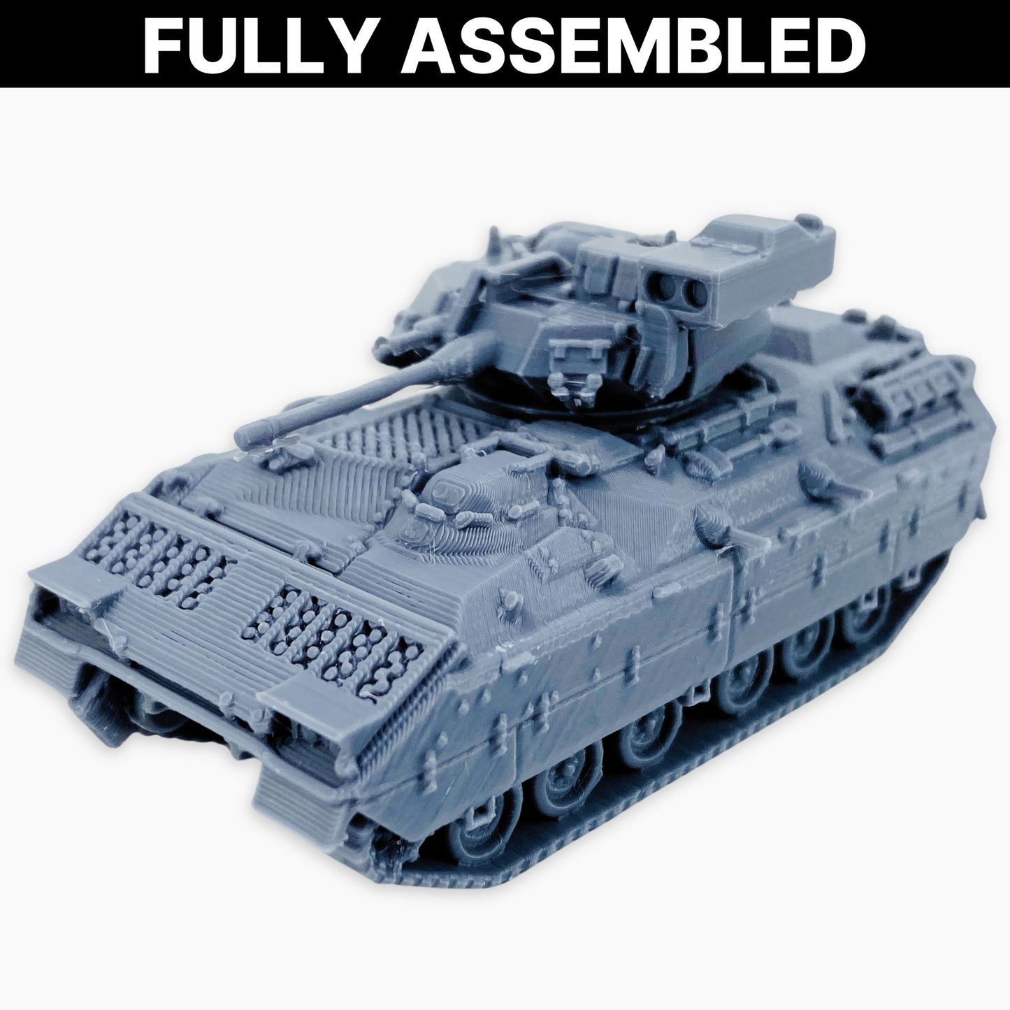 The miniature M2A1 Bradley (trim vane rear panel) combines the features of the M2A1 Bradley Infantry Fighting Vehicle with both a trim vane for amphibious operations and a detailed rear panel. This variant showcases the Bradley's amphibious capabilities with the trim vane and includes storage and access points on the rear panel, maintaining its core features like the 25mm chain gun and TOW missile launcher. Ideal for dioramas and tabletop wargaming, it adds depth to military scenarios that involve diverse terrains and operational environments.