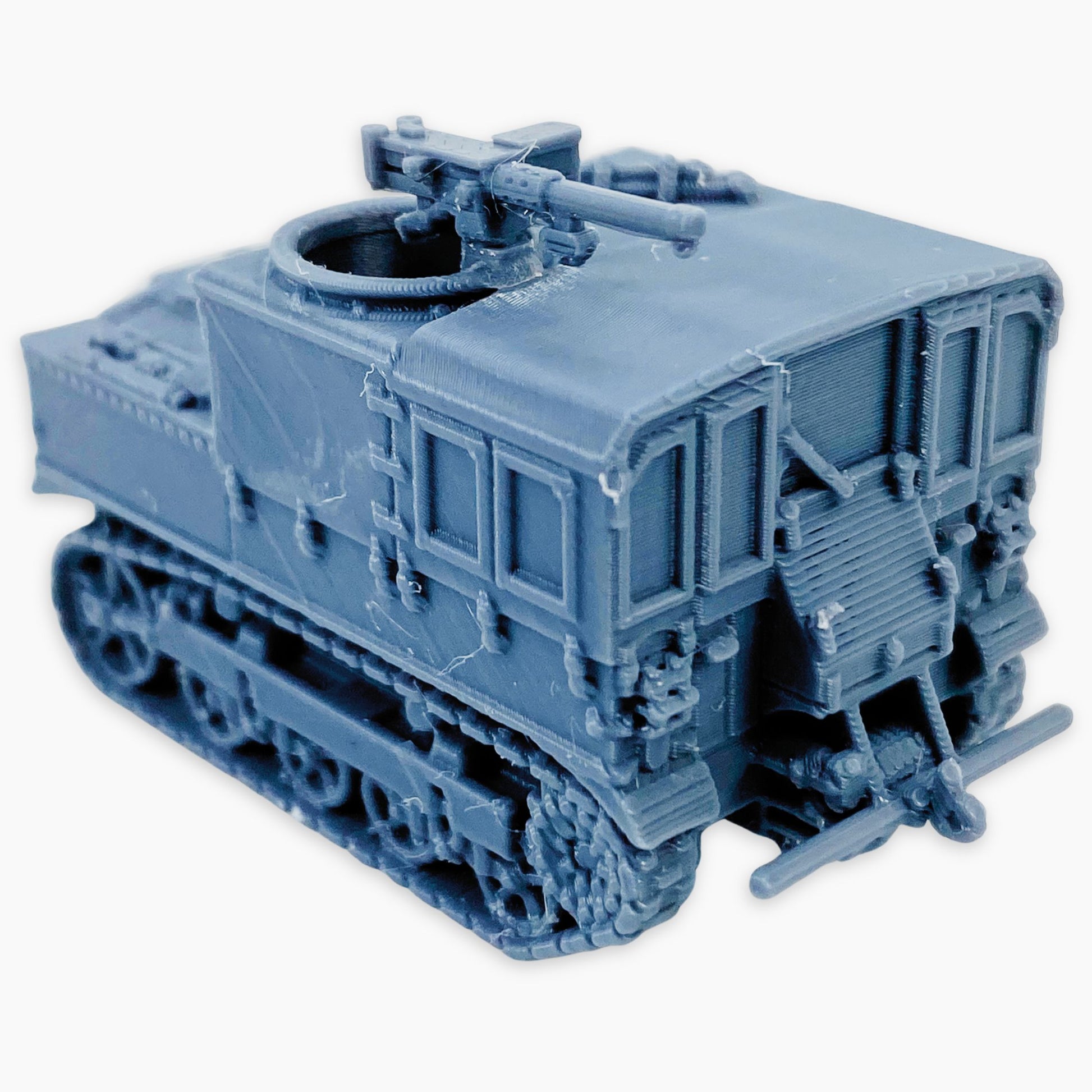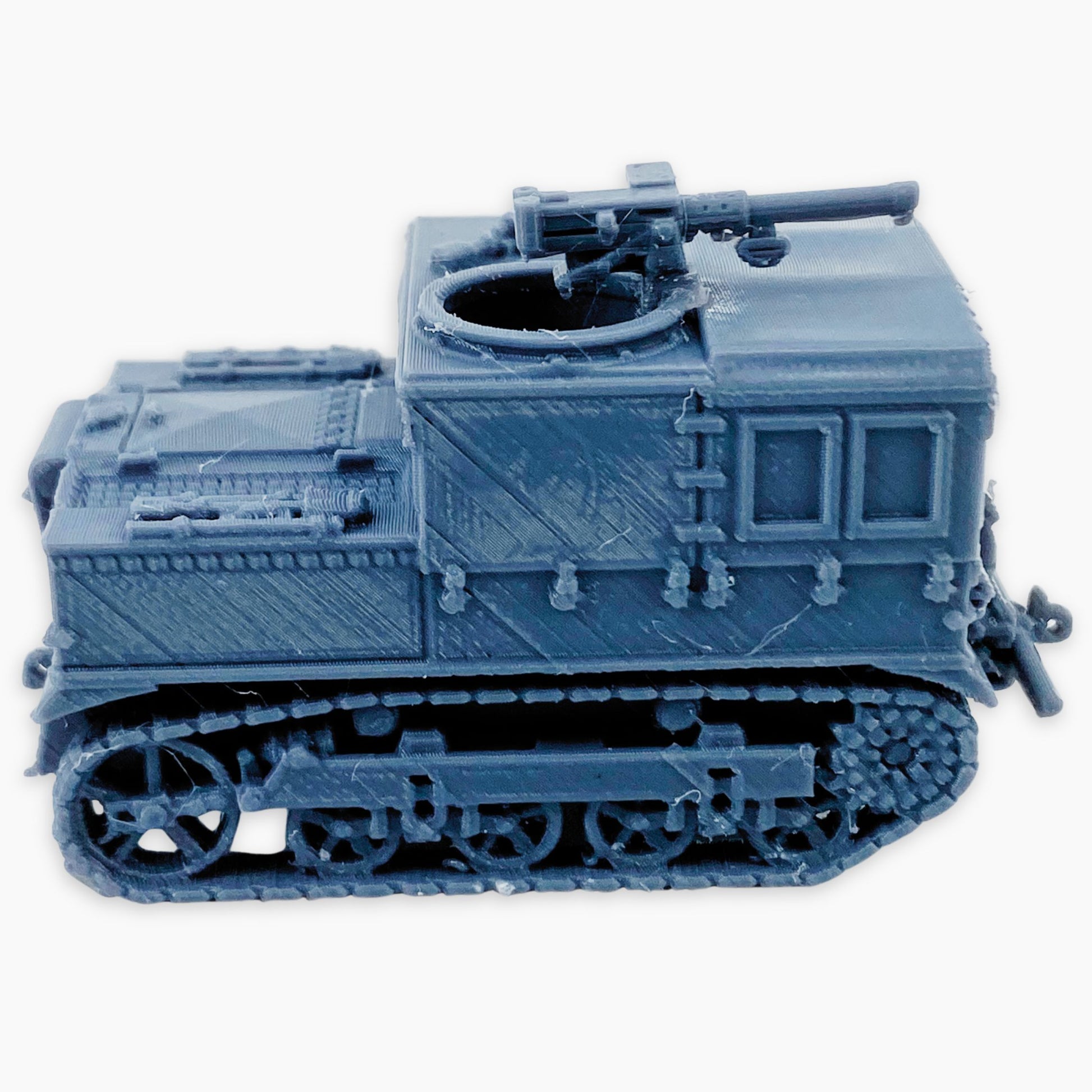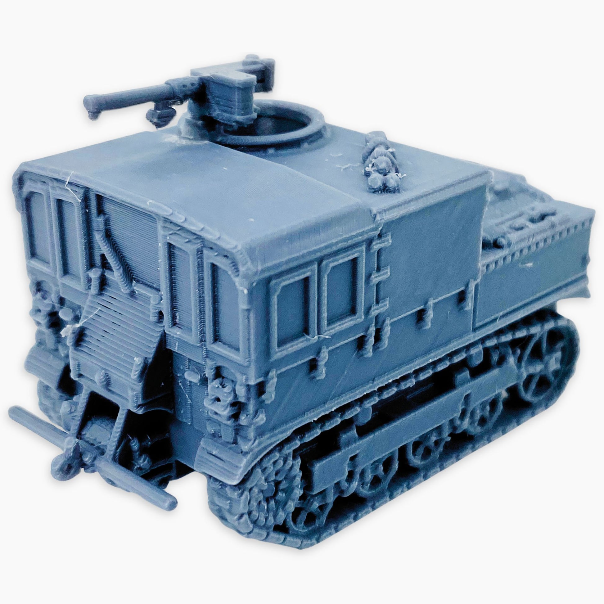 M5 High Speed Tractor (MG) miniature, representing the American tracked artillery tractor equipped with a mounted machine gun for additional defensive capability. Widely used during World War II to tow heavy artillery like the 105 mm and 155 mm howitzers, the M5 also carried ammunition and crew, making it an essential support vehicle on the battlefield. This version includes a 2-piece model, with the machine gun provided separately and requiring gluing for final assembly. A great addition to dioramas, wargaming scenery, or WWII vehicle collections in multiple scales.