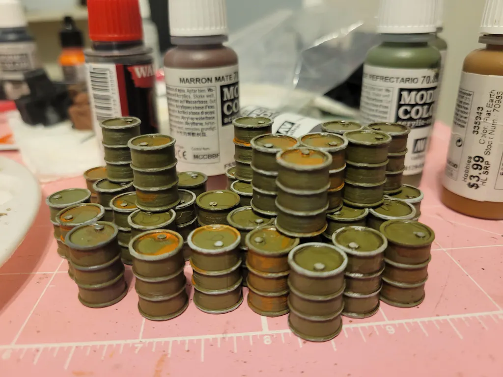 The miniature Oil Barrels are small-scale models designed to represent standard industrial oil barrels. Typically used in tabletop wargaming or dioramas, these miniatures add realism to scenes involving logistics, storage, or military operations. They often feature detailed designs with labels, bands, and seams, enhancing the authenticity of industrial or combat environments in miniature displays.