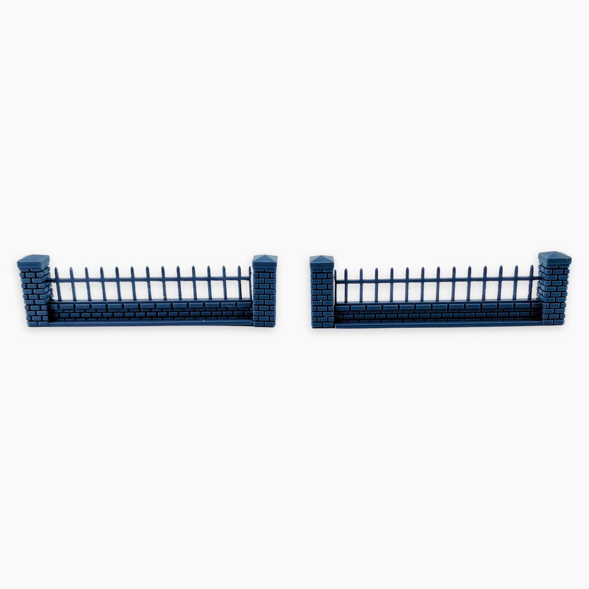 Stone Walls Fence Set (short) miniature, depicting a detailed stone wall line topped with decorative fencing in a lower-profile version. This set includes 14 pieces in total: 7 wall sections and 7 columns. Designed with realistic stone and metal textures, it’s perfect for enhancing dioramas, tabletop terrain, or wargaming scenery. Ideal for creating enclosed gardens, courtyards, or urban boundaries, this shorter version pairs beautifully with the tall set and fits seamlessly into World War II, modern, fantasy, or historical settings in multiple scales.