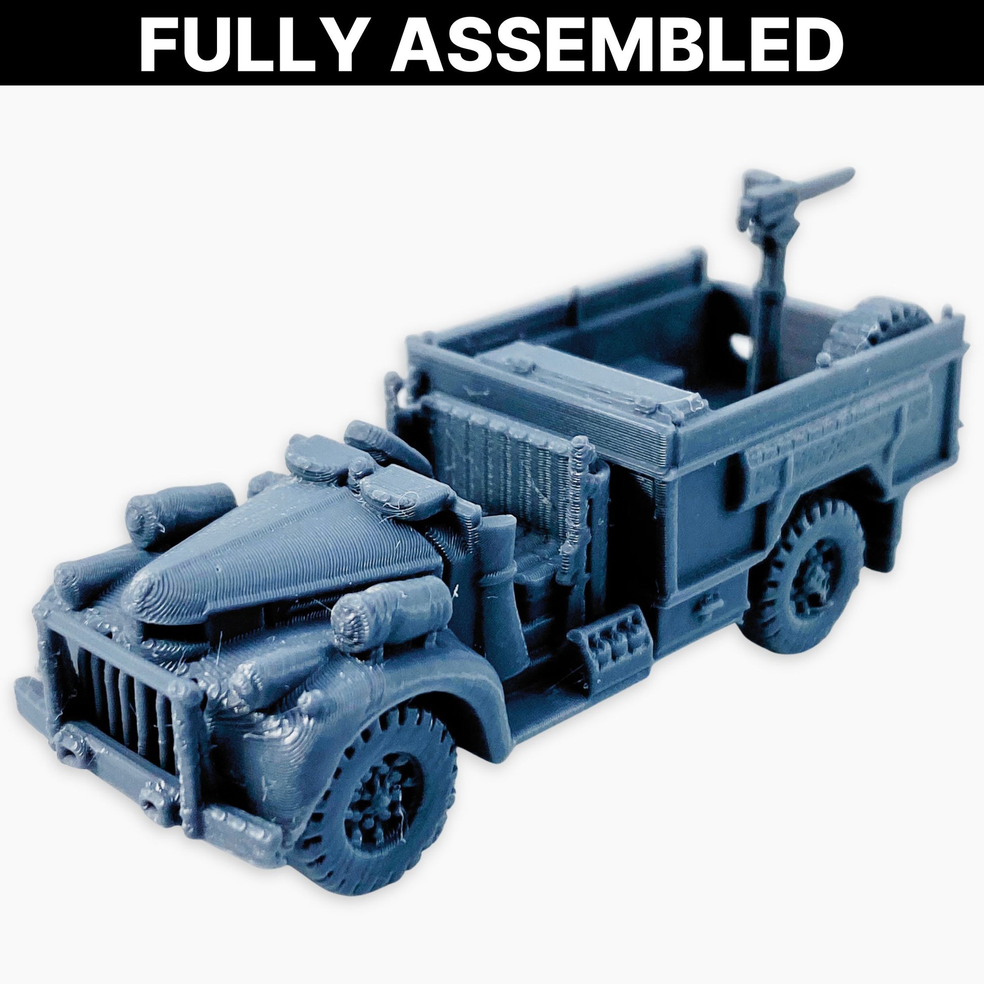 The Chevrolet WD CWT fitted with a .30 caliber machine gun and support bar was a versatile light truck used primarily by Commonwealth forces during World War II. The bar mount provided a stable firing platform while retaining cargo space and transport functionality. This configuration made it suitable for patrol, convoy escort, and mobile defense roles.