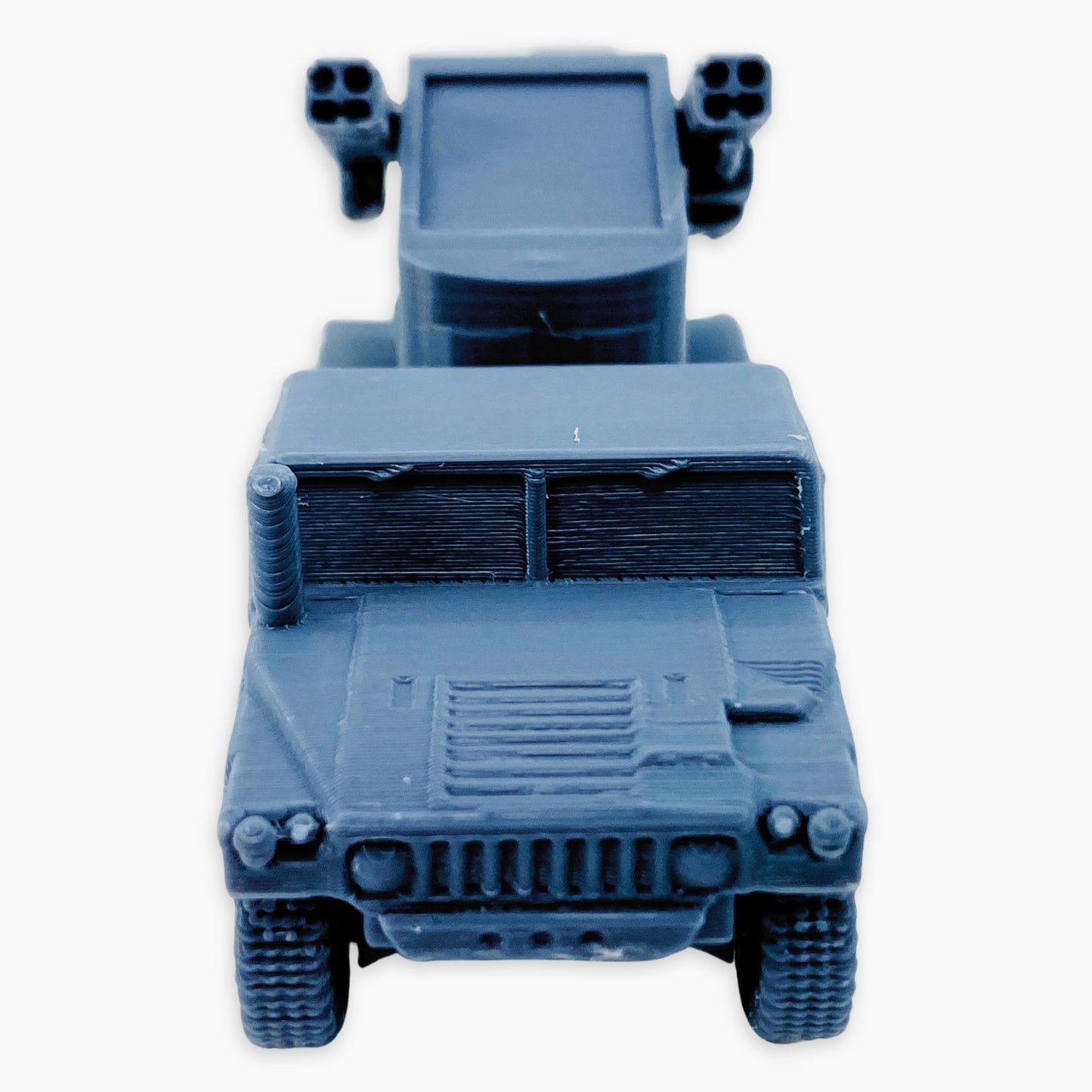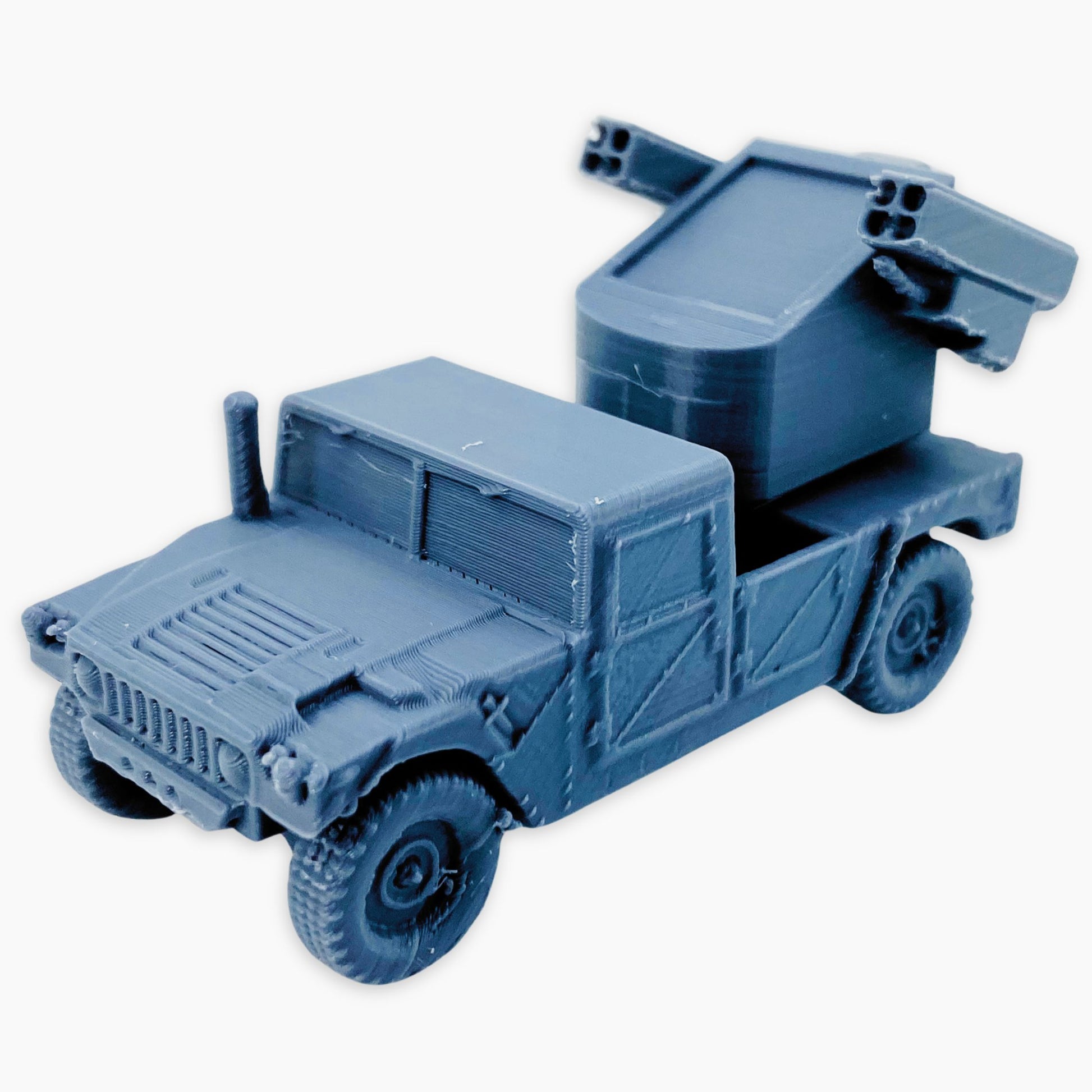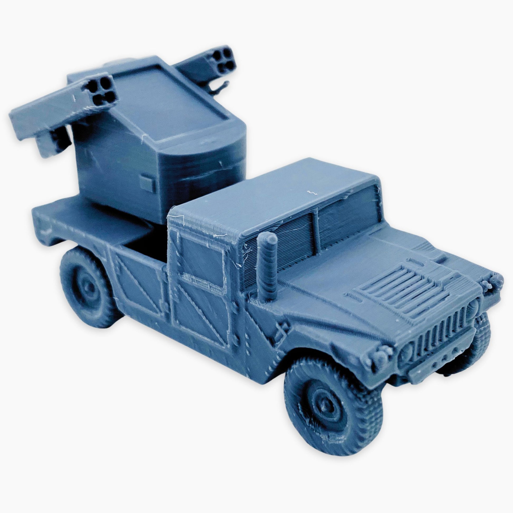 The Humvee Avenger miniature depicts a U.S. military vehicle fitted with the Avenger air defense system. It features a turret armed with Stinger missiles and a .50 caliber machine gun, designed to provide mobile short-range air defense against helicopters, drones, and low-flying aircraft.