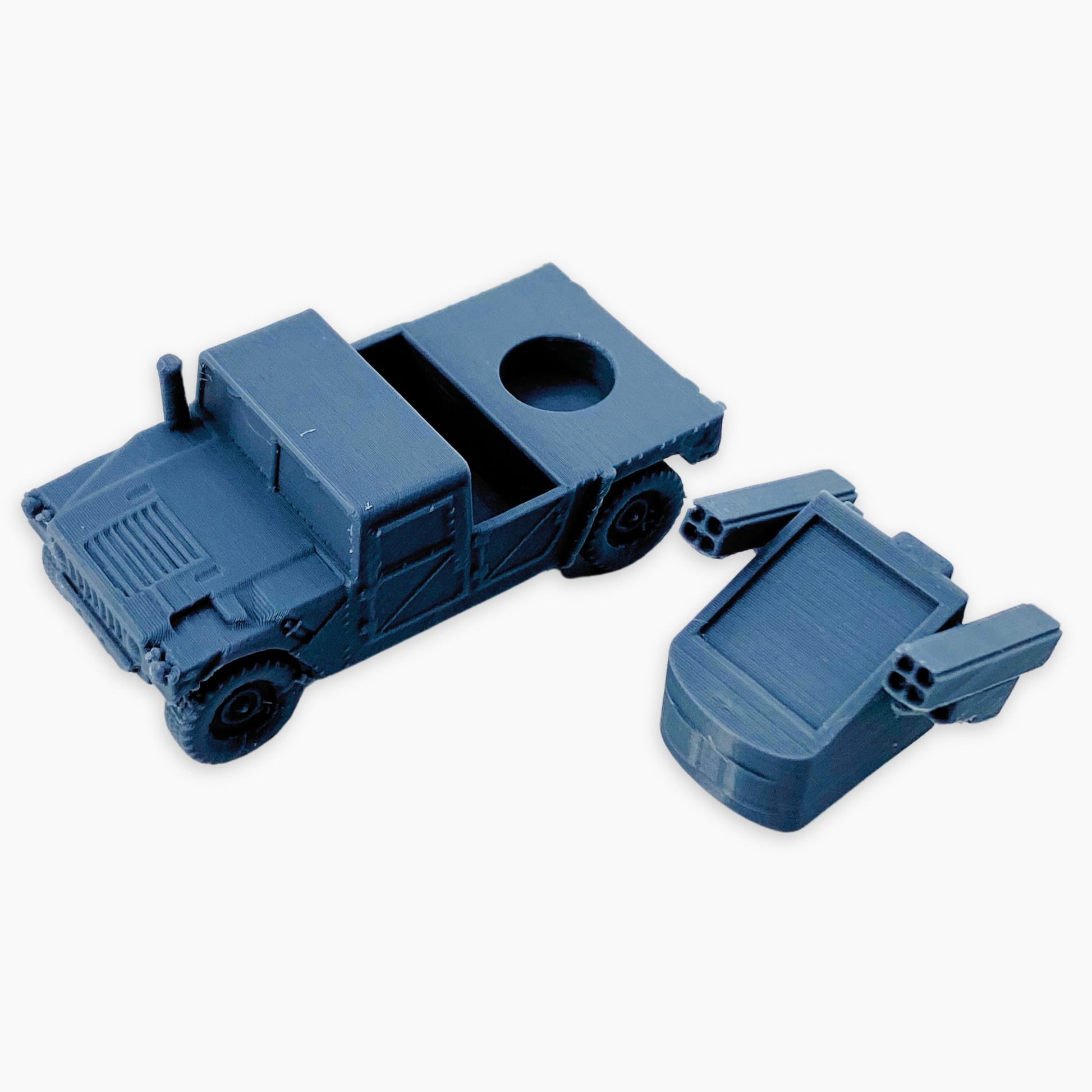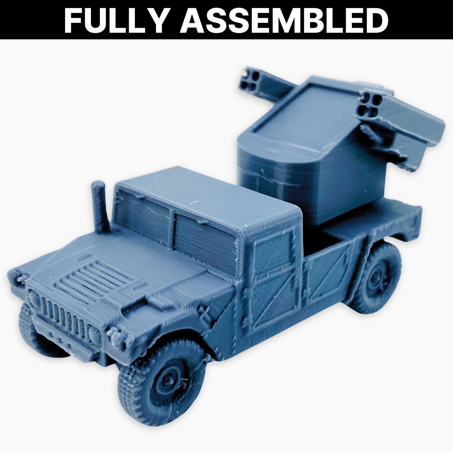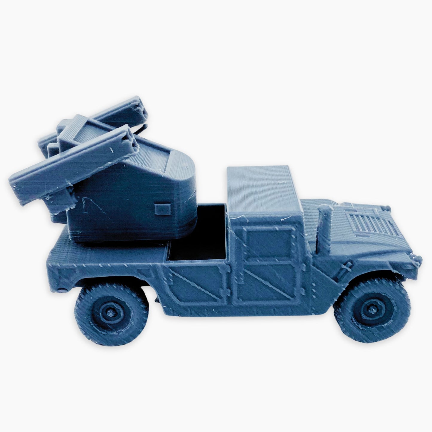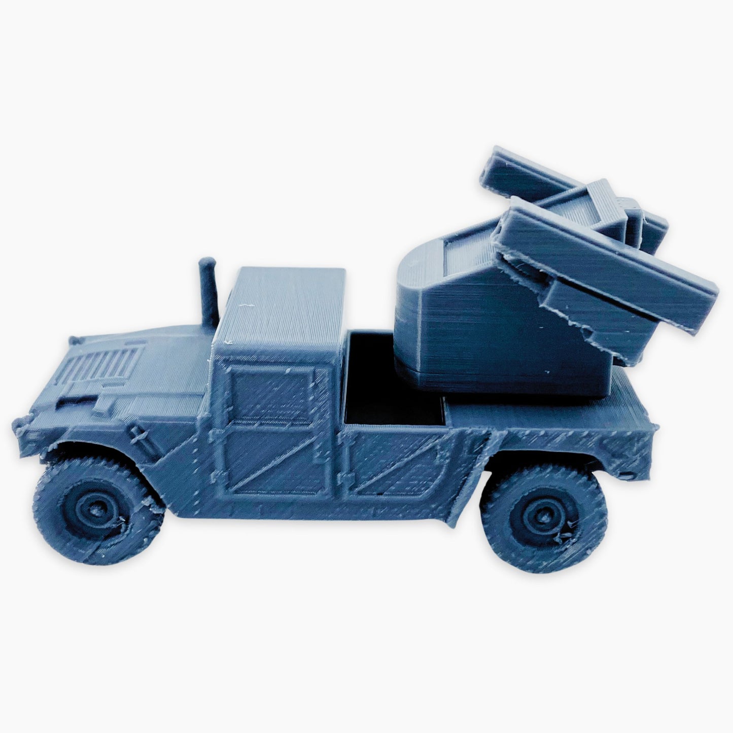 The Humvee Avenger miniature depicts a U.S. military vehicle fitted with the Avenger air defense system. It features a turret armed with Stinger missiles and a .50 caliber machine gun, designed to provide mobile short-range air defense against helicopters, drones, and low-flying aircraft.