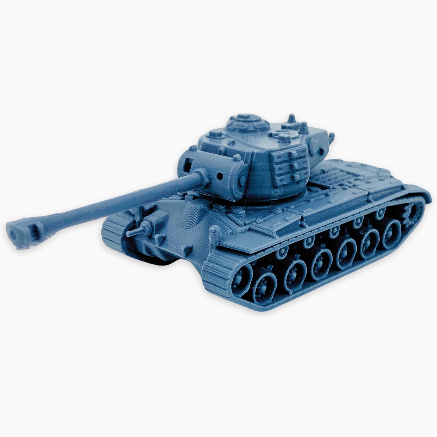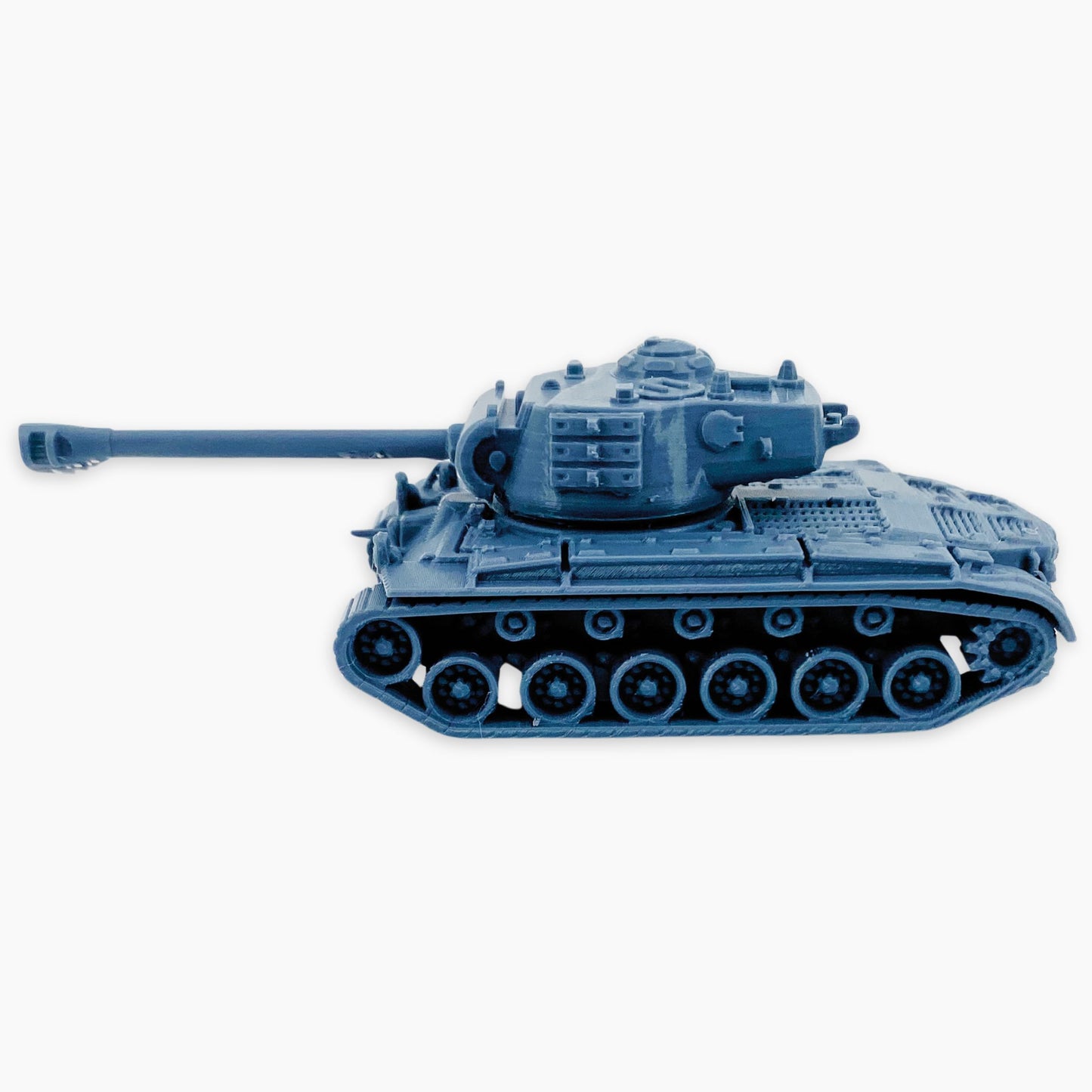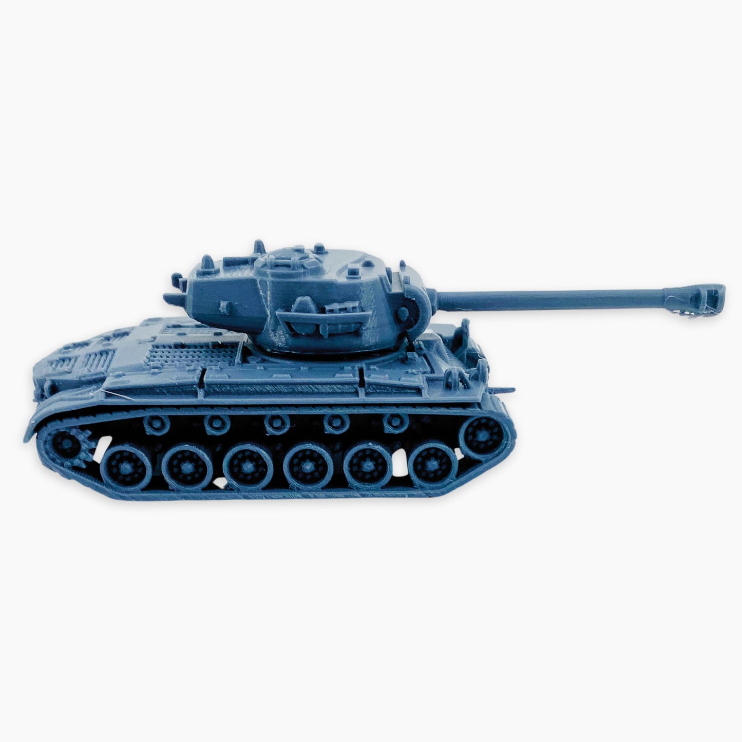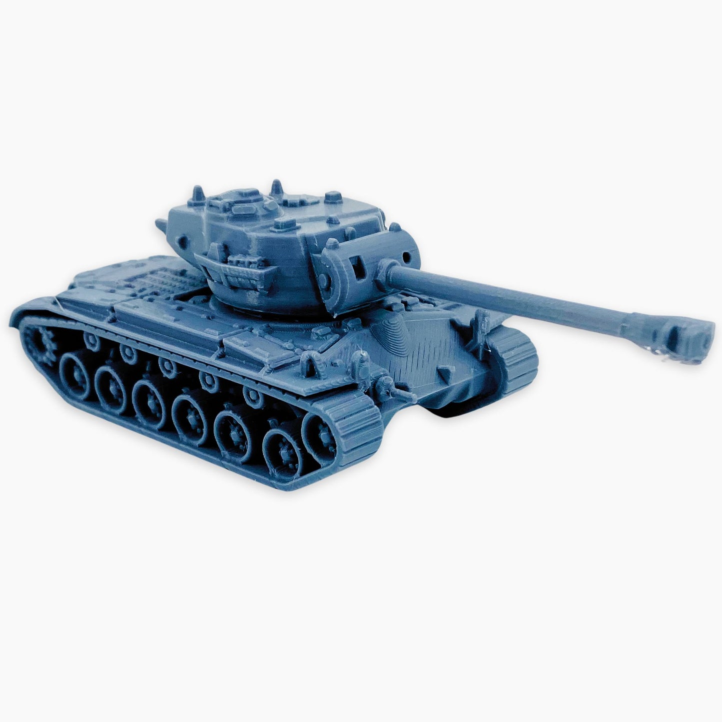 The miniature M26 Pershing depicts a late World War II American heavy tank designed to counter German heavy armor. Armed with a powerful 90mm gun and featuring improved armor protection, it combined firepower and mobility. The M26 served in both Europe and later in Korea, marking the transition from medium to heavy tanks in U.S. forces.