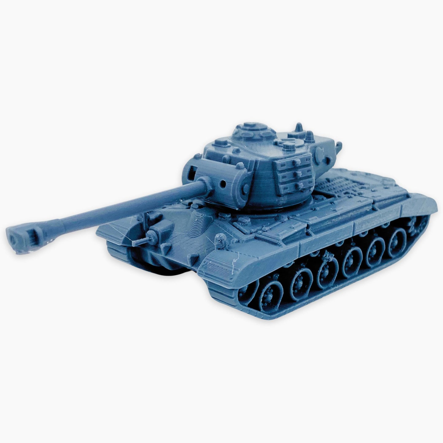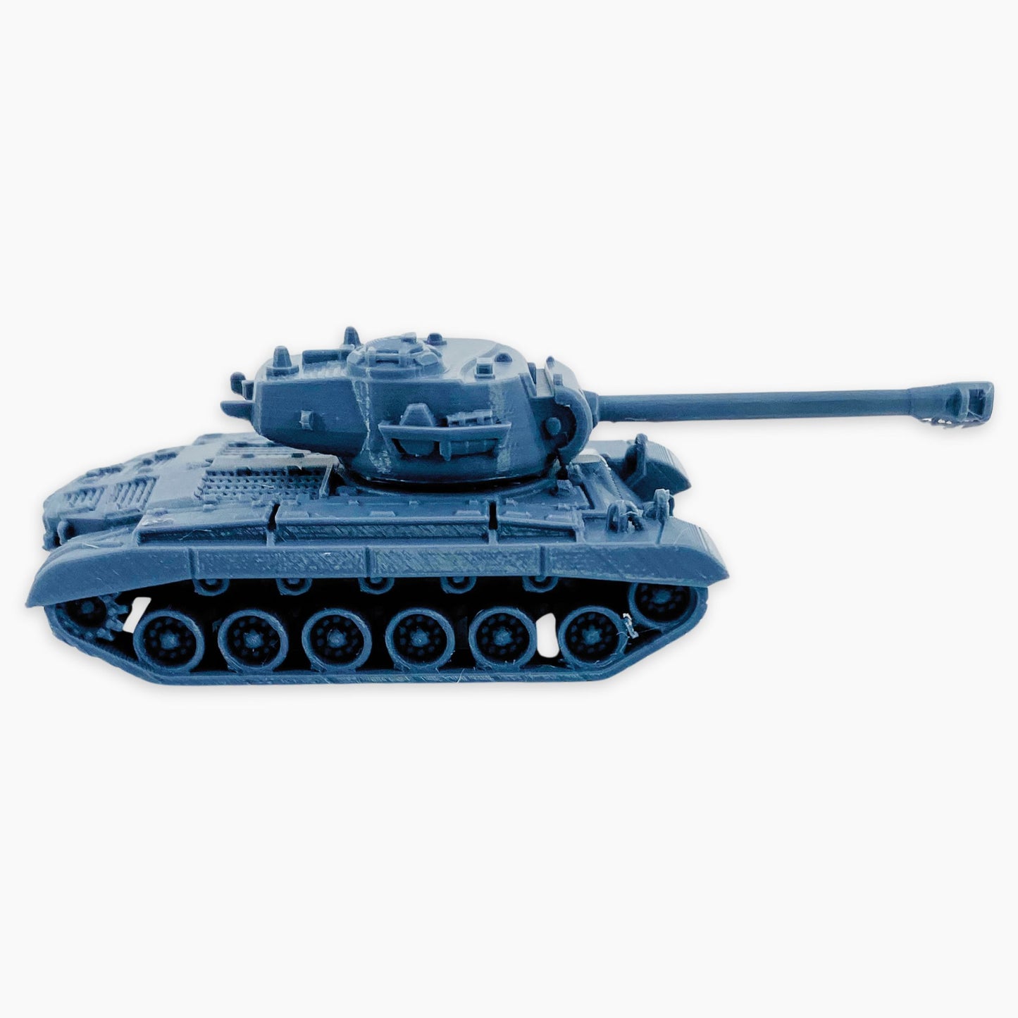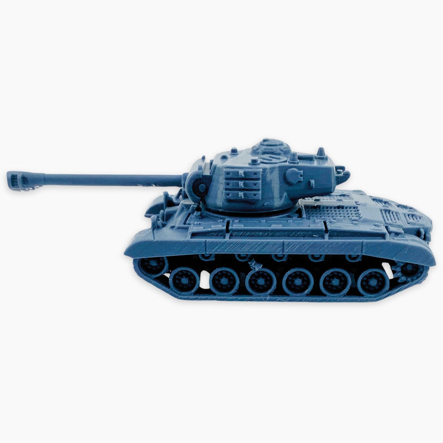 The miniature M26 Pershing (skirts) represents the American heavy tank equipped with additional side armor skirts for enhanced protection. Featuring a 90mm gun and balanced mobility, this version emphasizes battlefield survivability. It reflects late-war adaptations aimed at increasing durability against enemy fire.