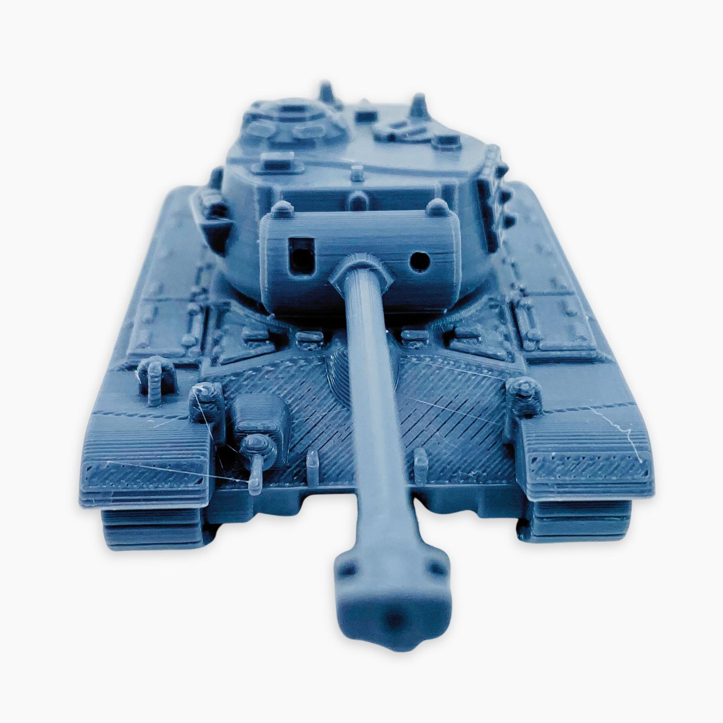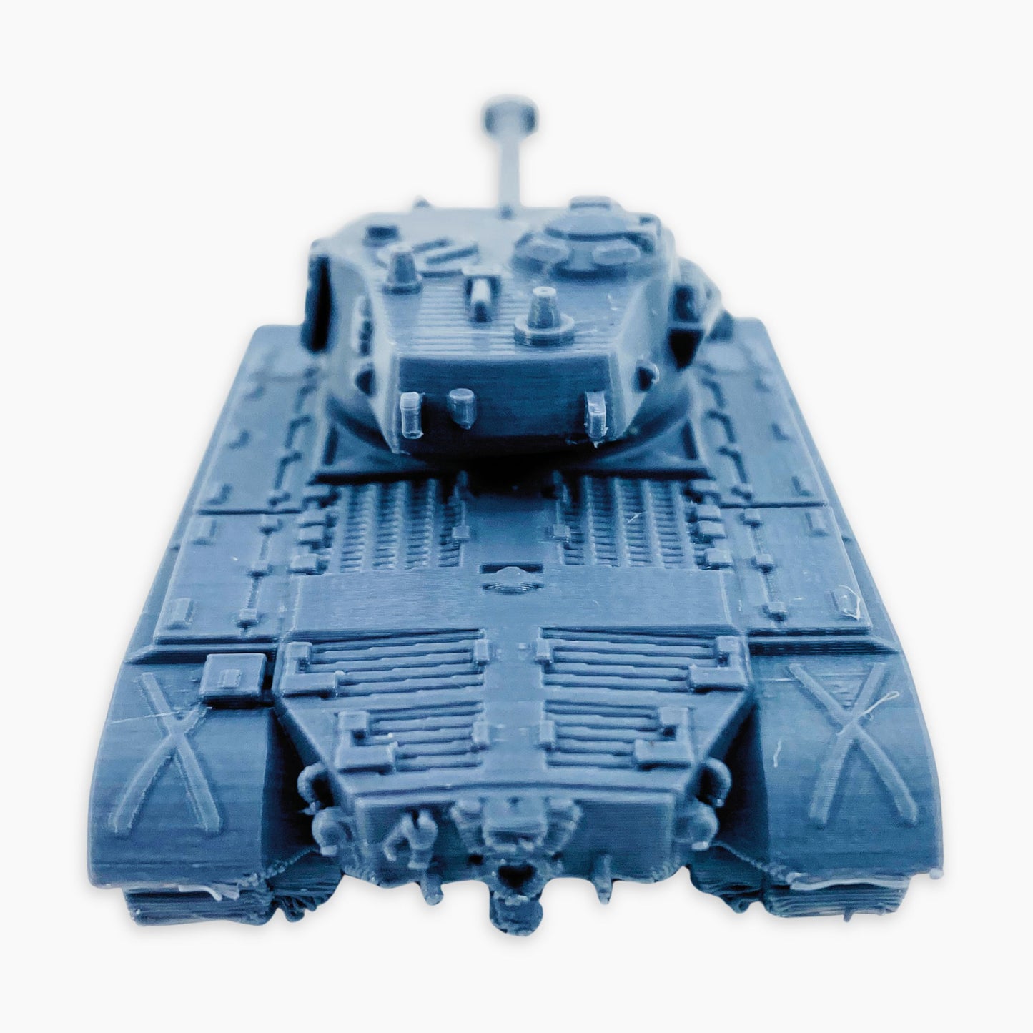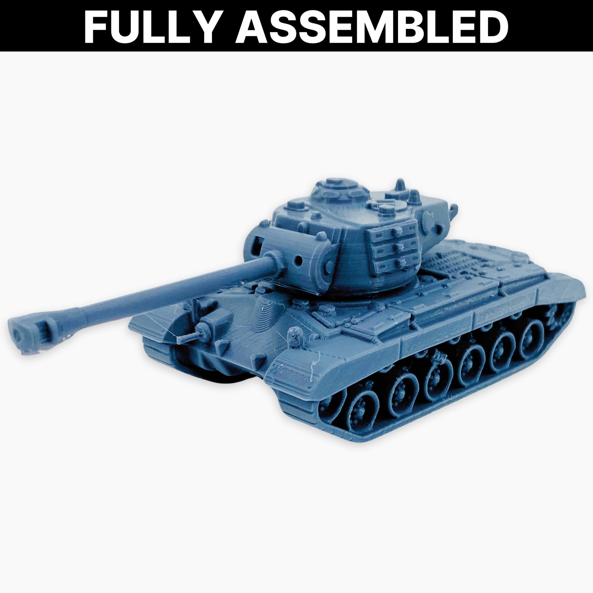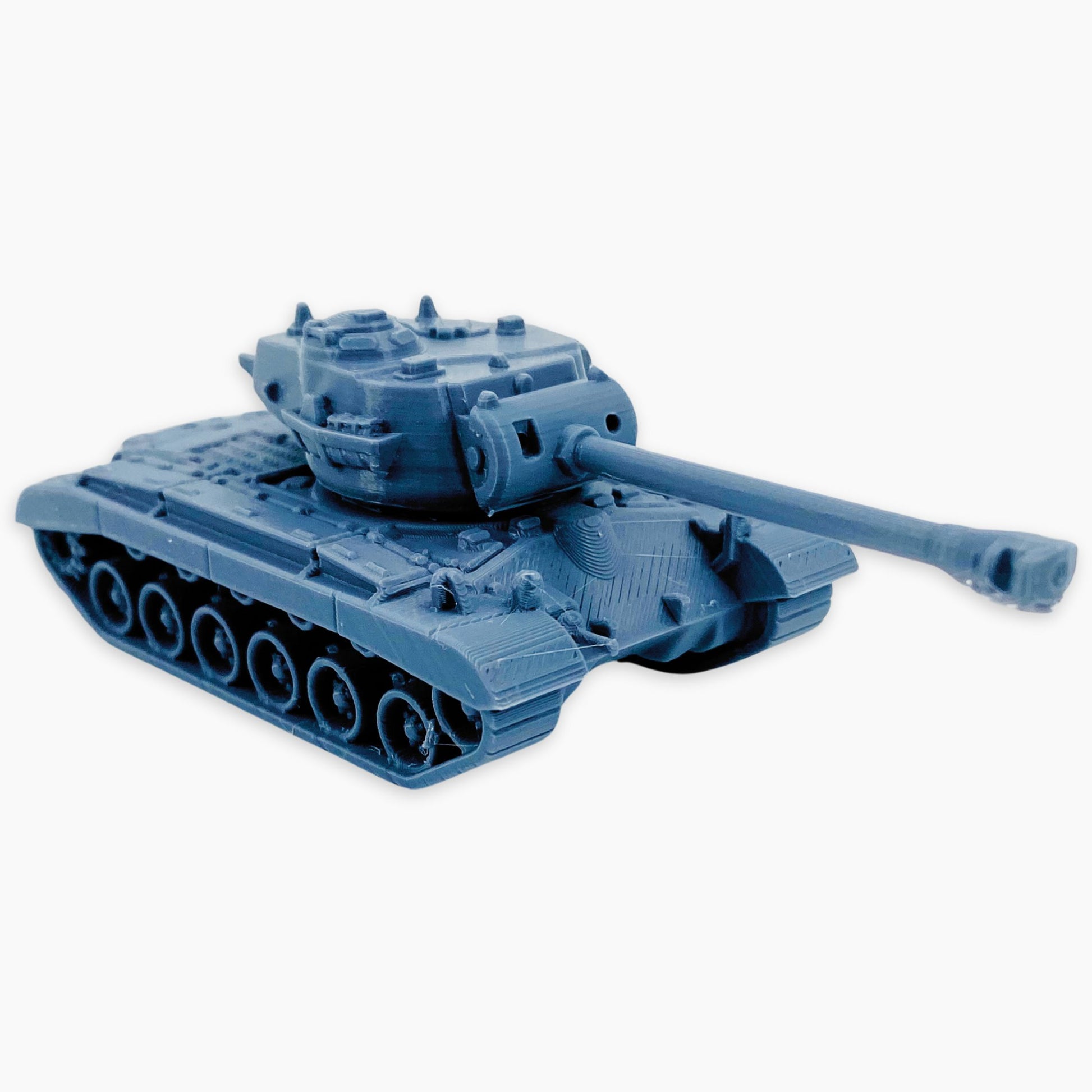 The miniature M26 Pershing (skirts) represents the American heavy tank equipped with additional side armor skirts for enhanced protection. Featuring a 90mm gun and balanced mobility, this version emphasizes battlefield survivability. It reflects late-war adaptations aimed at increasing durability against enemy fire.