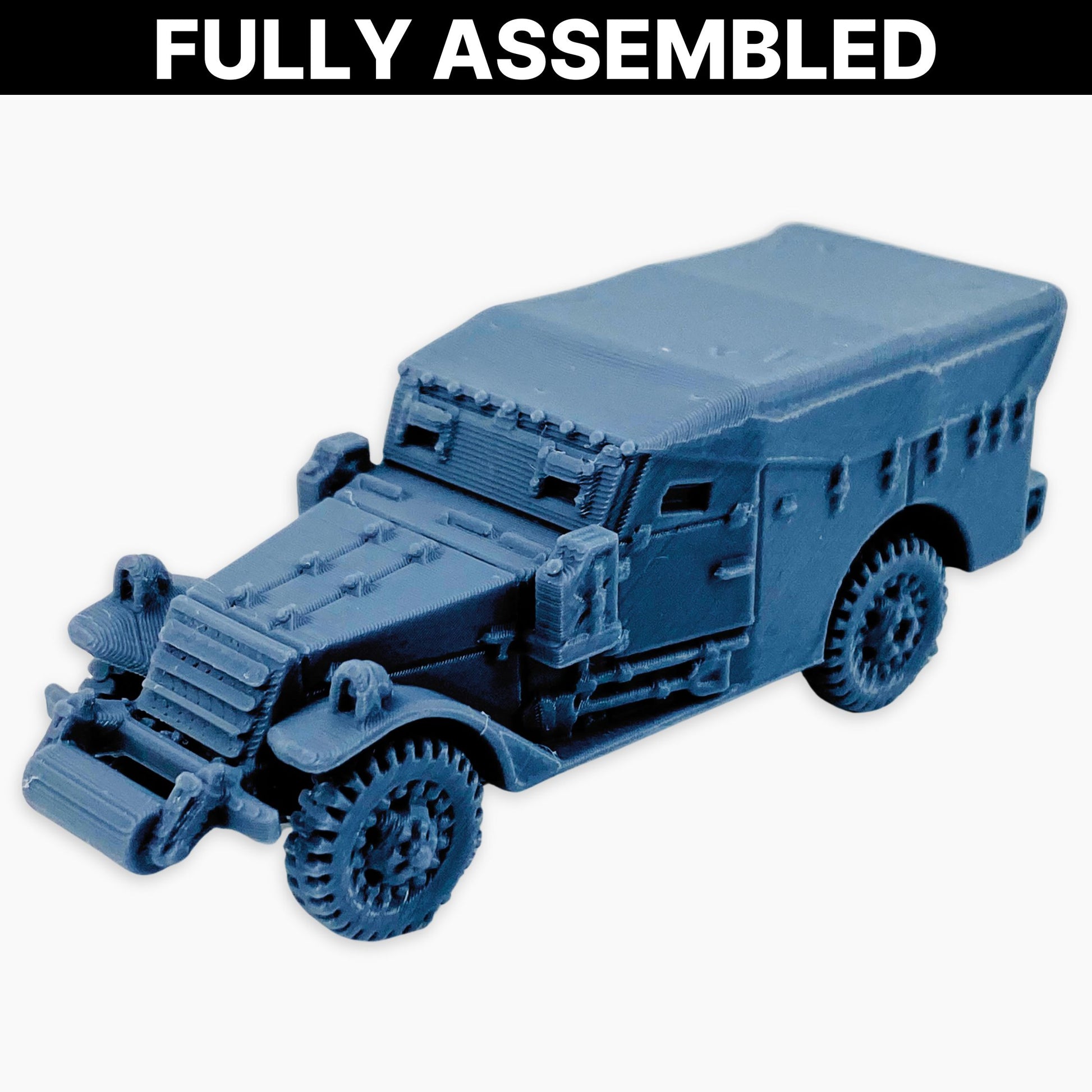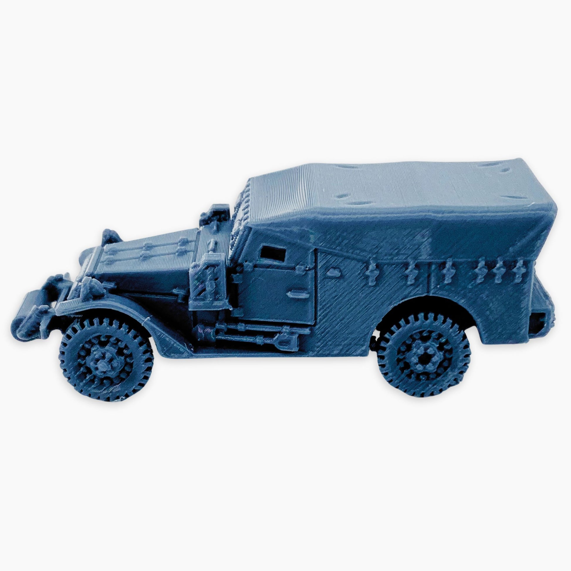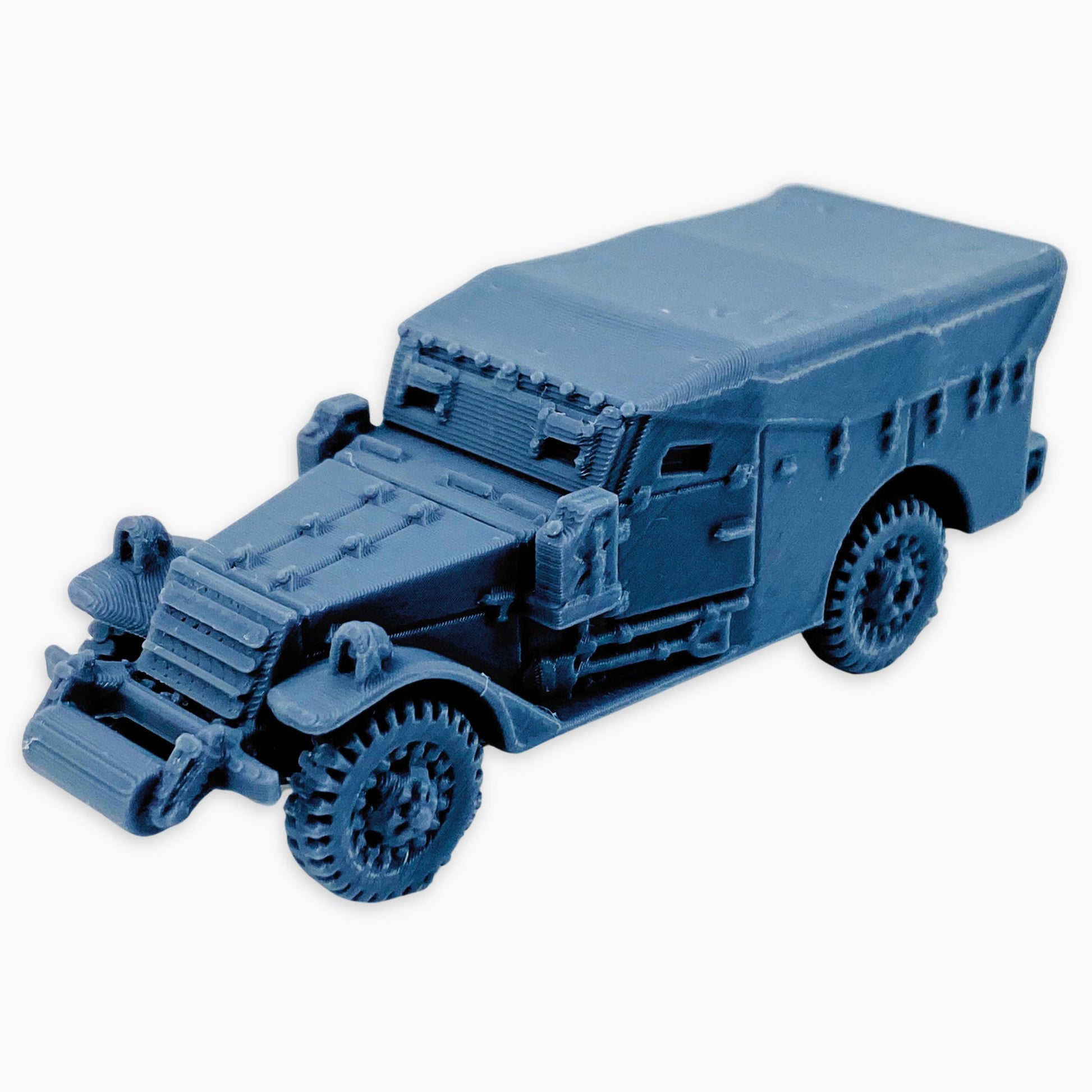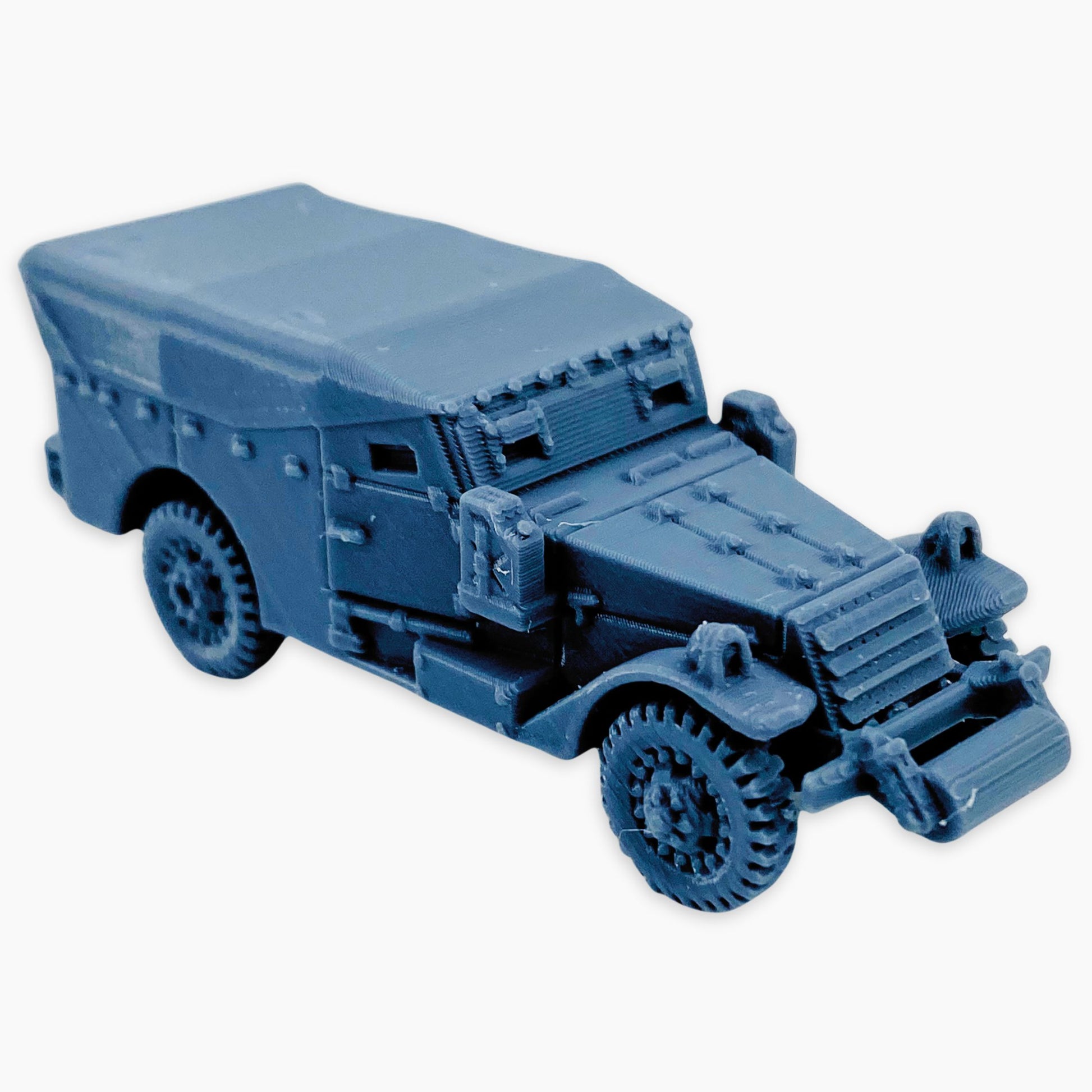 The M3A1 Scout Car (covered roller) miniature features a canvas-covered troop compartment and a front-mounted roller. The roller attachment helped the vehicle traverse rough or obstructed terrain, while the cover provided some shelter for the crew during operations.