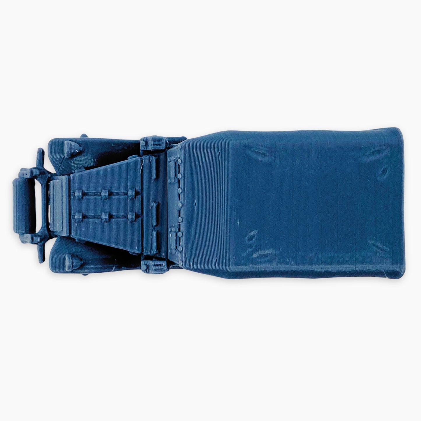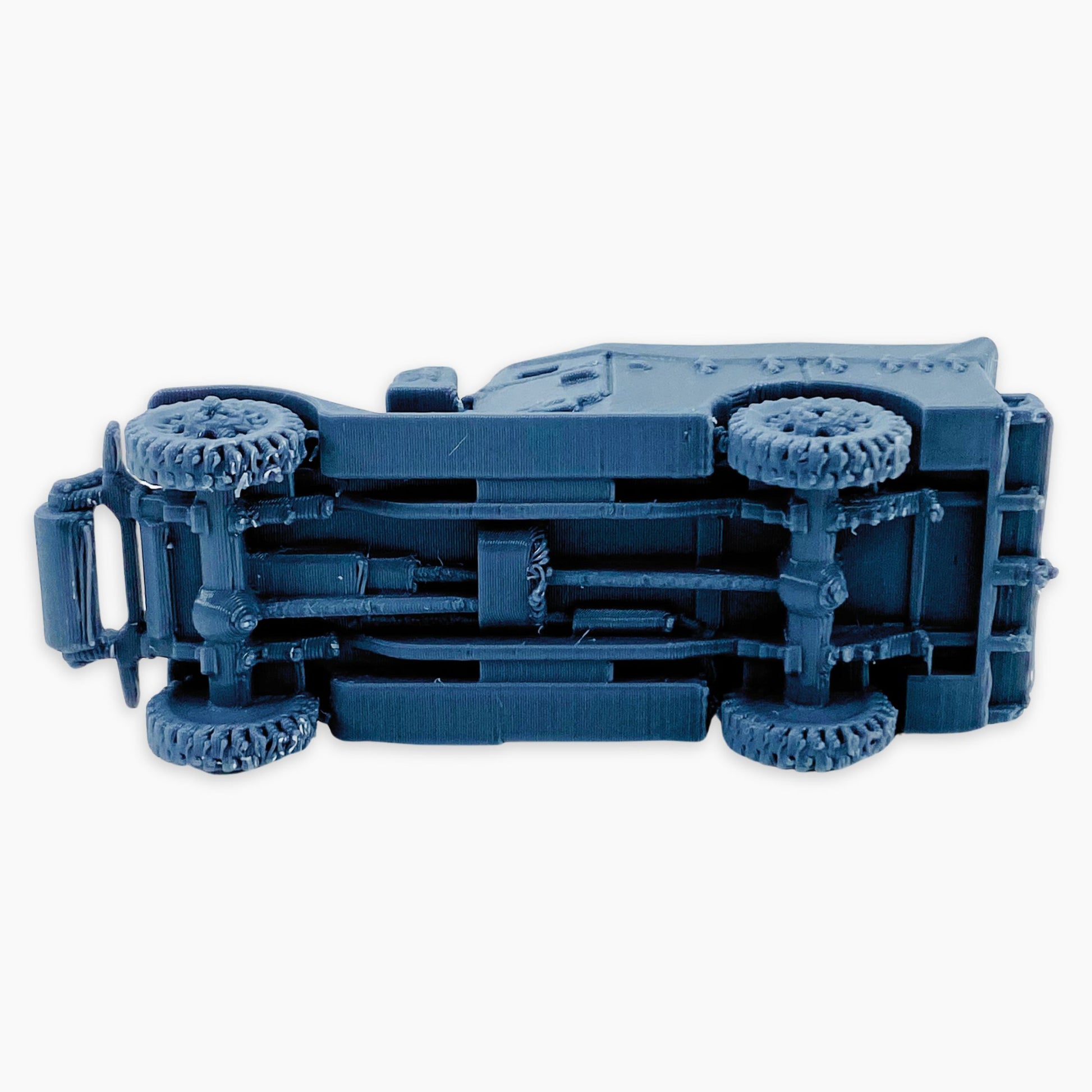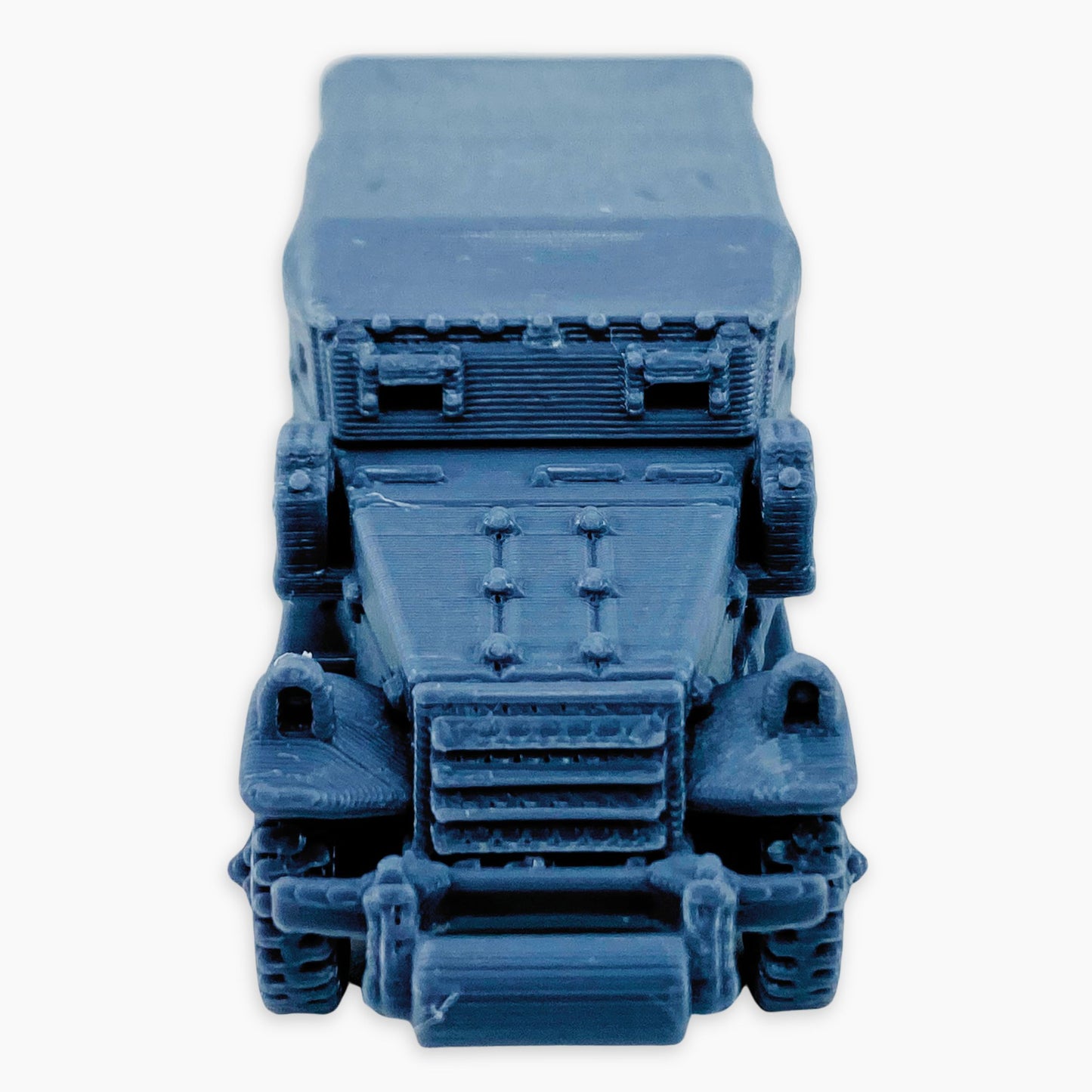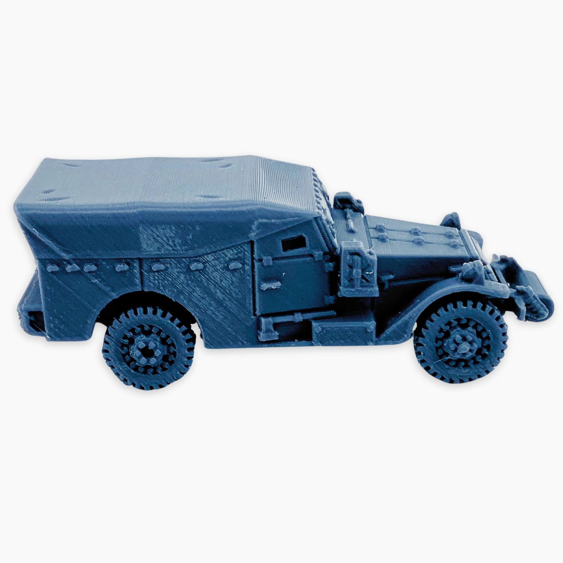 The M3A1 Scout Car (covered roller) miniature features a canvas-covered troop compartment and a front-mounted roller. The roller attachment helped the vehicle traverse rough or obstructed terrain, while the cover provided some shelter for the crew during operations.