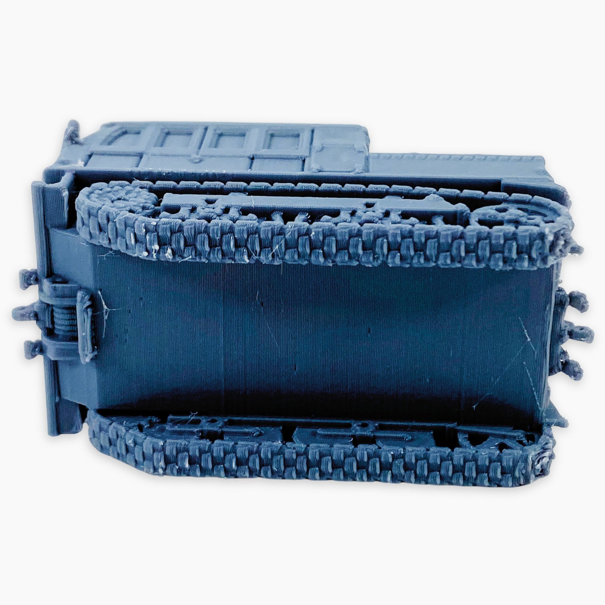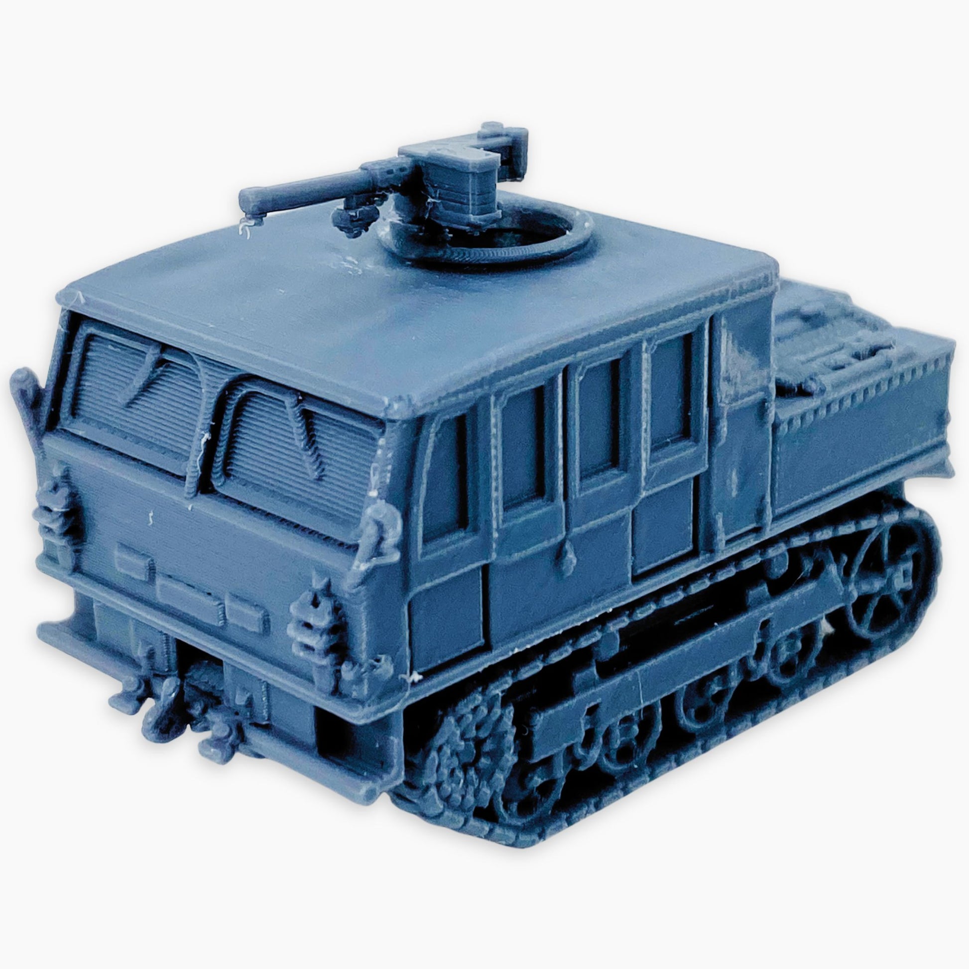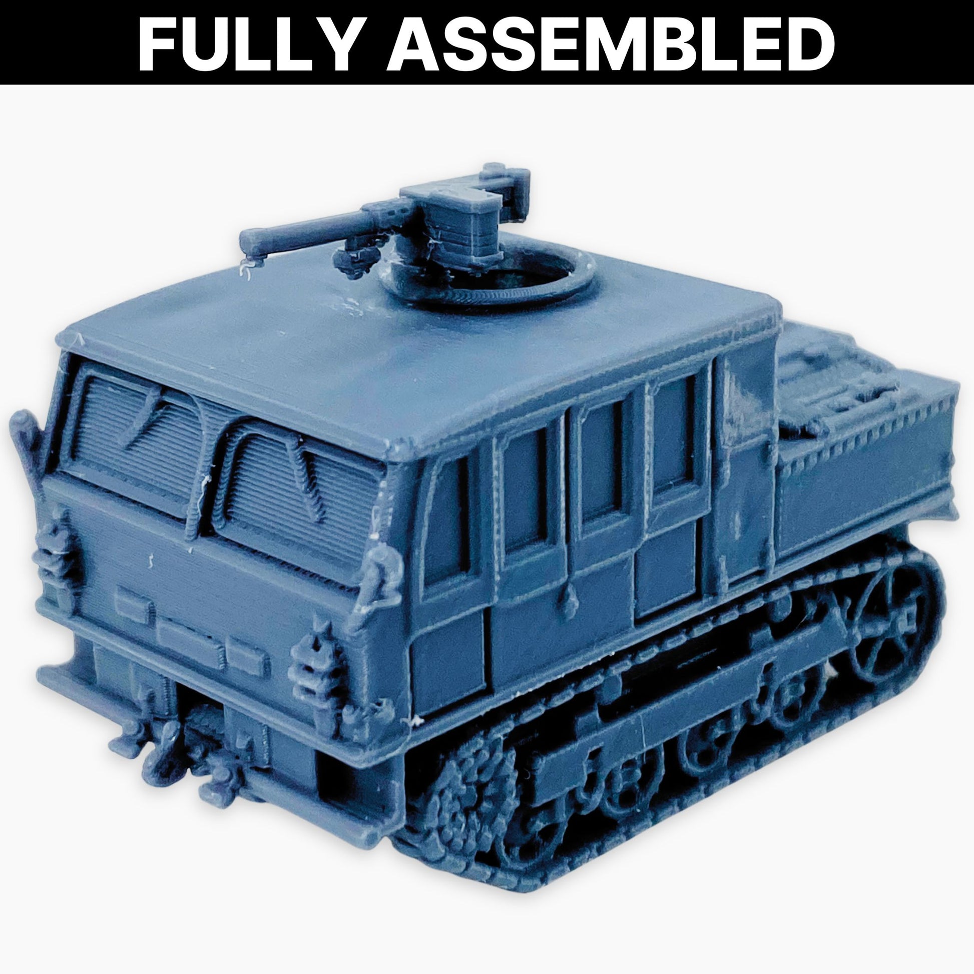 M5A1 High Speed Tractor (full covered) miniature, representing the improved American tracked artillery tractor with a fully enclosed canvas cover over the crew and cargo areas, equipped with a mounted machine gun. Designed to tow heavy artillery such as 105 mm and 155 mm guns while transporting crew and ammunition, the fully covered configuration offered maximum protection from weather and battlefield conditions. This 2-piece model includes the machine gun separately, which requires gluing for final assembly. Ideal for dioramas, wargaming scenery, or WWII vehicle collections in multiple scales.