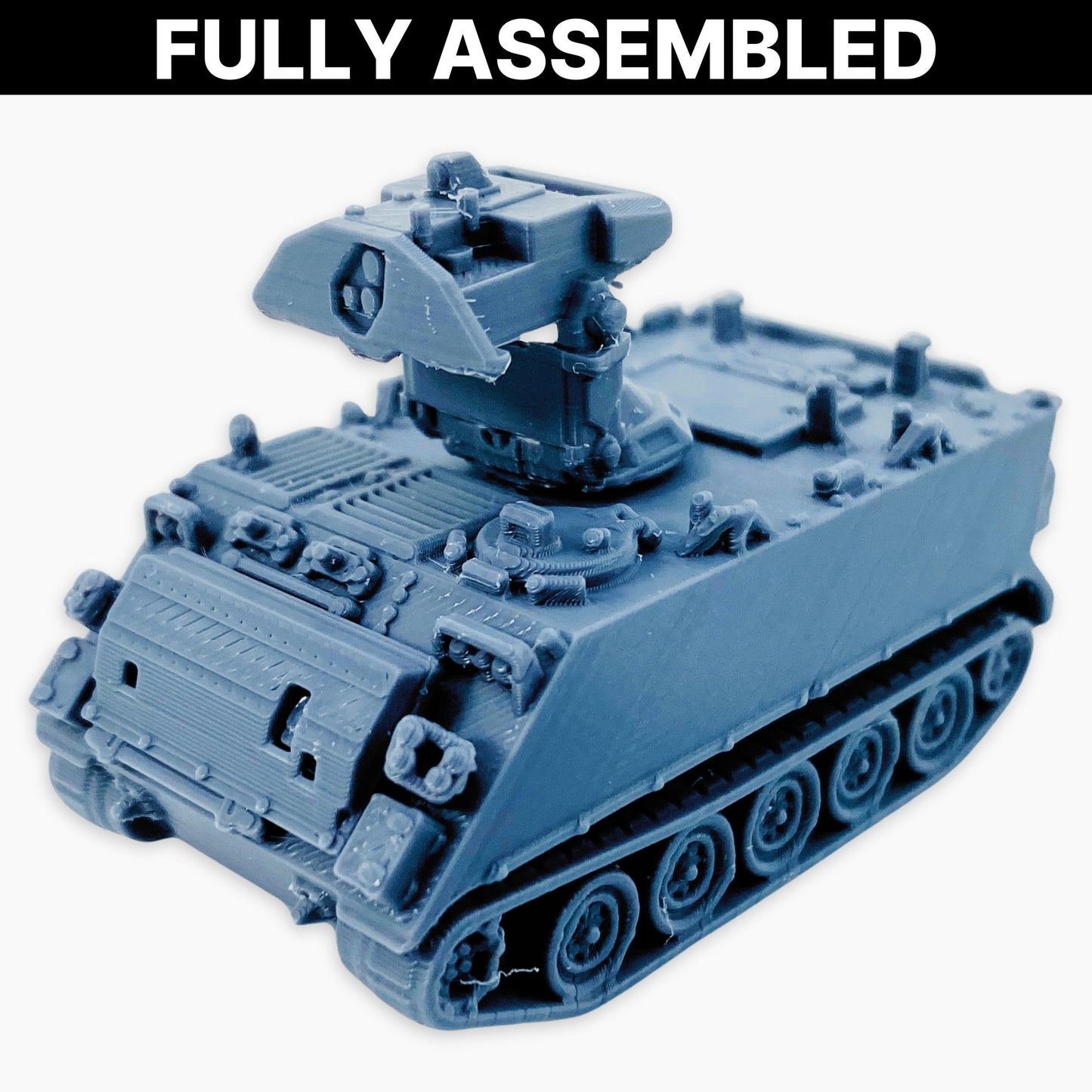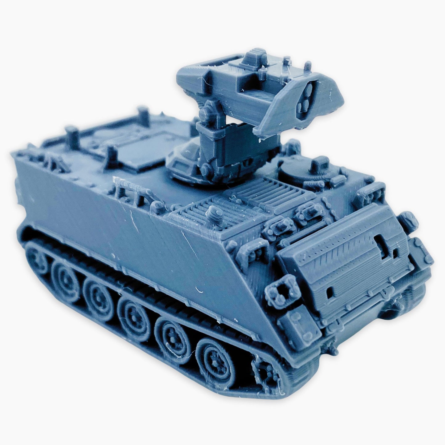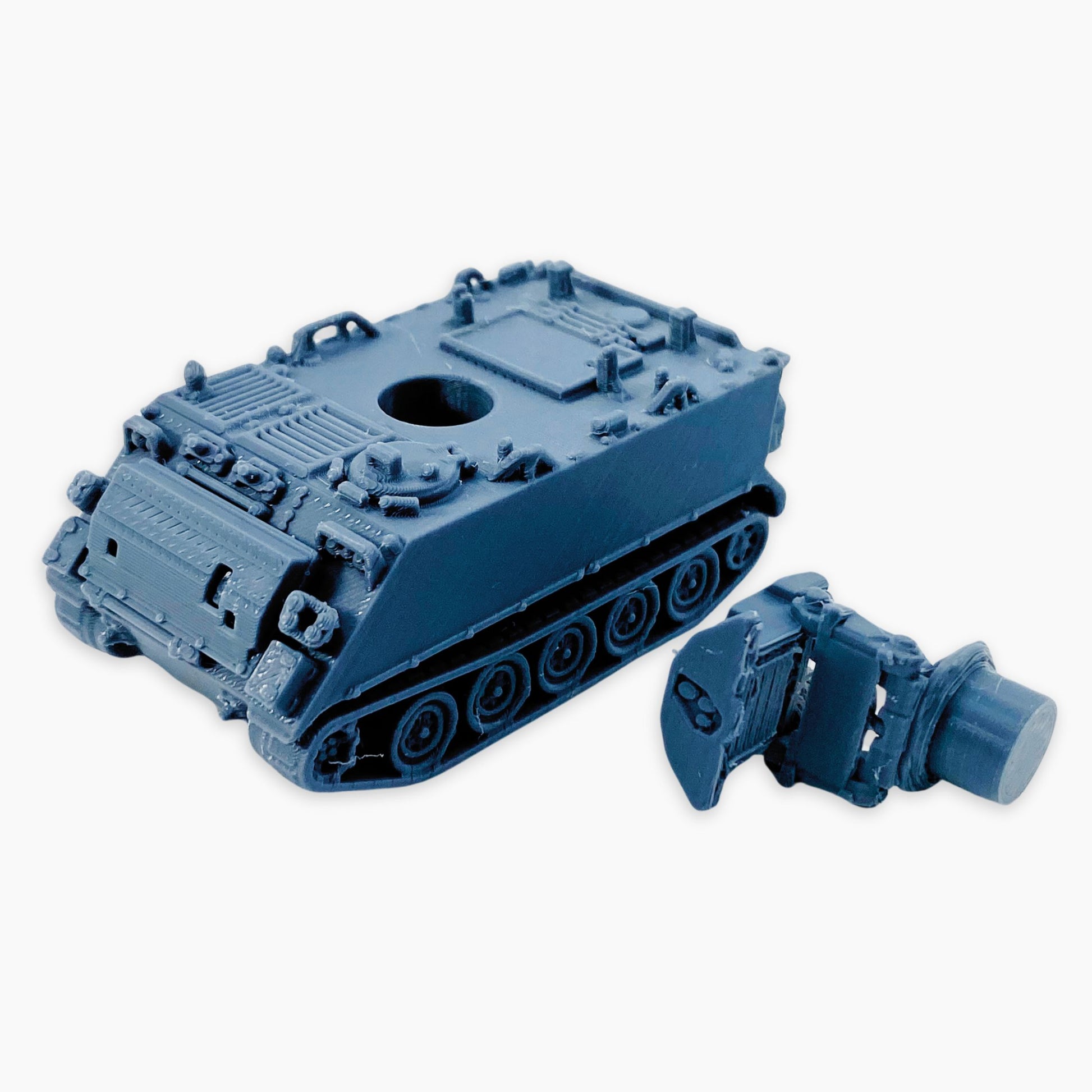 The M901 ITV miniature represents a U.S. Army Improved TOW Vehicle based on the M113 chassis. It features a distinctive dual-tube TOW missile launcher mounted on a rotating turret, designed to engage armored targets from cover. The launcher can be retracted into the hull when not in use, and the vehicle retains the mobility and amphibious capabilities of the original M113.