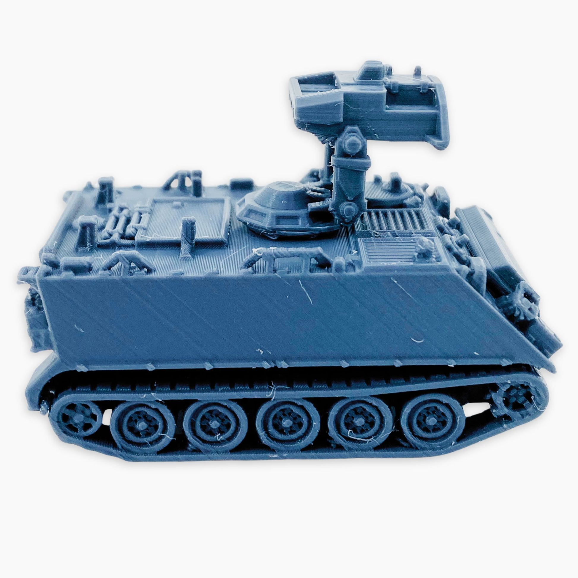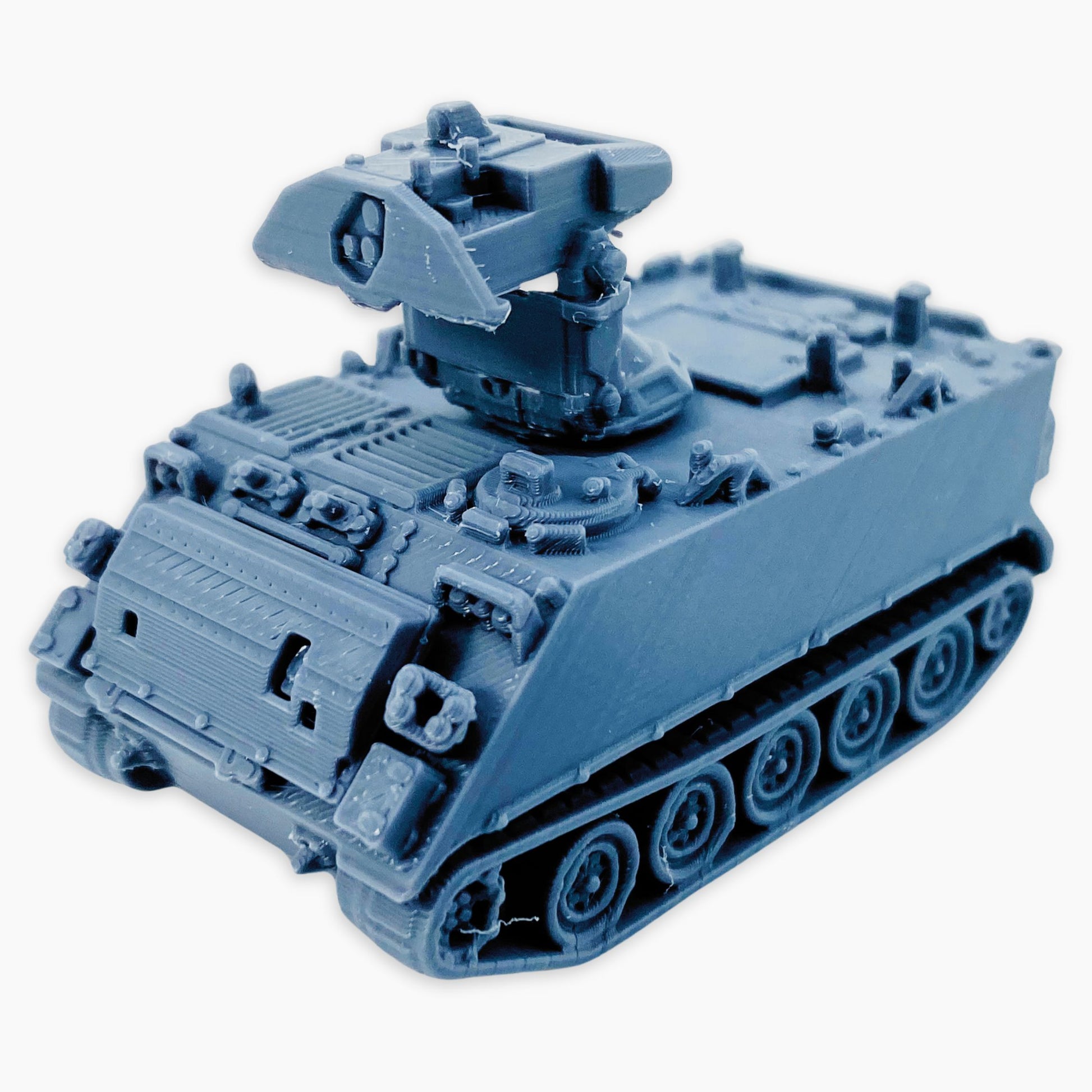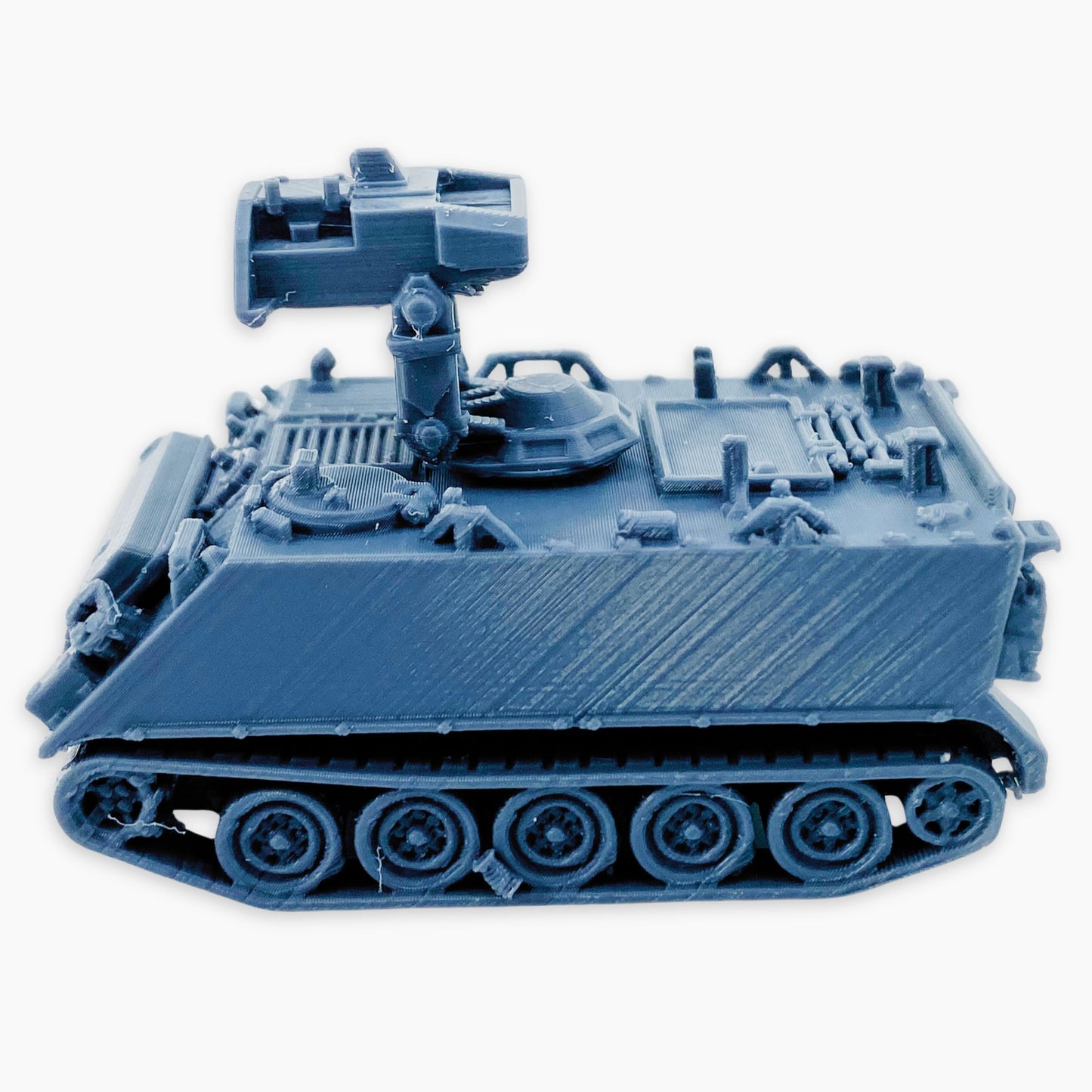 The M901 ITV miniature represents a U.S. Army Improved TOW Vehicle based on the M113 chassis. It features a distinctive dual-tube TOW missile launcher mounted on a rotating turret, designed to engage armored targets from cover. The launcher can be retracted into the hull when not in use, and the vehicle retains the mobility and amphibious capabilities of the original M113.