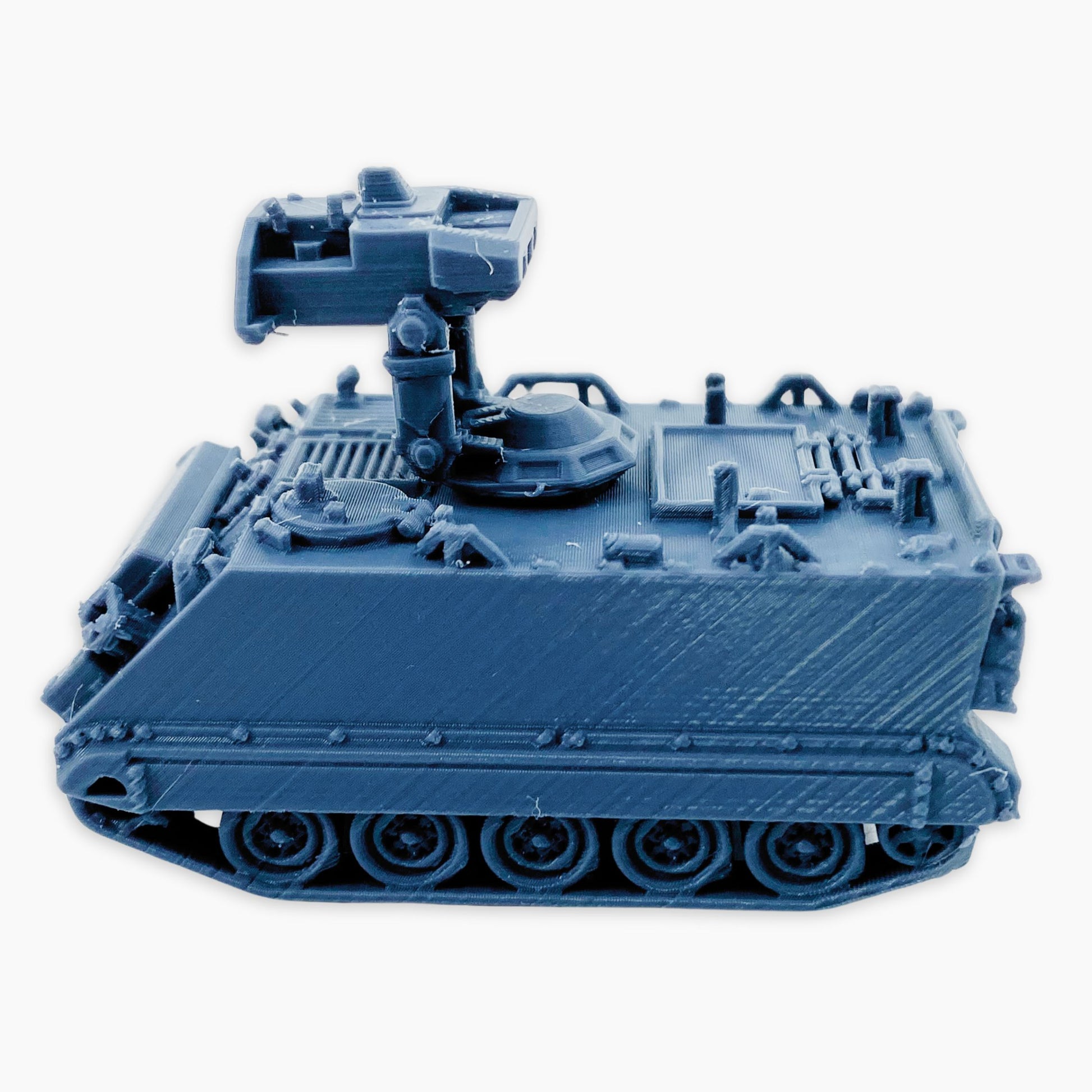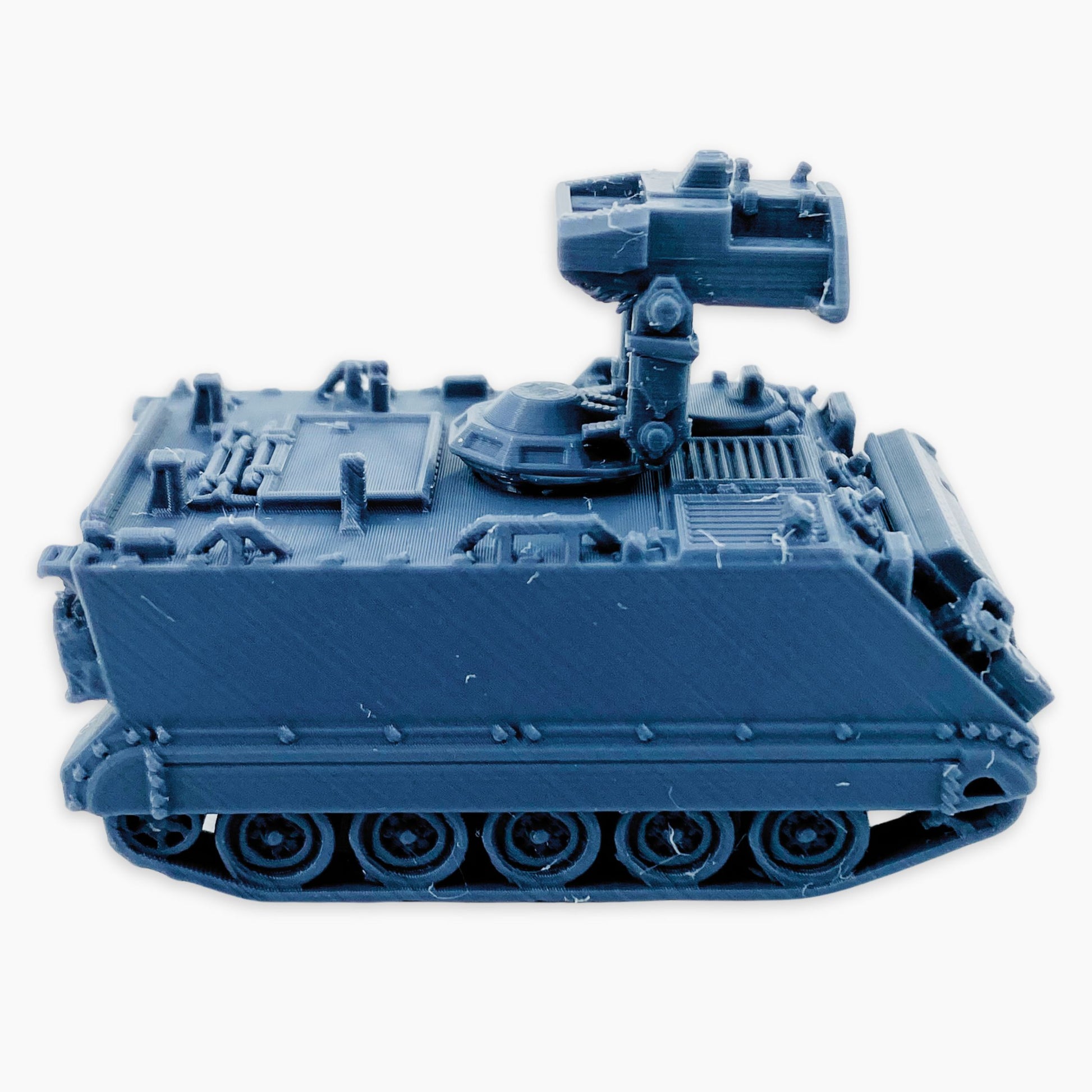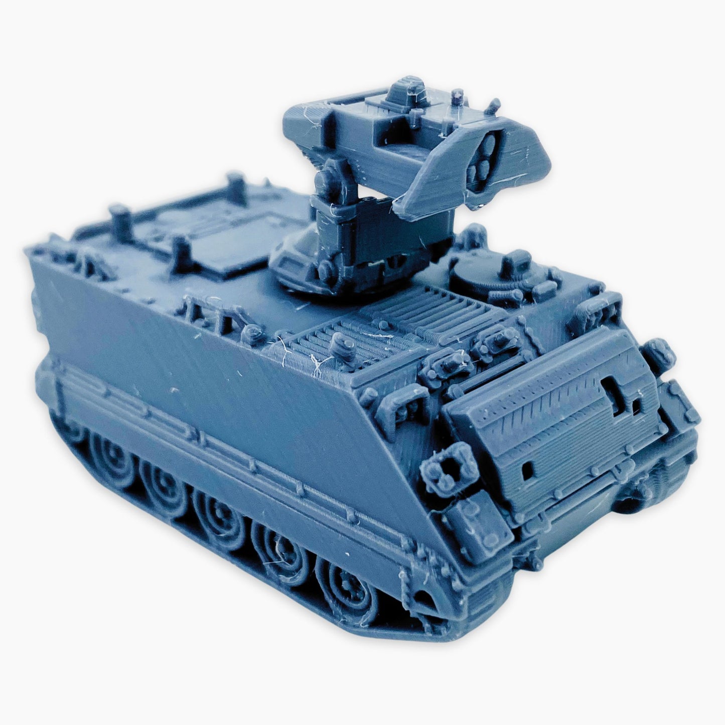 The M901 ITV (skirts) miniature depicts the Improved TOW Vehicle equipped with additional side skirts for enhanced protection. Built on the M113 chassis, it mounts a dual-tube TOW missile launcher capable of retracting into the hull. The skirts provide extra shielding against small arms and shrapnel while maintaining the vehicle’s mobility and amphibious functions.