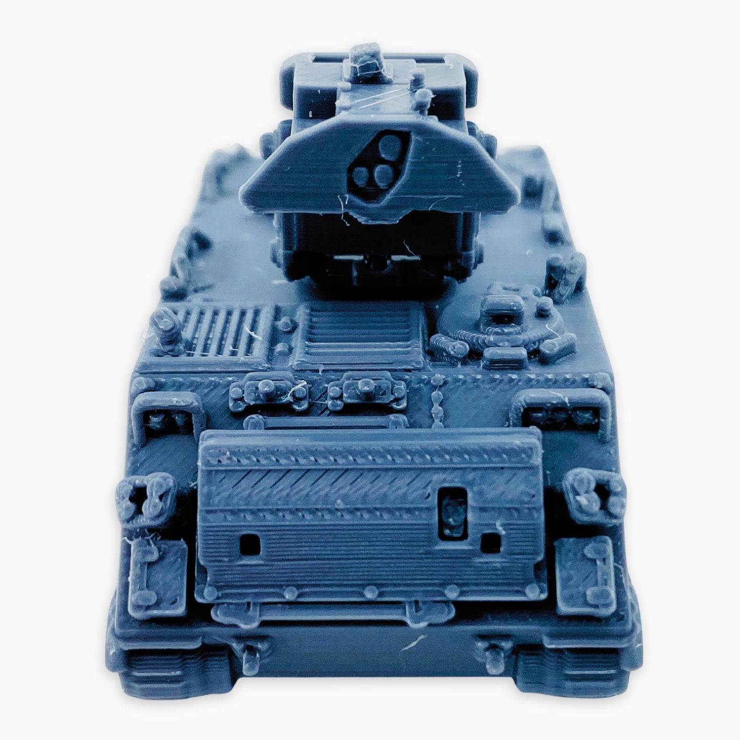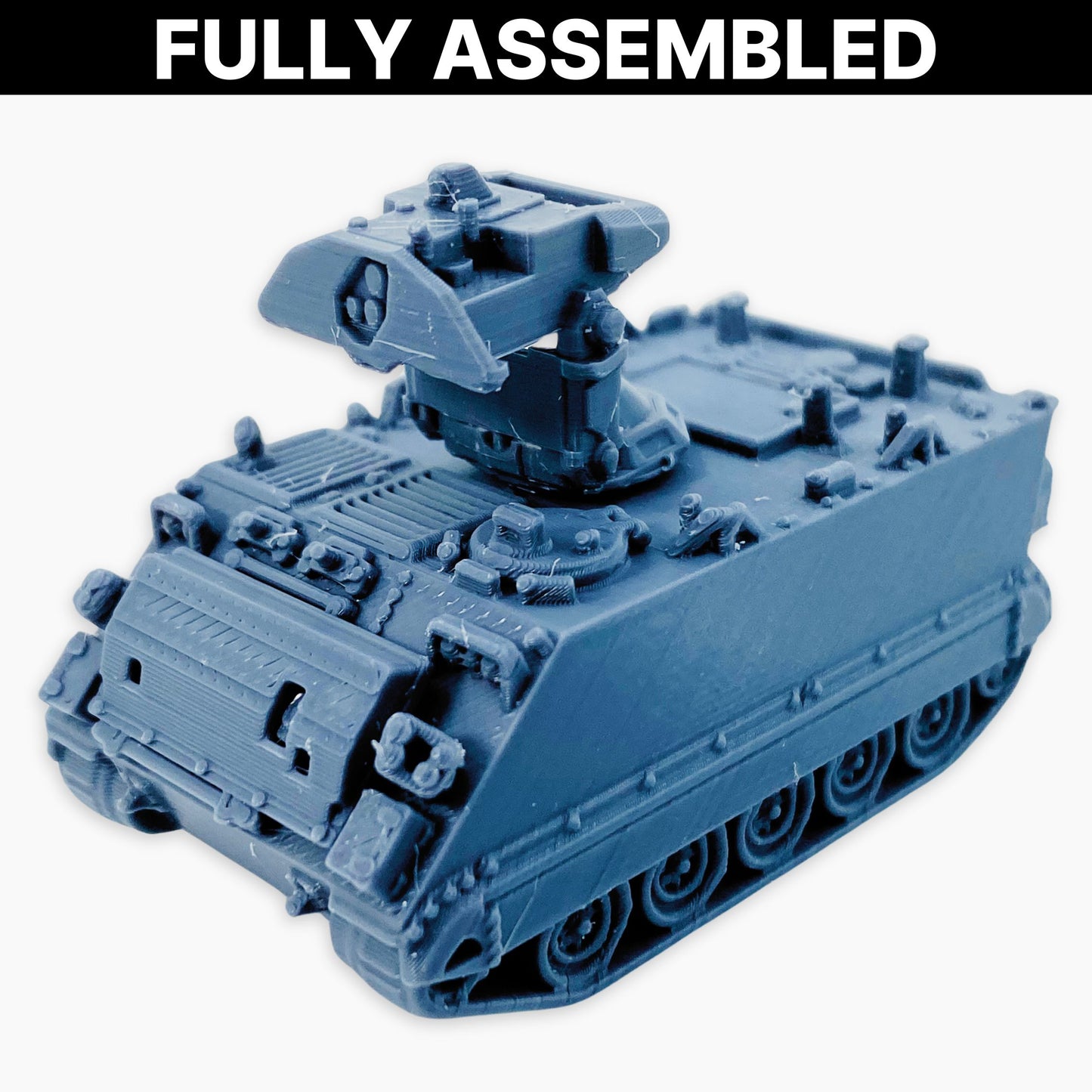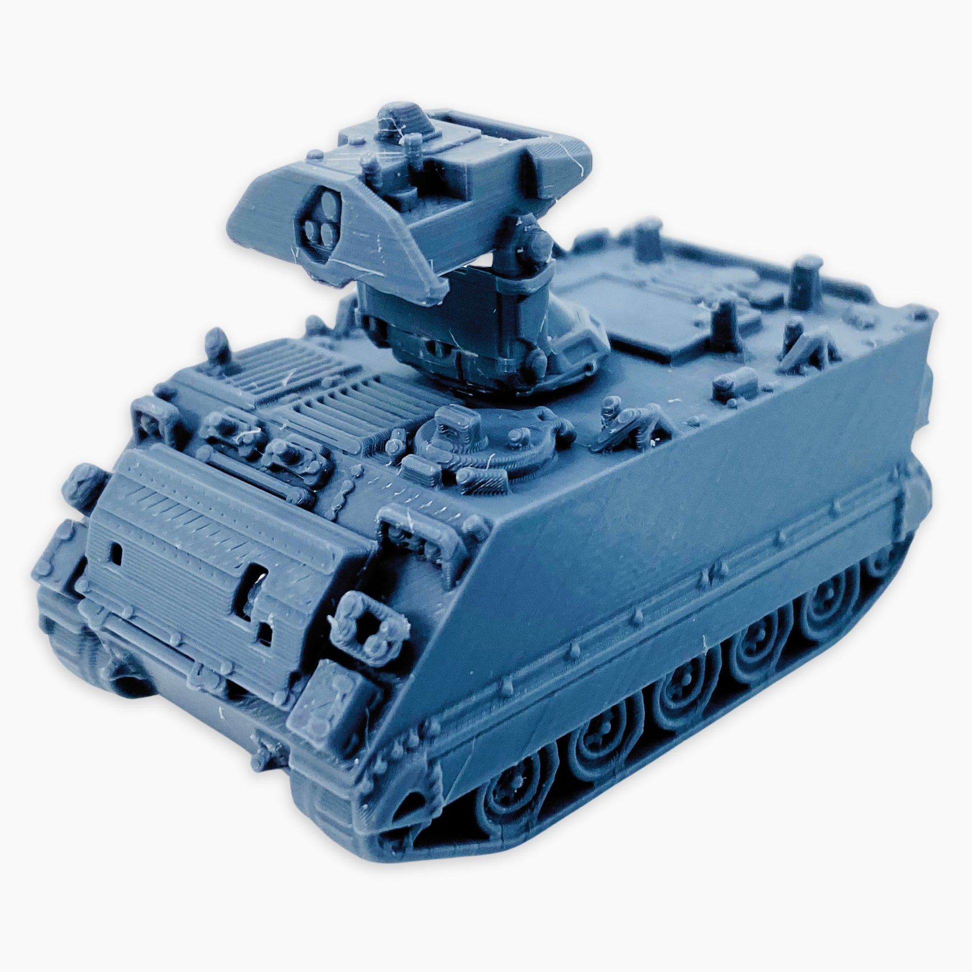 The M901 ITV (skirts) miniature depicts the Improved TOW Vehicle equipped with additional side skirts for enhanced protection. Built on the M113 chassis, it mounts a dual-tube TOW missile launcher capable of retracting into the hull. The skirts provide extra shielding against small arms and shrapnel while maintaining the vehicle’s mobility and amphibious functions.