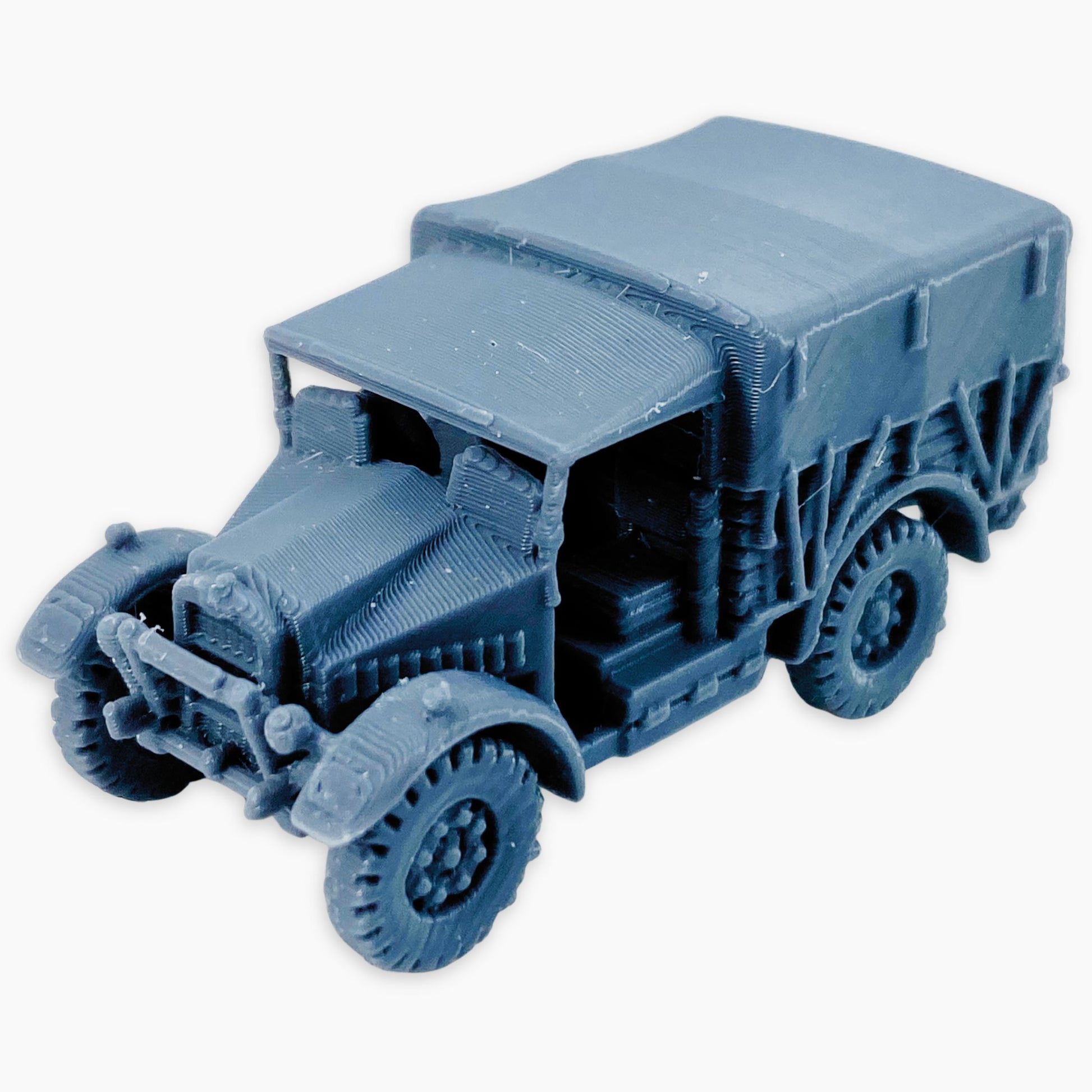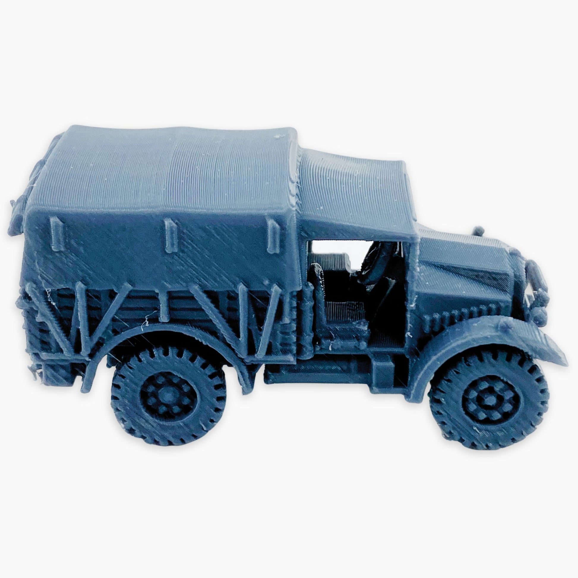 This version of the Morris CS8 features a canvas-covered rear compartment and side doors on the cab, offering both crew protection and weather shielding for cargo or passengers. Commonly used by British and Commonwealth forces throughout WWII, this configuration was ideal for transporting supplies or personnel across varied theaters, from desert convoys to European frontlines. A practical addition to your tabletop force or diorama setup, representing essential behind-the-lines support vehicles.