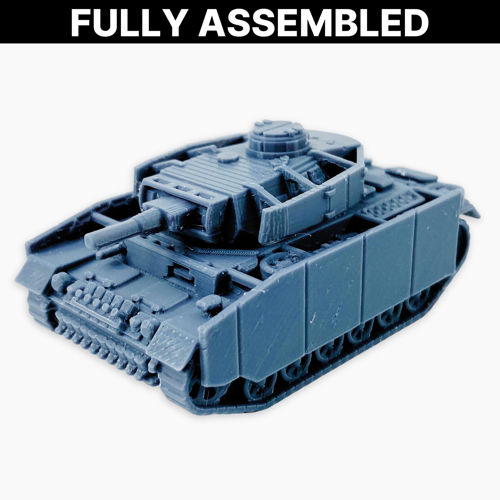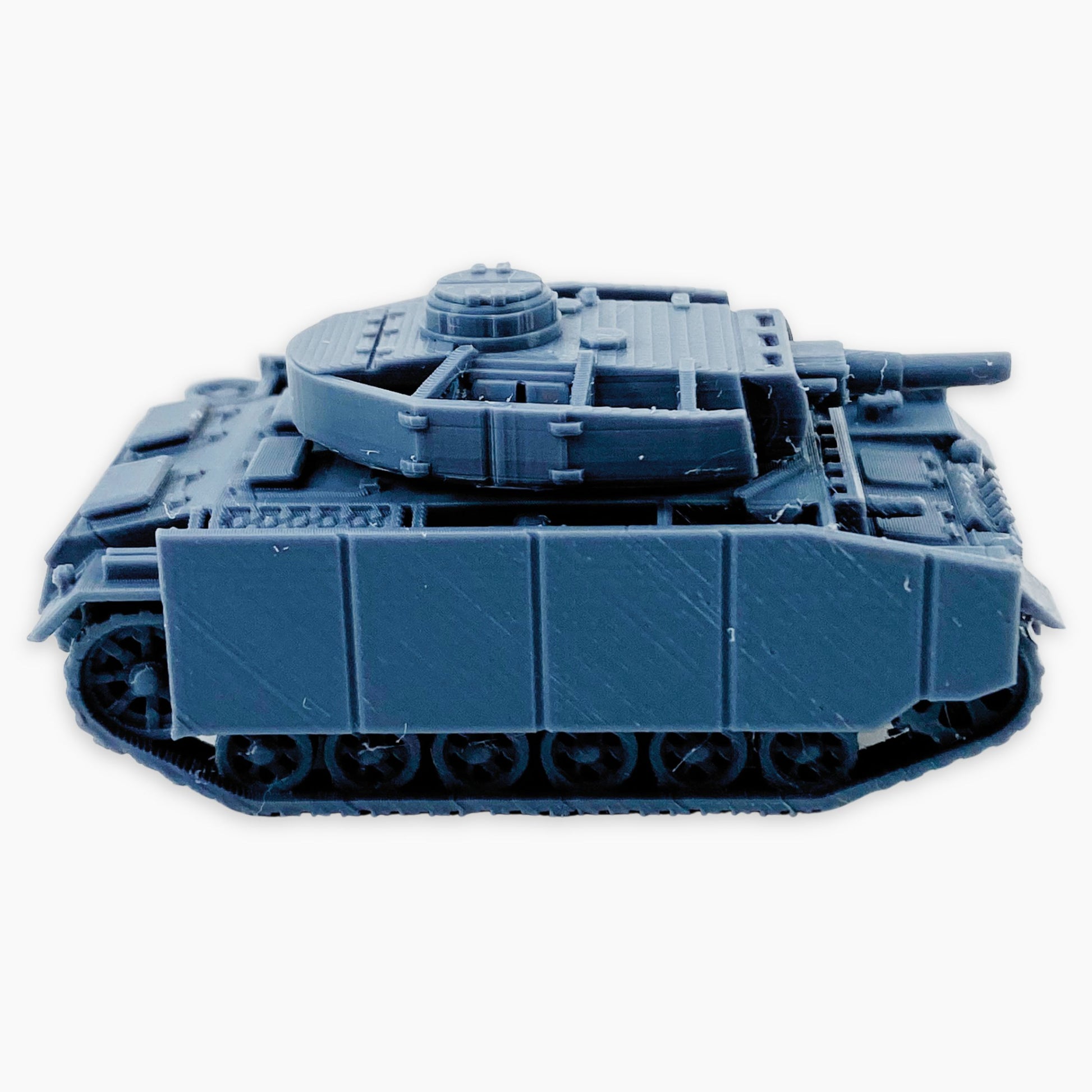 Panzer III Ausf. J (schürzen frame) miniature, depicting the German medium tank fitted with the protective framework for side armor skirts (schürzen) used during World War II. This model focuses on the structural elements that supported the skirts, showing the tank in its modified configuration before the armor plates were fully installed. Highly detailed with accurate hull, turret, and track features, it is ideal for dioramas, wargaming scenery, or historical collections. Perfect for World War II tabletop battles or display in multiple scales.
