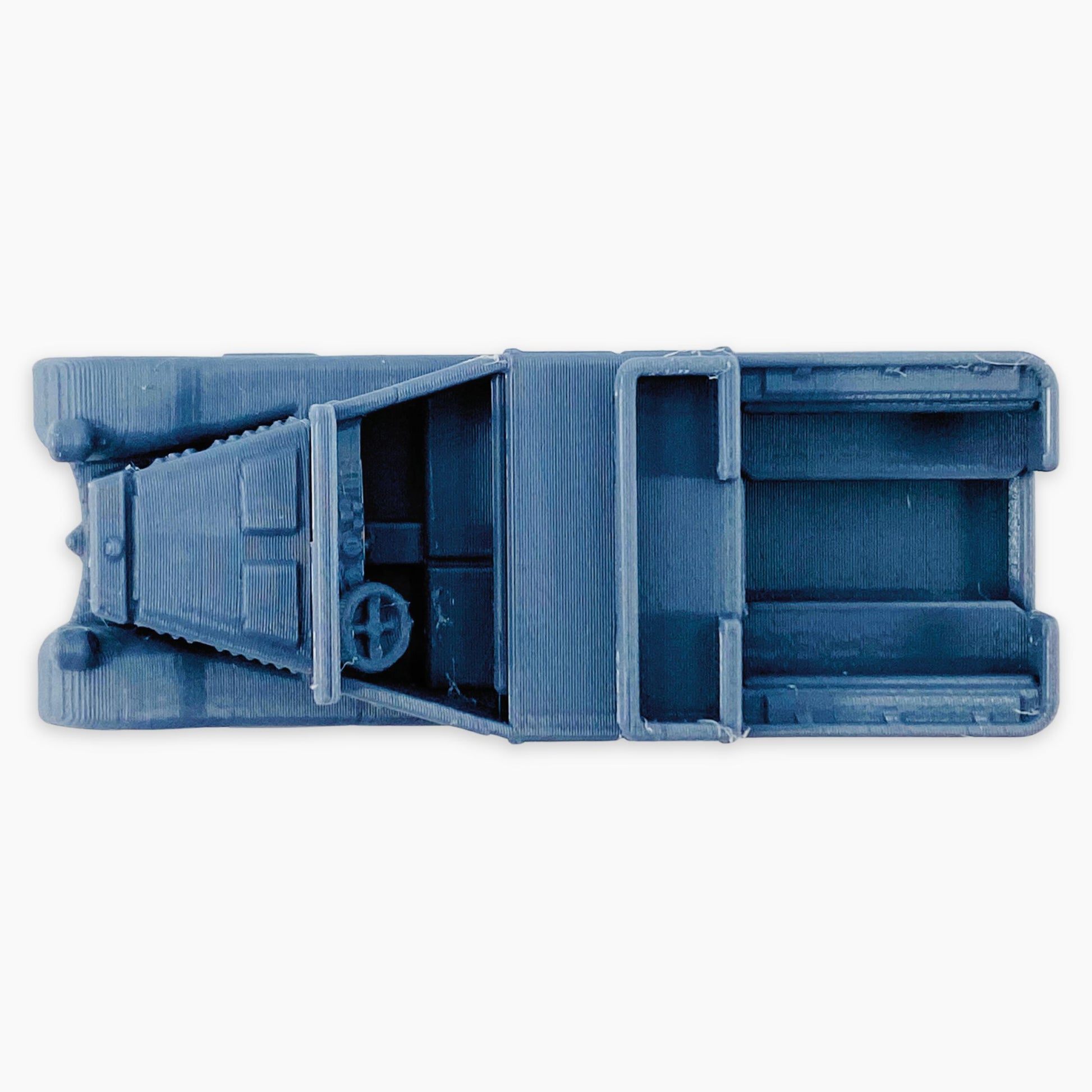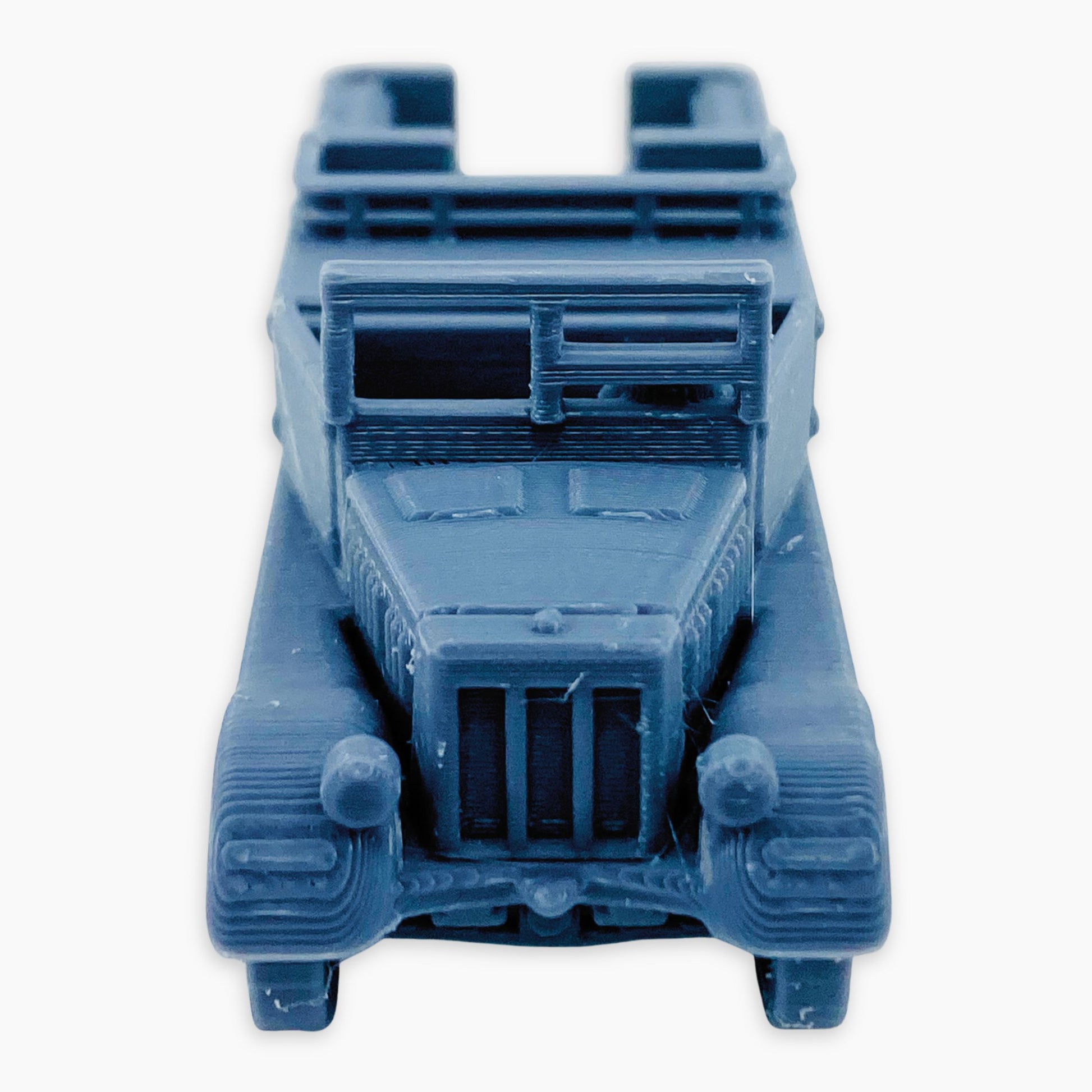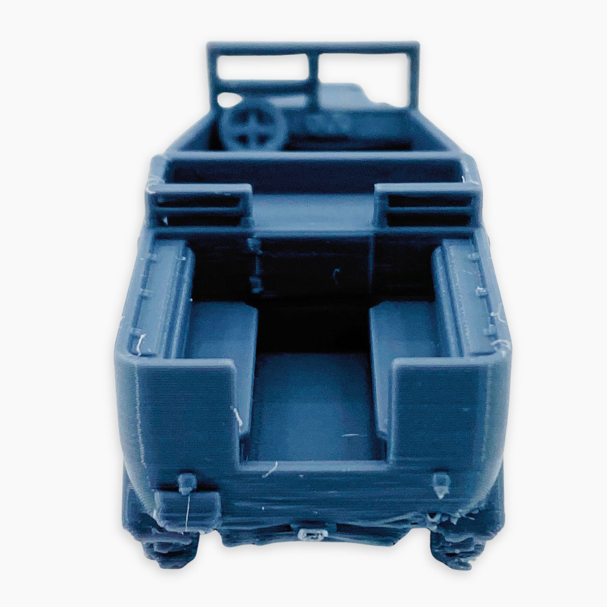 A versatile German half-track used extensively during World War II, the Sd.Kfz. 11 was primarily designed for towing medium artillery and transporting troops. It features a distinctive open rear cargo area with bench seating and a detailed front cab, reflecting the functional, no-frills design typical of Wehrmacht logistics vehicles.