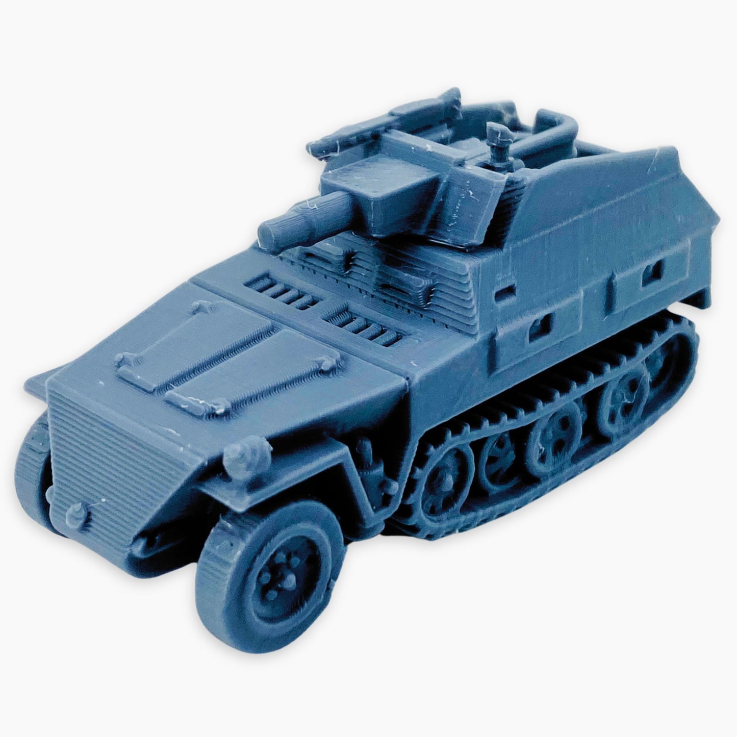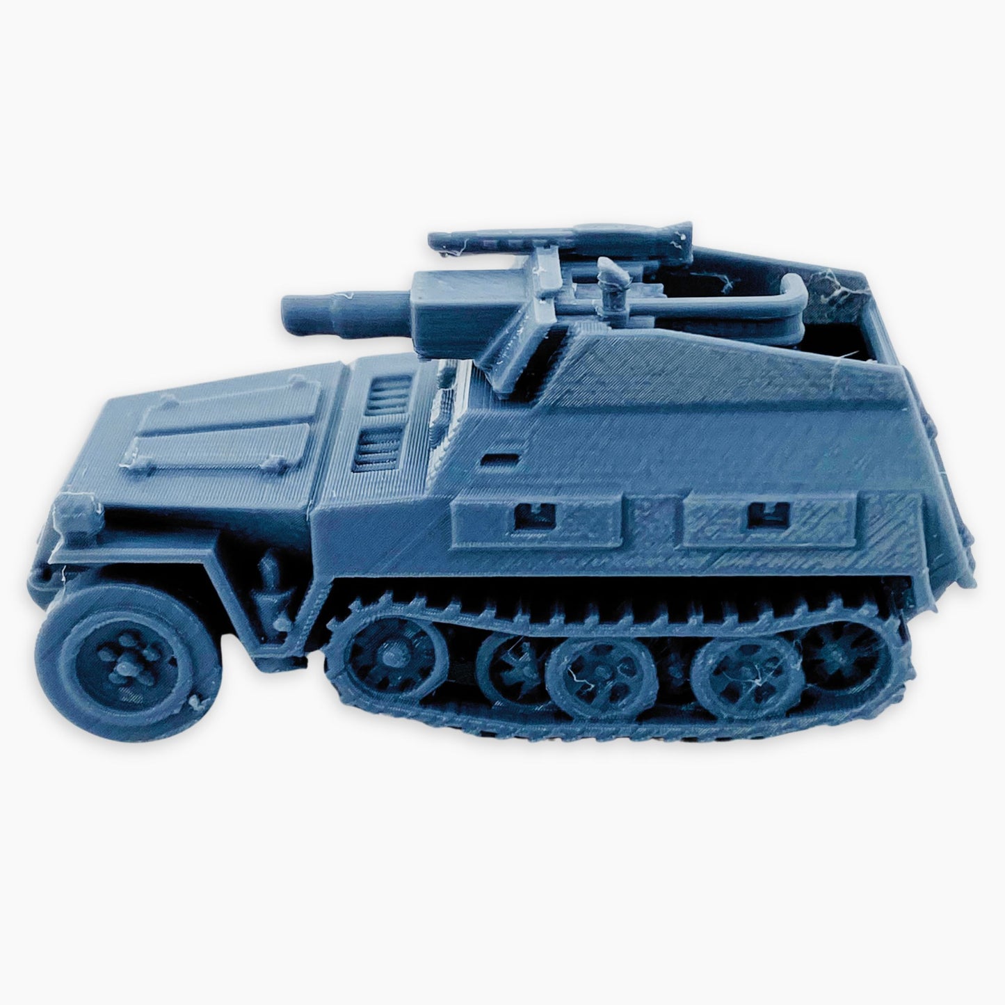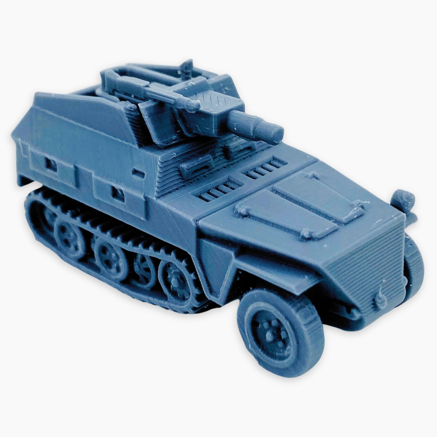 The Sd.Kfz. 250/B8 miniature depicts a German half-track configured as a command vehicle, typically used for coordinating artillery fire. It features a compact, open-topped design with internal equipment for communication and fire direction, making it essential for battlefield command and control during World War II.