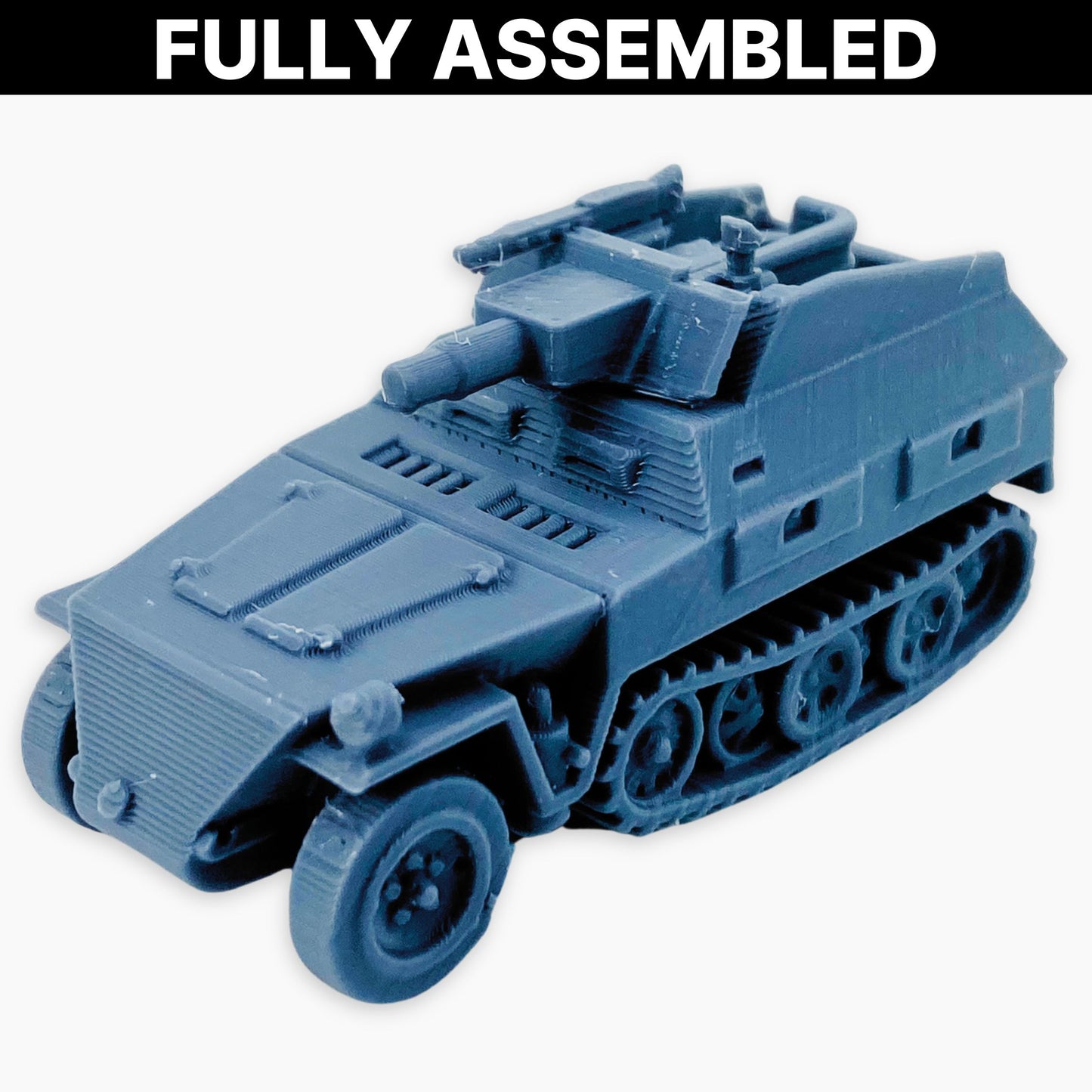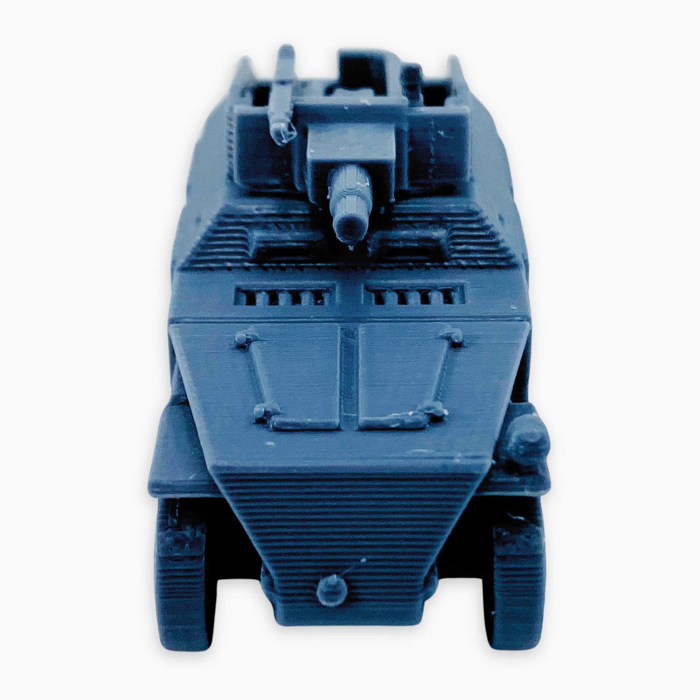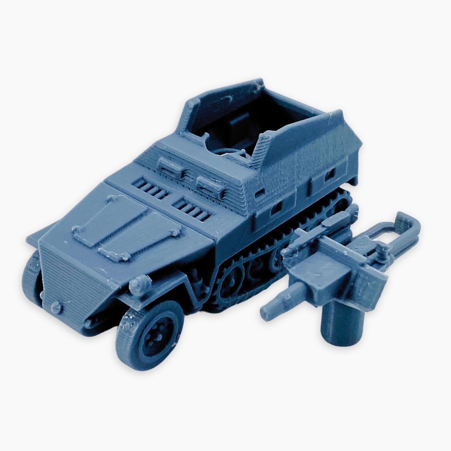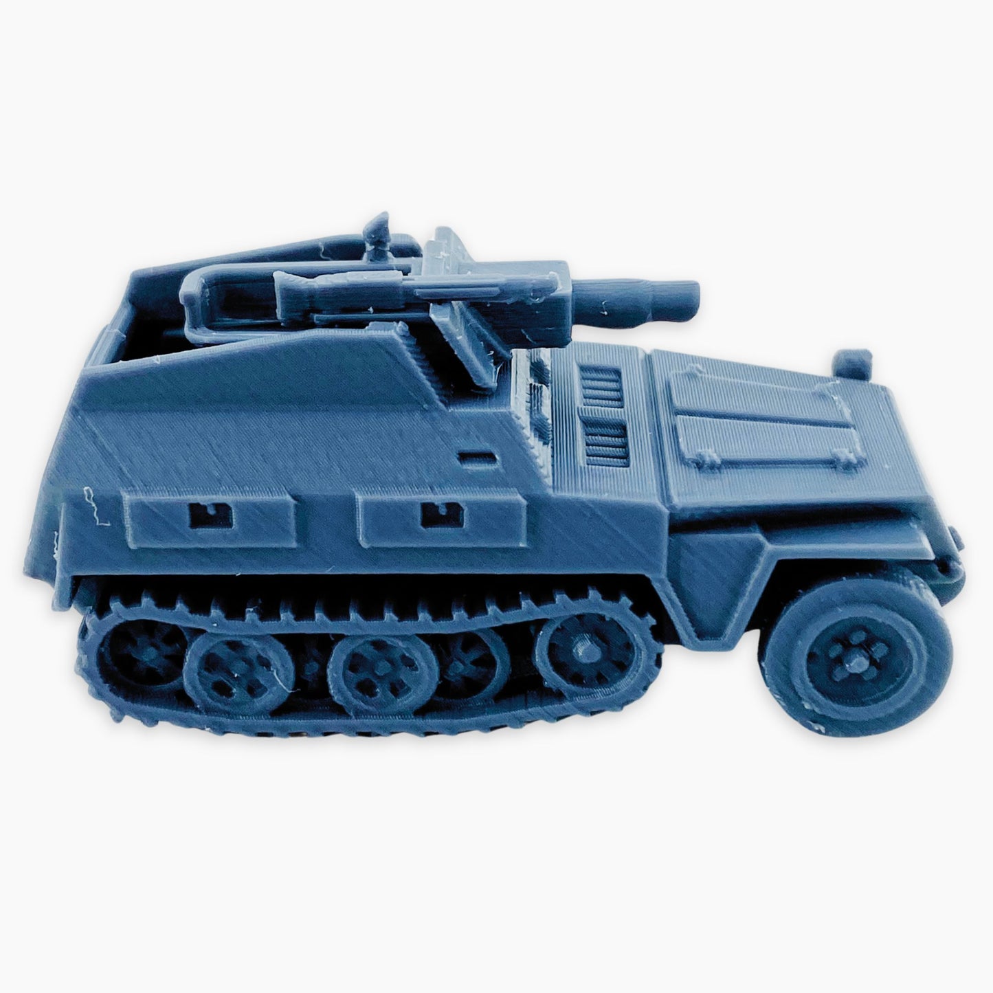 The Sd.Kfz. 250/B8 miniature depicts a German half-track configured as a command vehicle, typically used for coordinating artillery fire. It features a compact, open-topped design with internal equipment for communication and fire direction, making it essential for battlefield command and control during World War II.