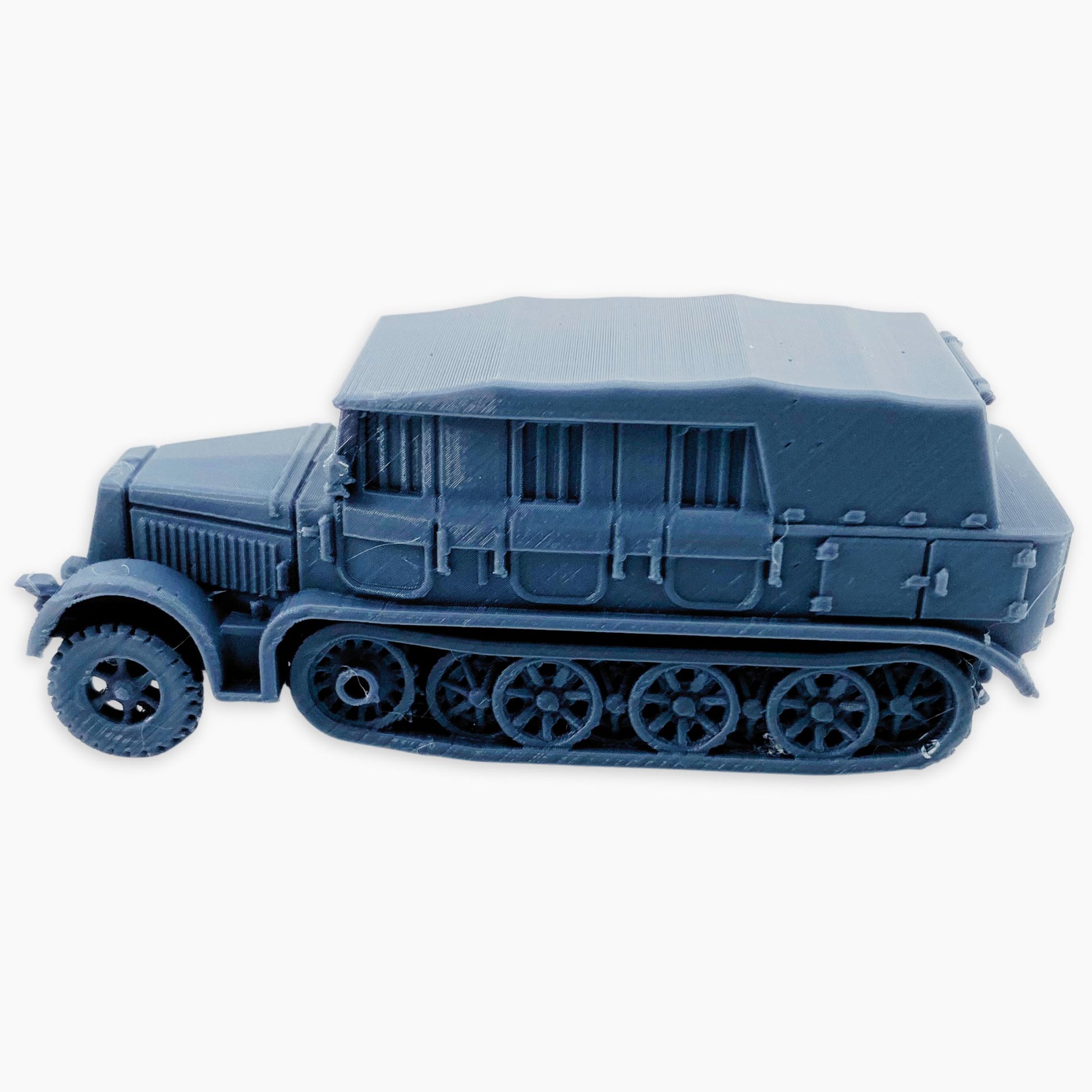 The Sd.Kfz. 7 (covered) was a versatile German half-track primarily used during World War II to tow heavy artillery like the 8.8cm Flak gun. This version features a canvas-covered passenger compartment, offering added protection from the elements for the crew. With its distinctive track-and-wheel configuration, it provided excellent mobility across difficult terrain while carrying up to 12 soldiers or equipment. Its robust design and reliability made it a staple in Wehrmacht motorized units throughout the war.