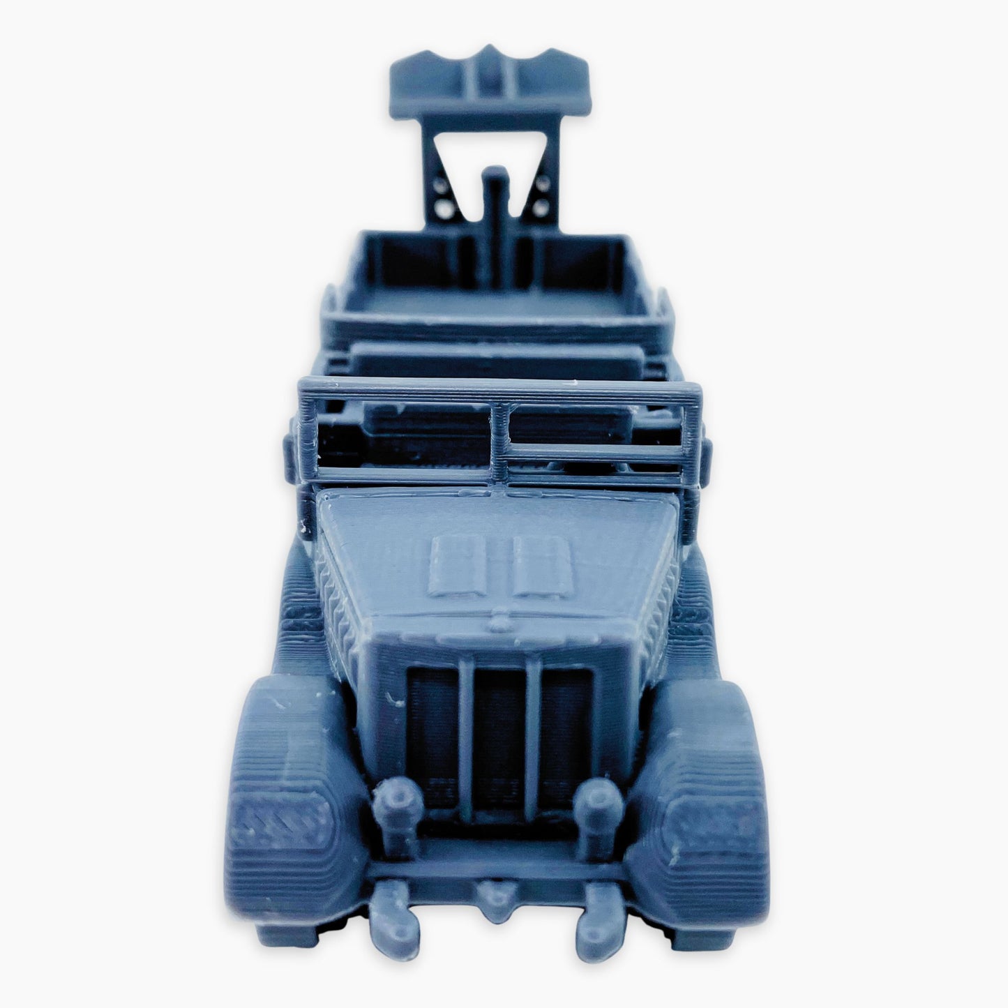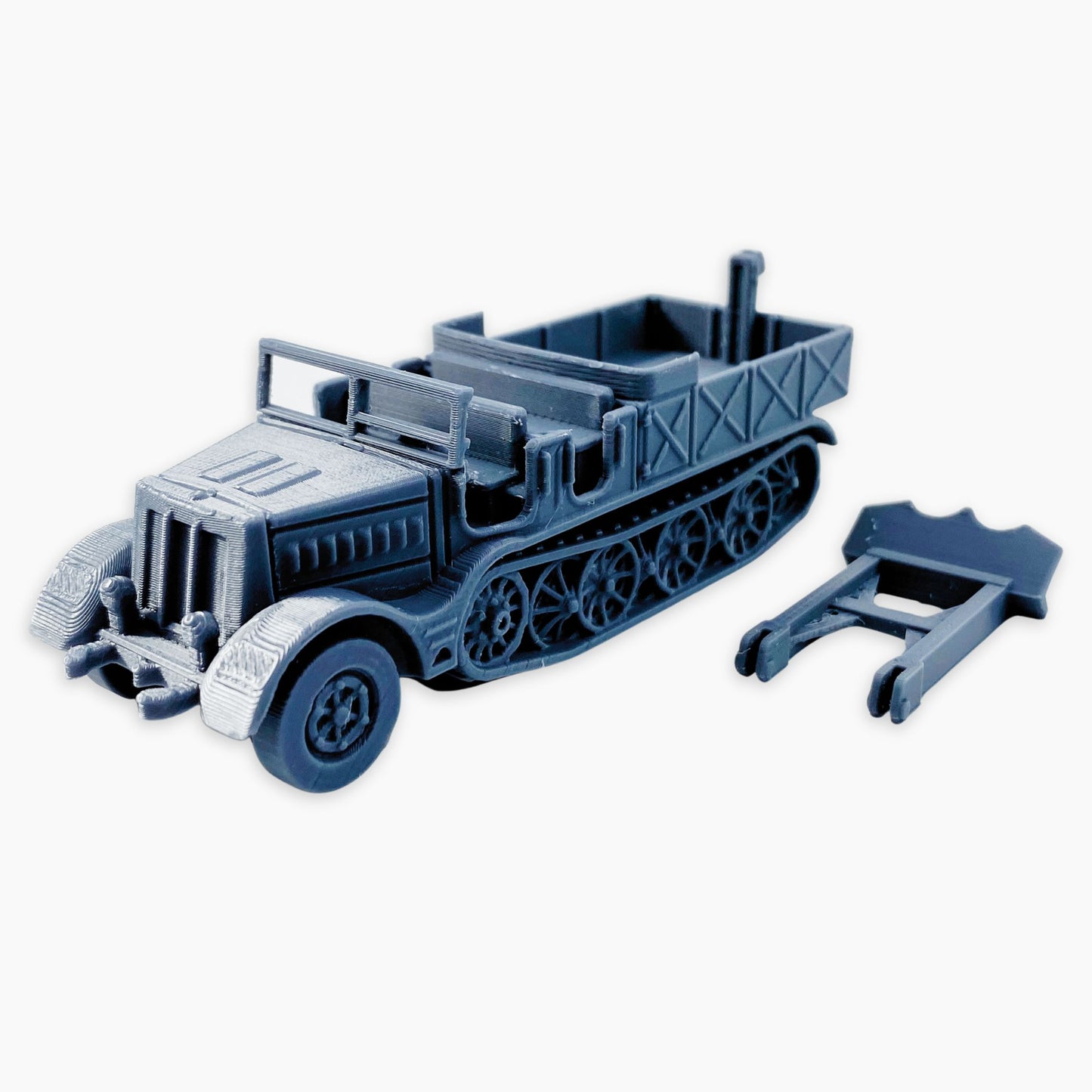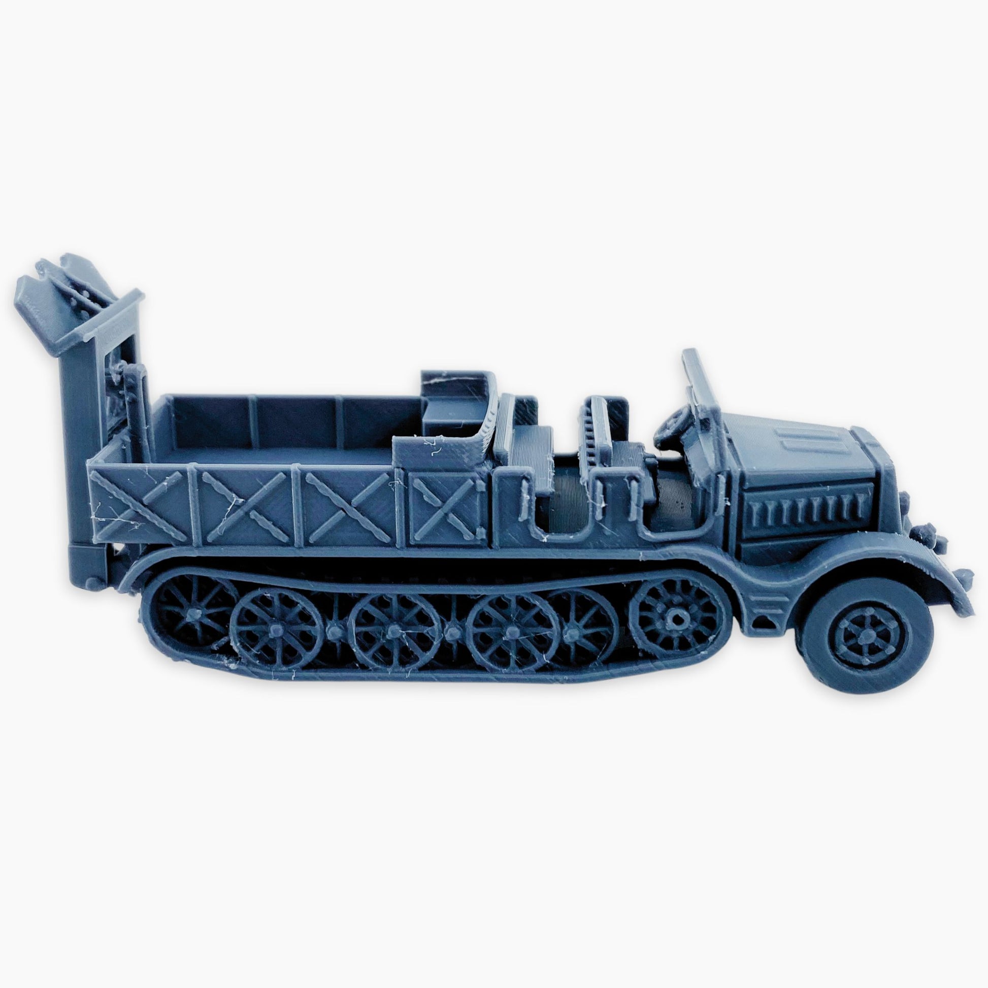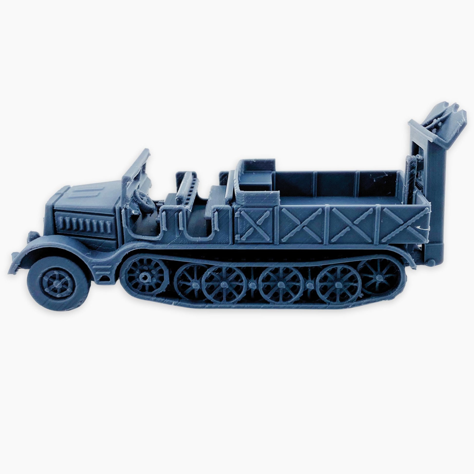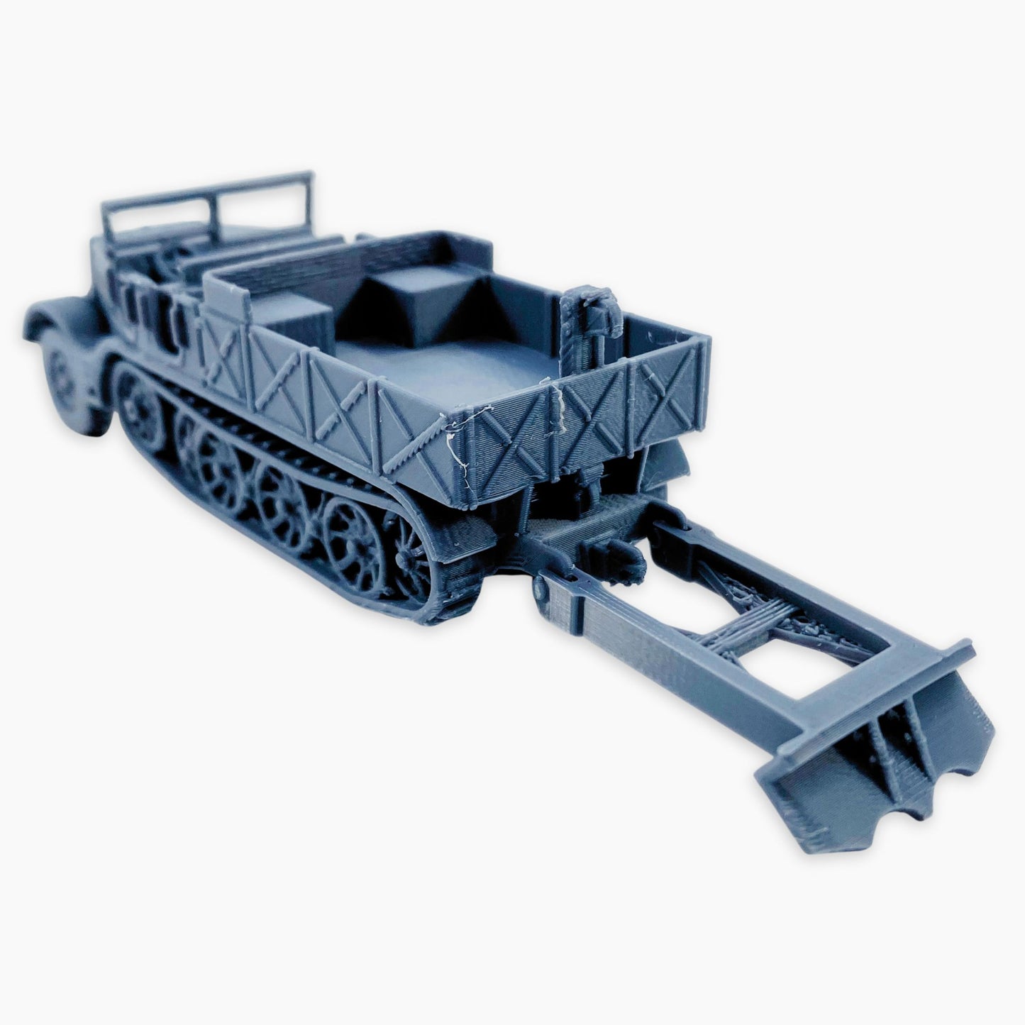 The Sd.Kfz. 9 Famo (windows up spade) miniature represents a German World War II heavy recovery half-track equipped with a spade stabilizer and its cab windows raised. This configuration improved crew comfort and protection while using the rear spade to anchor the vehicle during heavy towing or recovery operations.