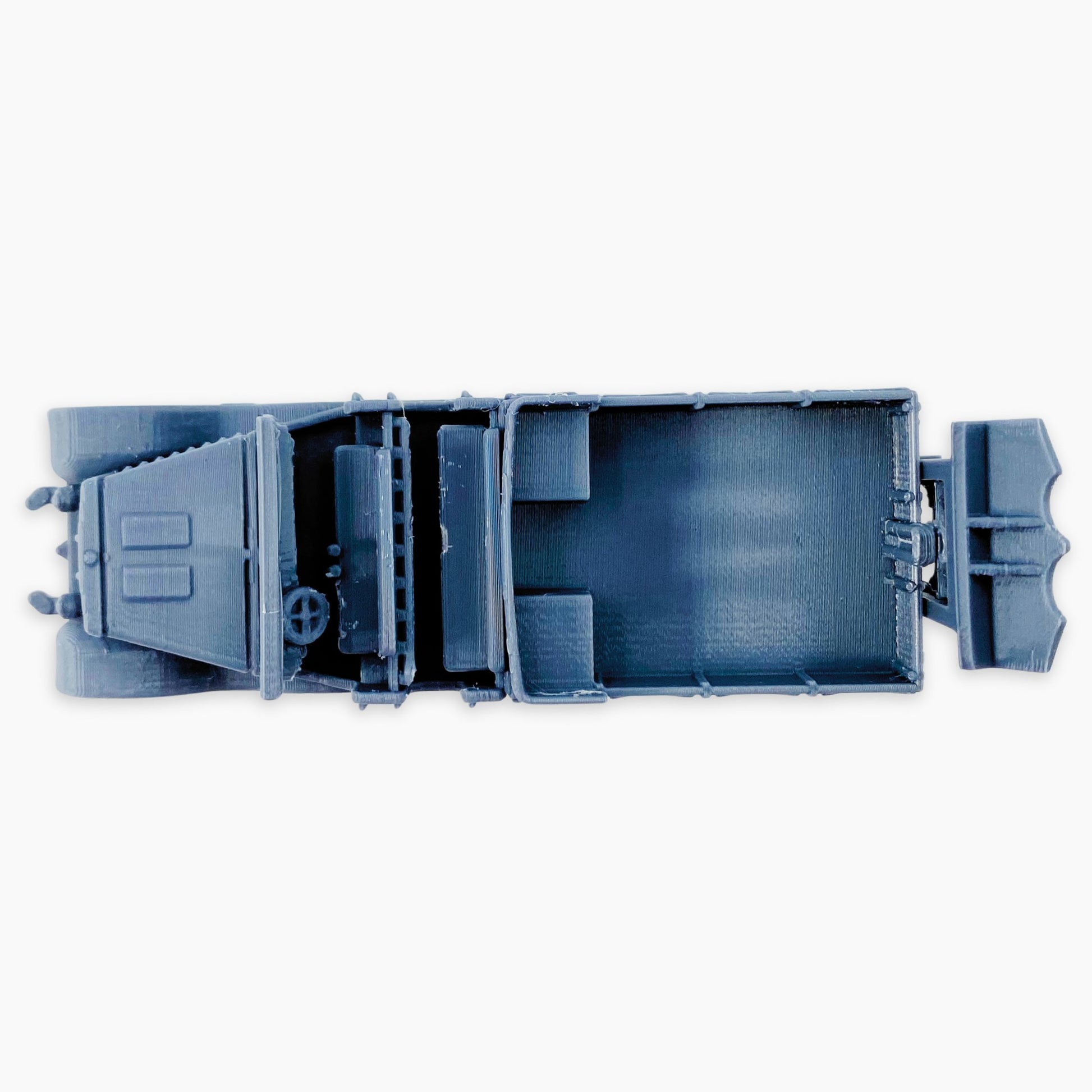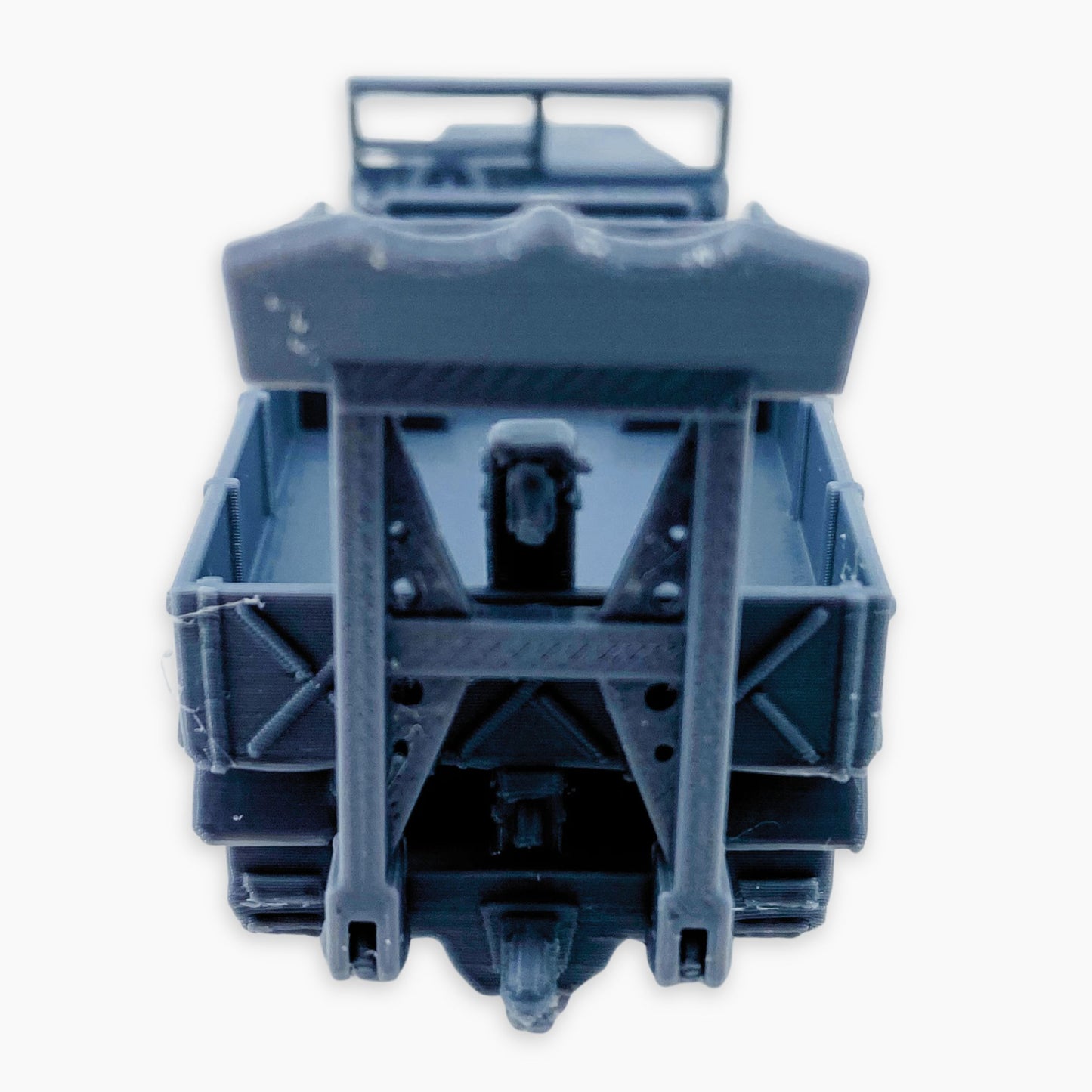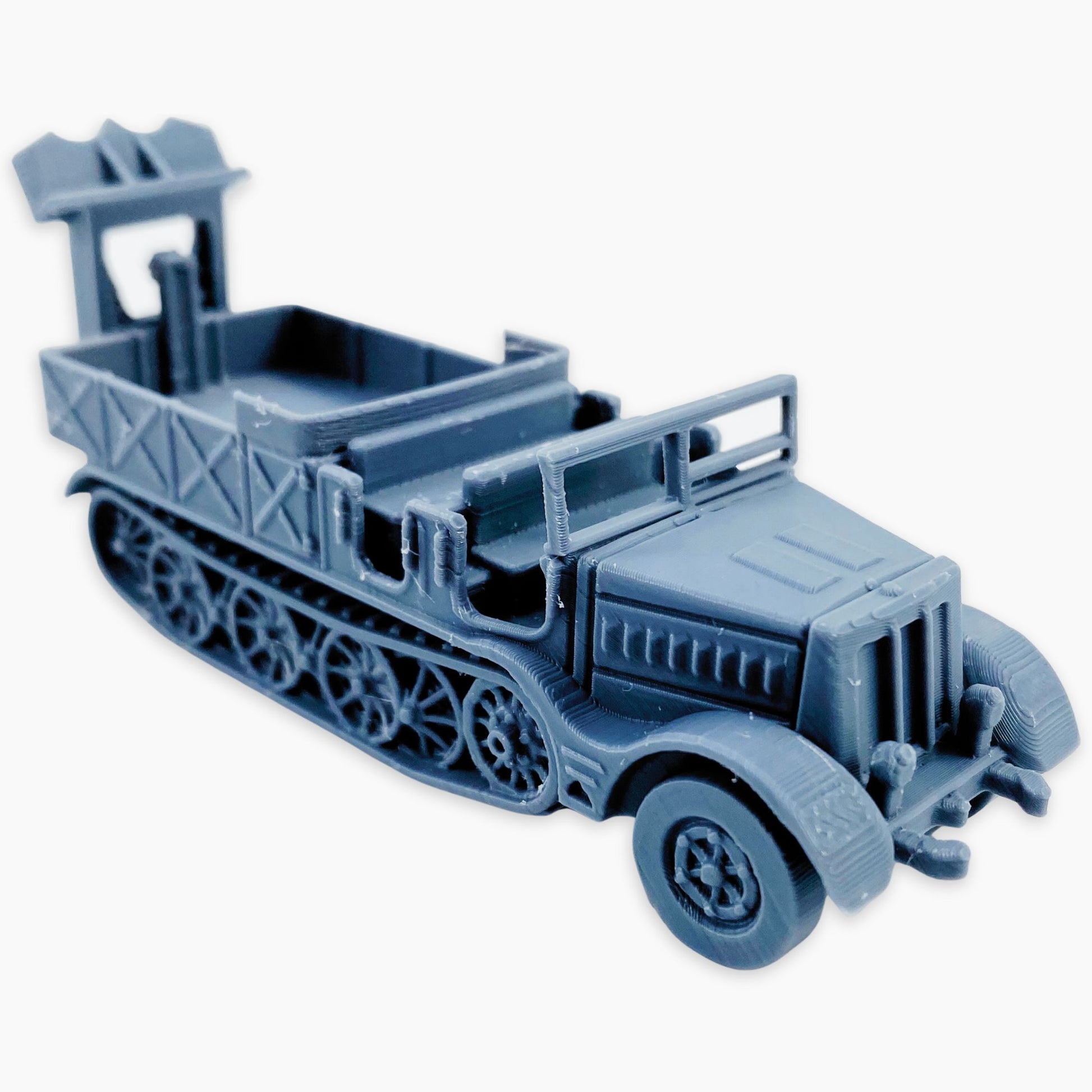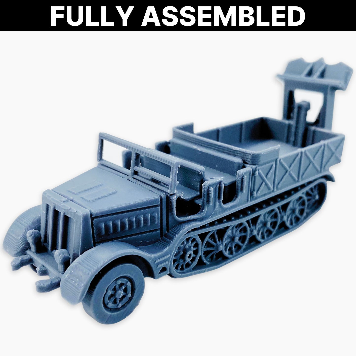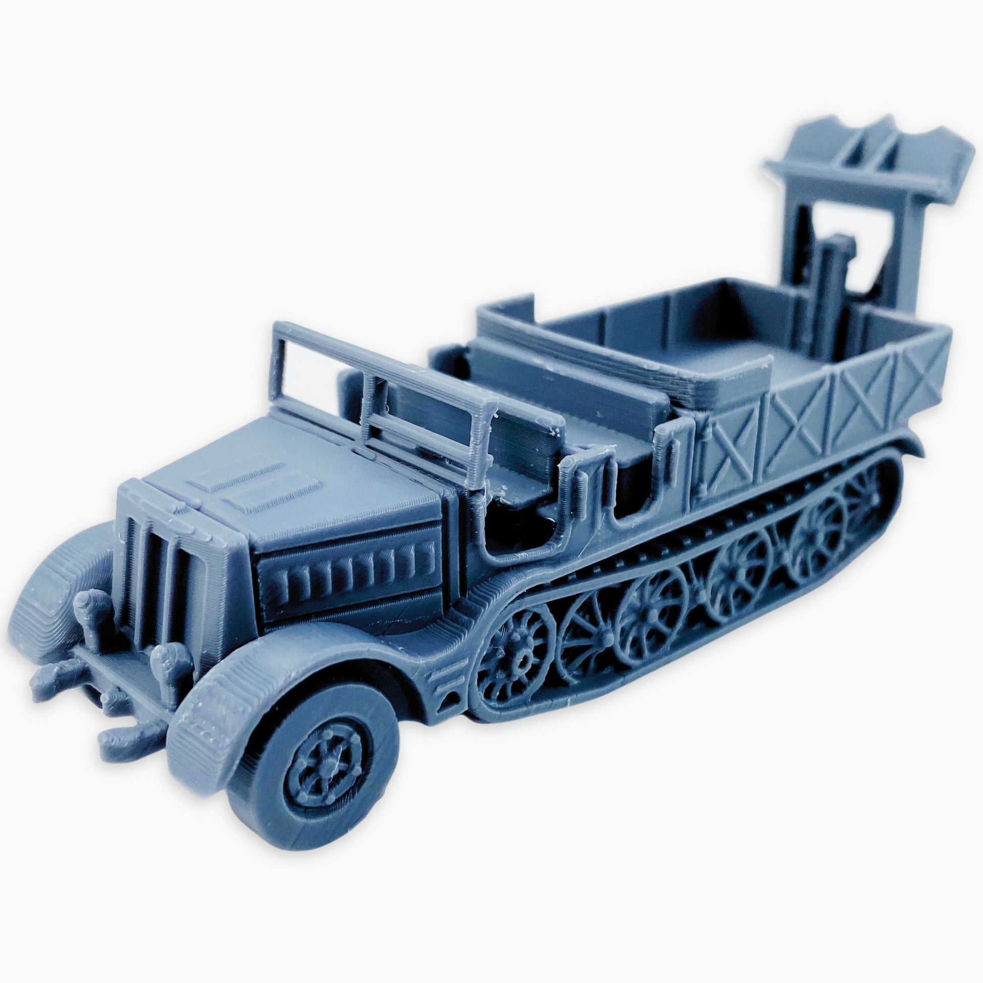 The Sd.Kfz. 9 Famo (windows up spade) miniature represents a German World War II heavy recovery half-track equipped with a spade stabilizer and its cab windows raised. This configuration improved crew comfort and protection while using the rear spade to anchor the vehicle during heavy towing or recovery operations.