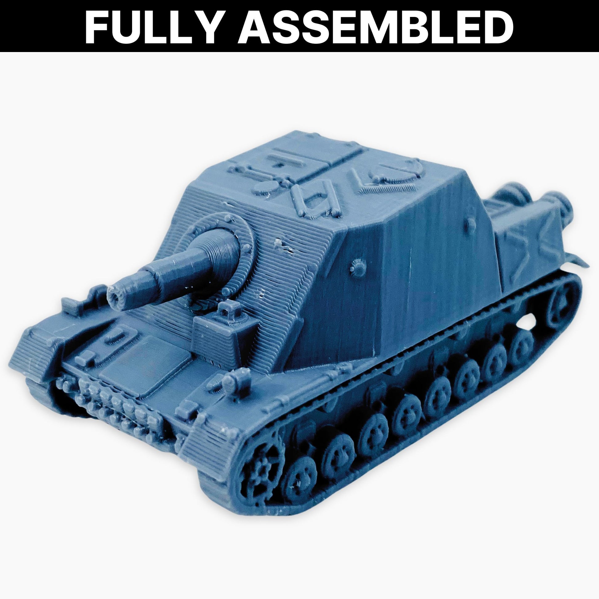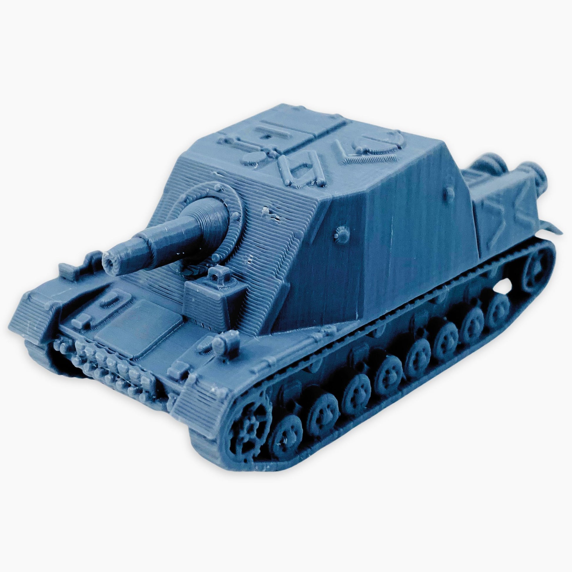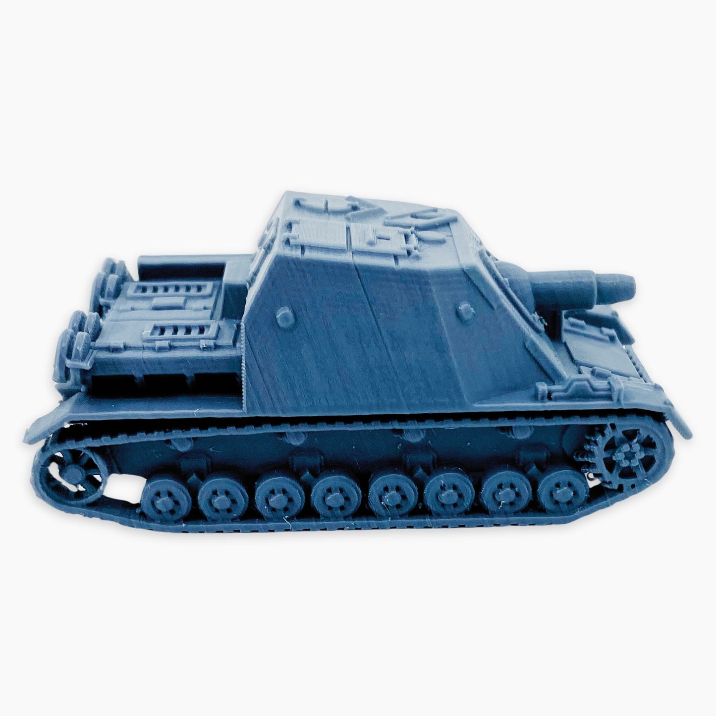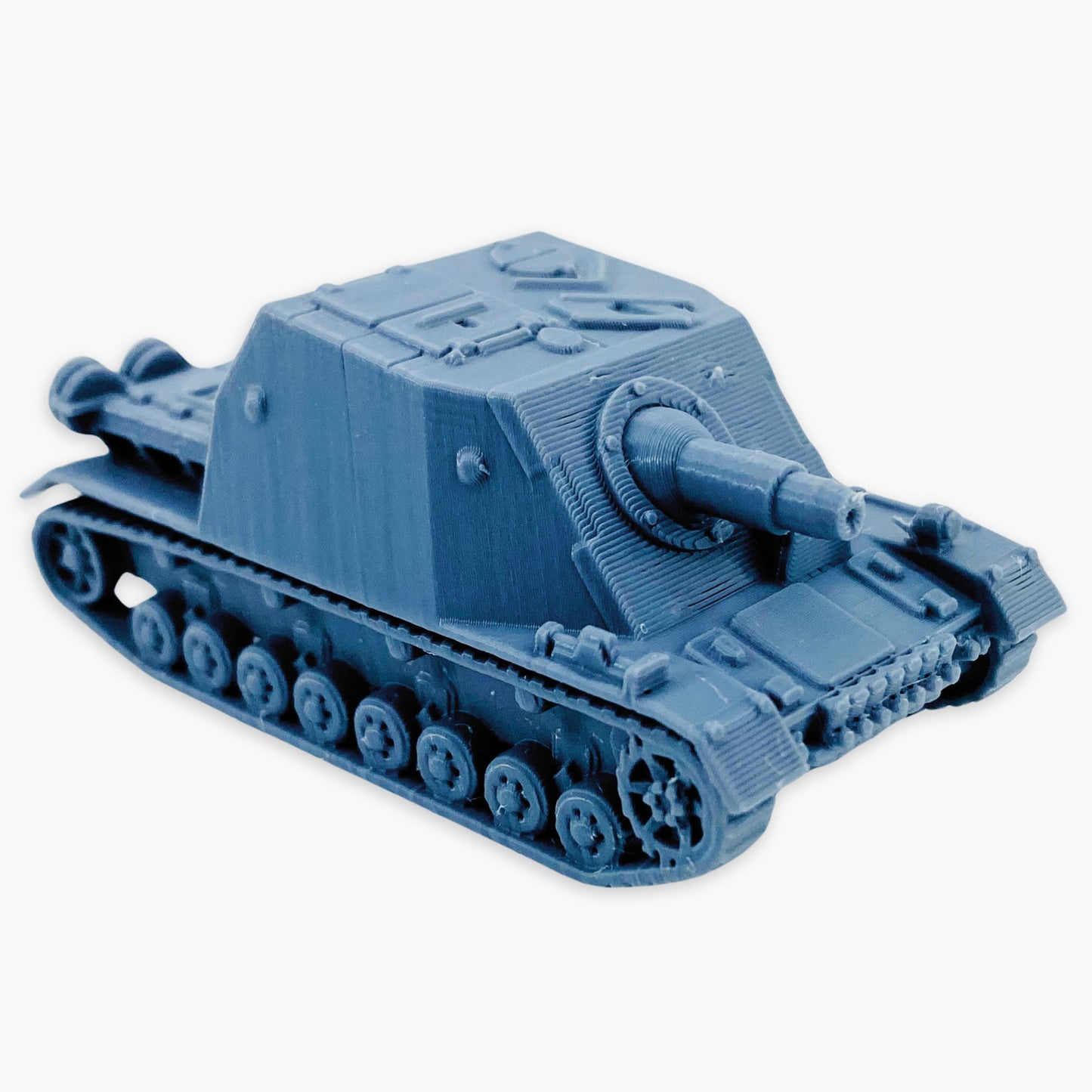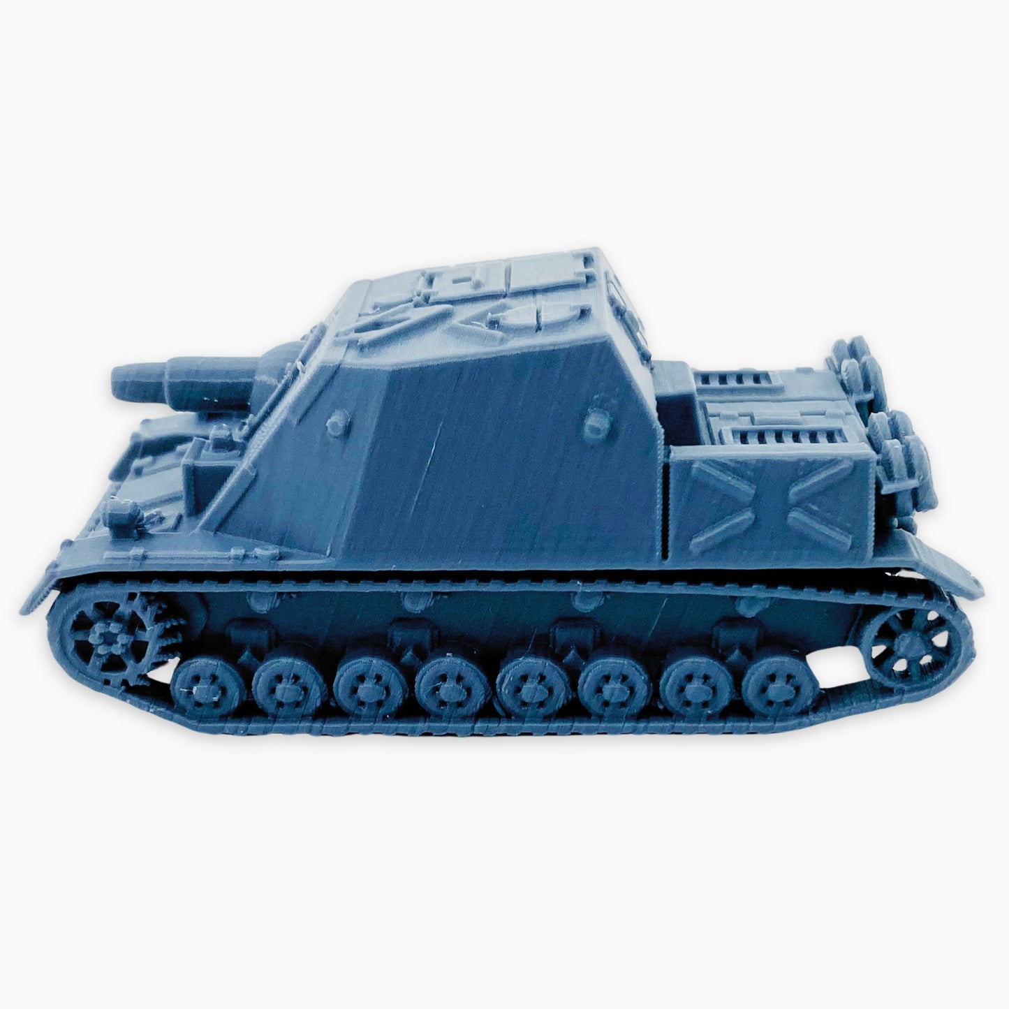 The Sturmpanzer IV Brummbär miniature depicts a German assault gun used during World War II, built on the Panzer IV chassis. It featured a heavily armored superstructure and was armed with a 150mm howitzer, designed for urban combat and infantry support. Its role was to destroy fortified positions and buildings during assaults.