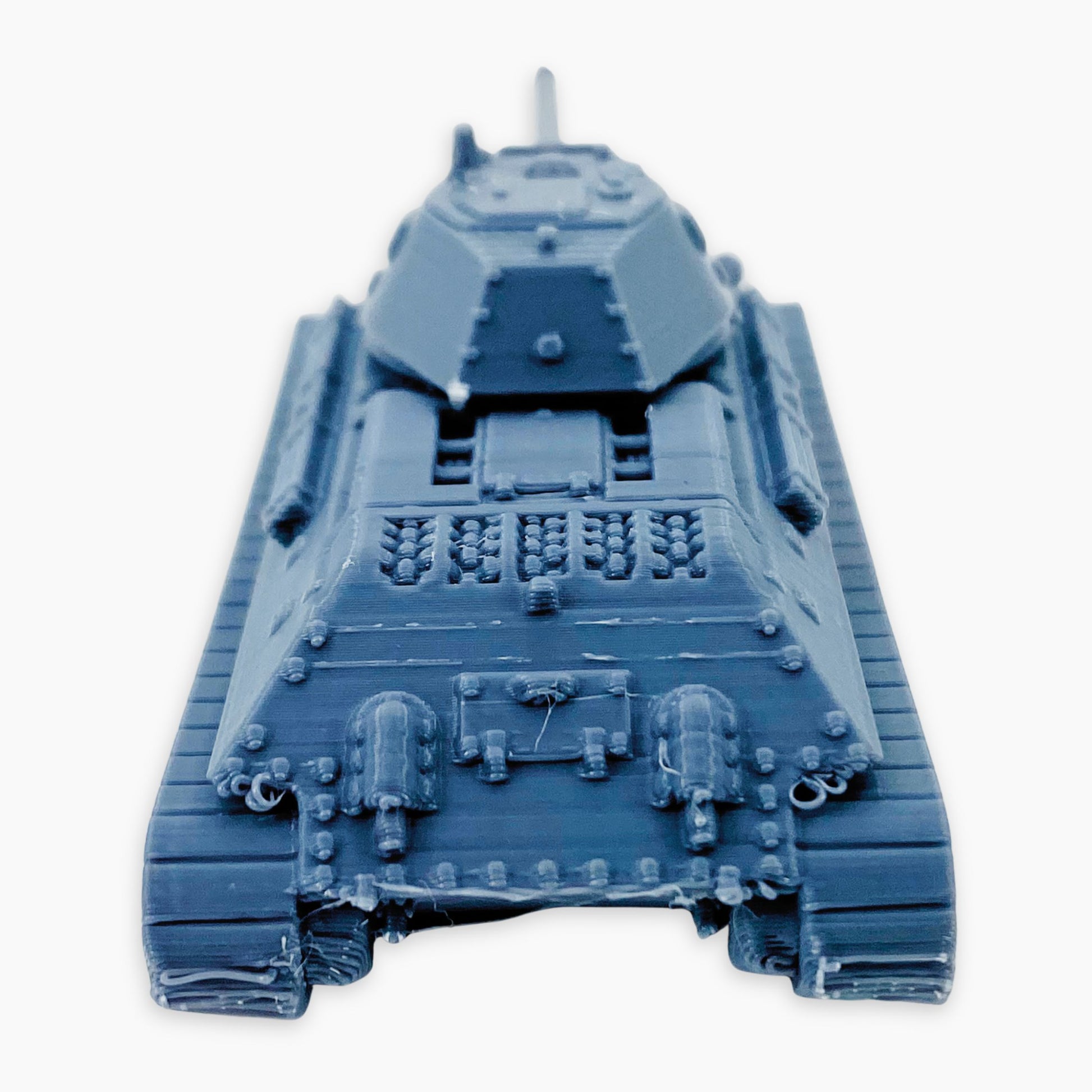 T-34/76 Model 1941 (no mudguards) miniature, depicting the Soviet medium tank in a stripped-down field configuration without its standard fender mudguards. This detail highlights a common battlefield appearance, as mudguards were often removed or damaged during prolonged operations. Armed with the 76.2 mm F-34 gun and featuring improved armor compared to the 1940 model, the T-34/76 Model 1941 was one of the Red Army’s most important tanks in the early years of World War II. This variant captures the rugged, utilitarian look of a hard-fighting vehicle and is a perfect addition to WWII dioramas, wargaming scenery, or historical model collections in multiple scales.